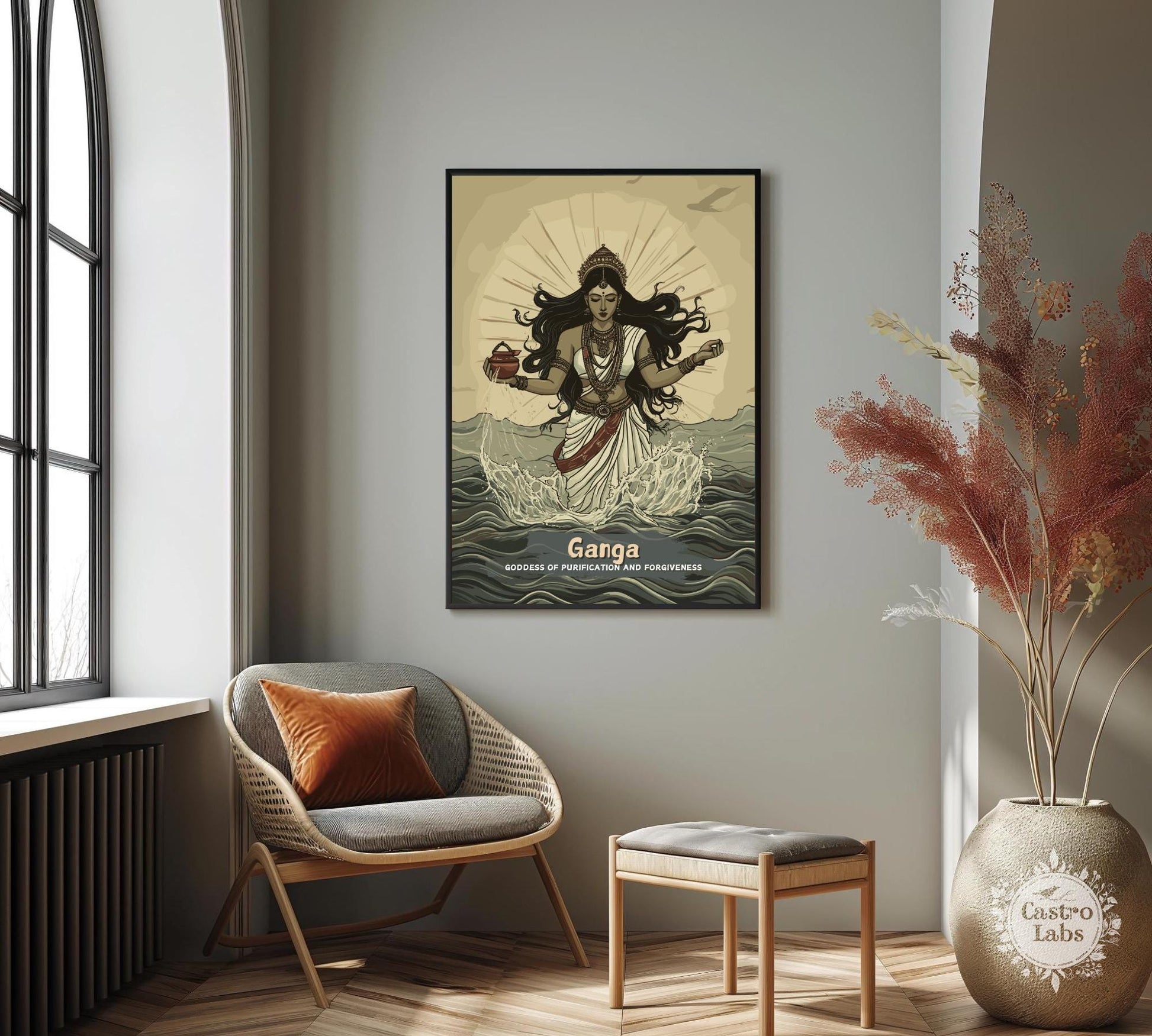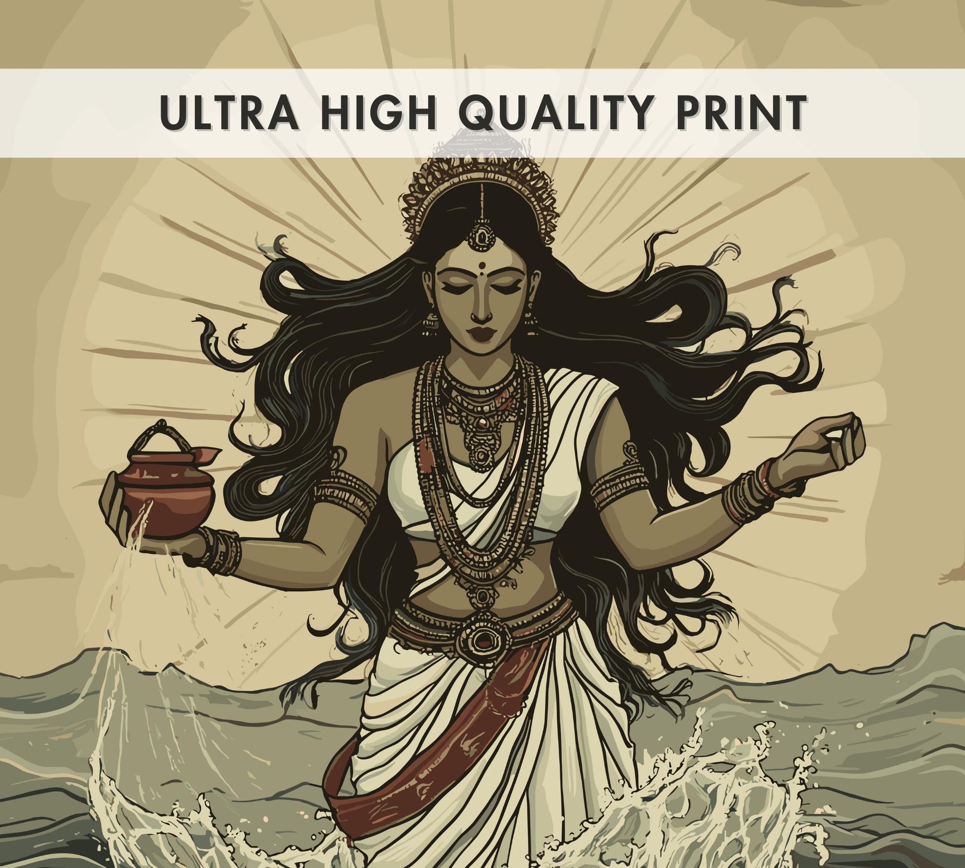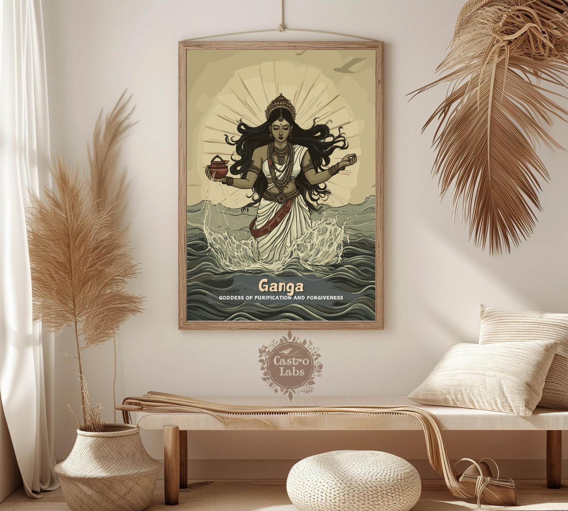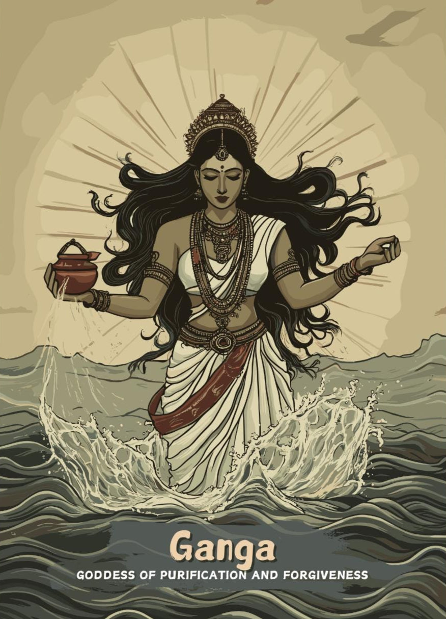 Notre affiche de la déesse hindoue Ganga – une œuvre d'art hindoue ancienne qui s'intègre parfaitement à votre intérieur grâce à son motif sacré. Parfaite pour les passionnés de mythologie et les amoureux du fleuve, elle représente Ganga, la déesse hindoue du Gange, jaillissant des cieux en vagues purificatrices. Que vous vénériez sa divinité ou que vous soyez amateur d'art intemporel, cette affiche hindoue Ganga apportera une touche de sérénité à votre décoration.