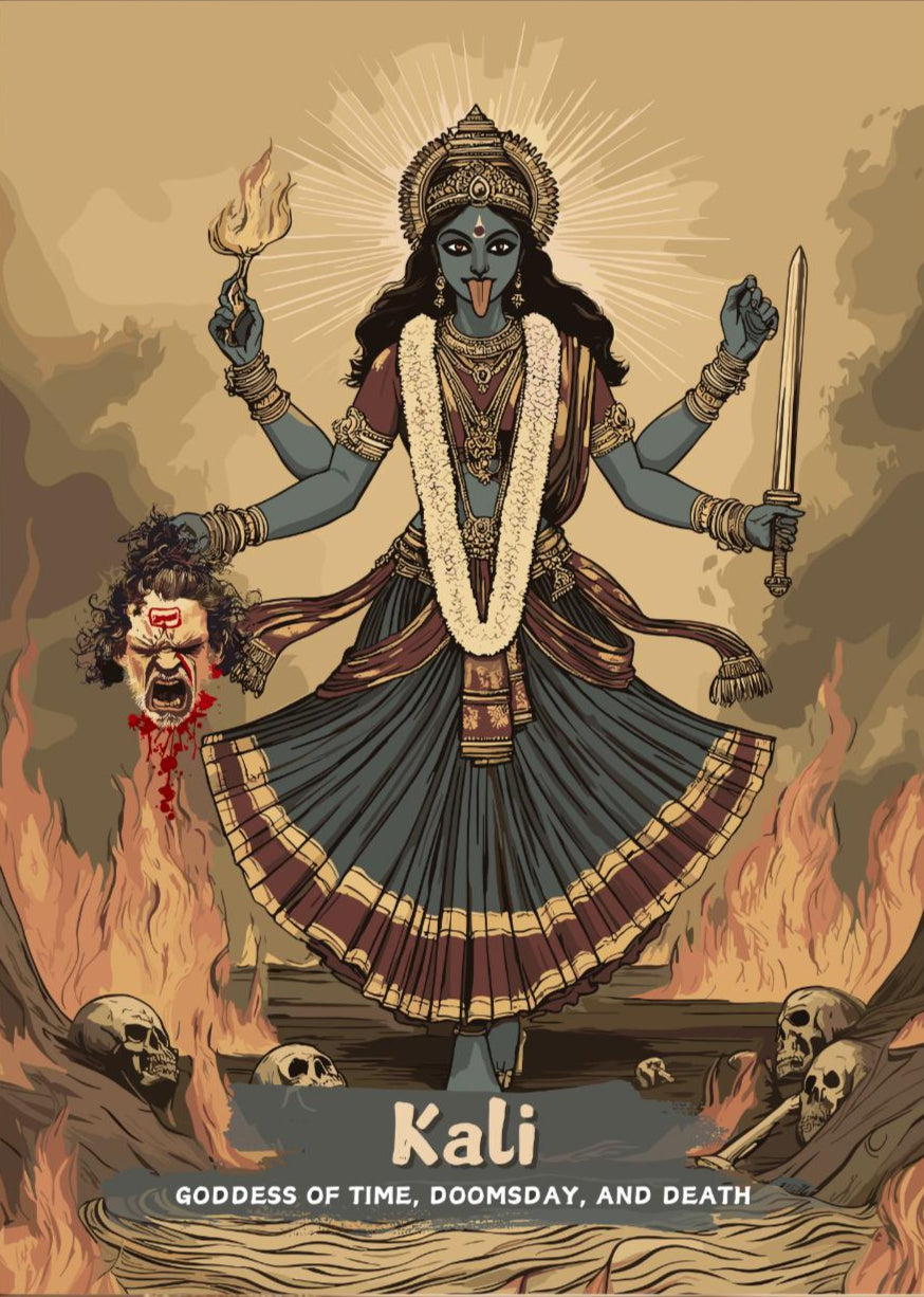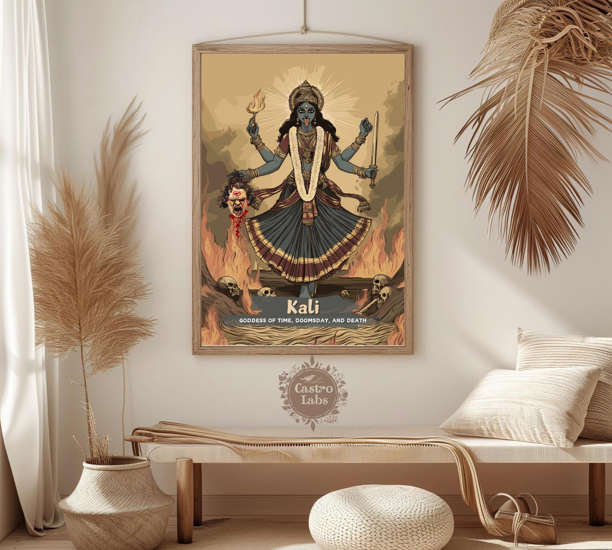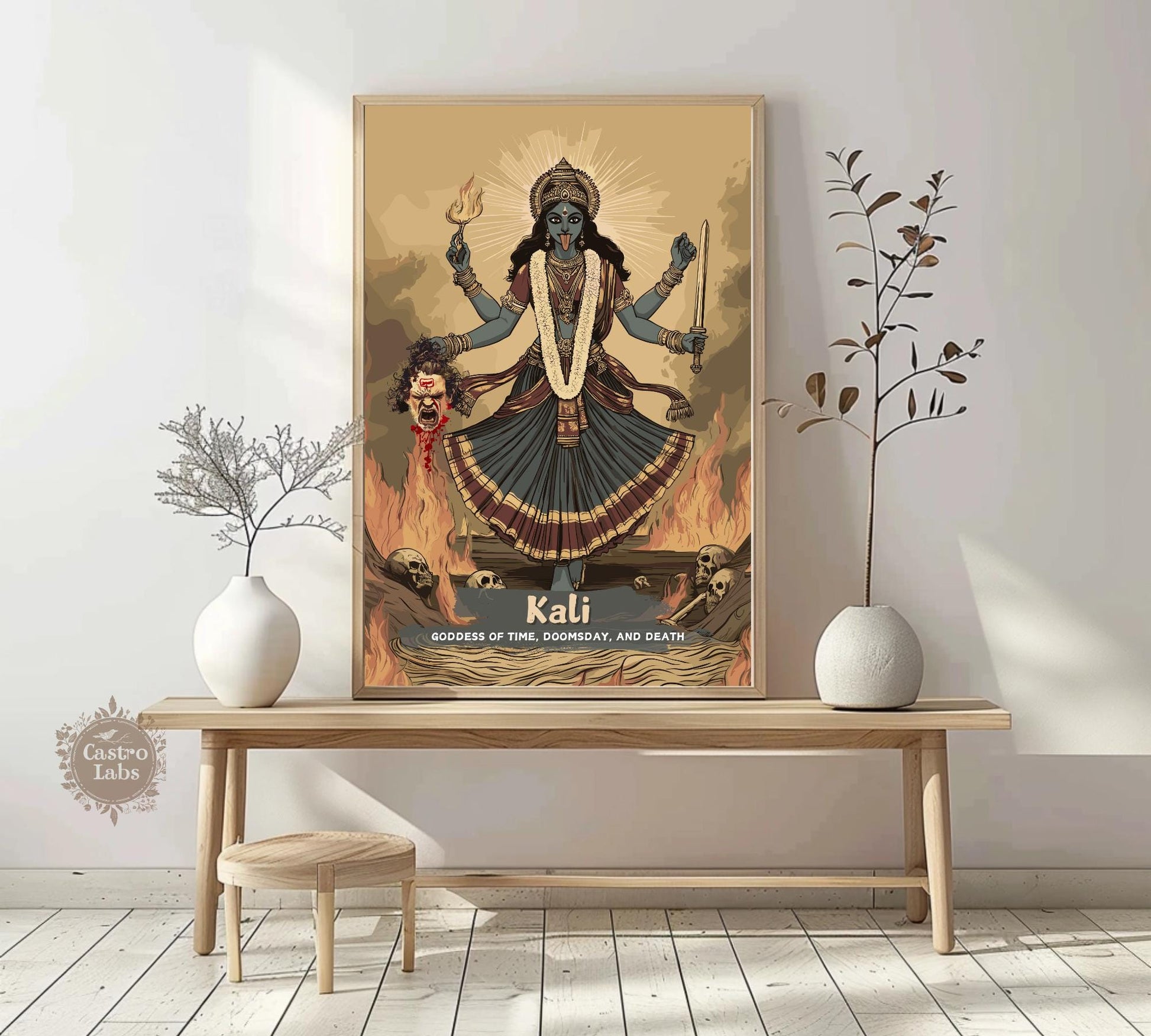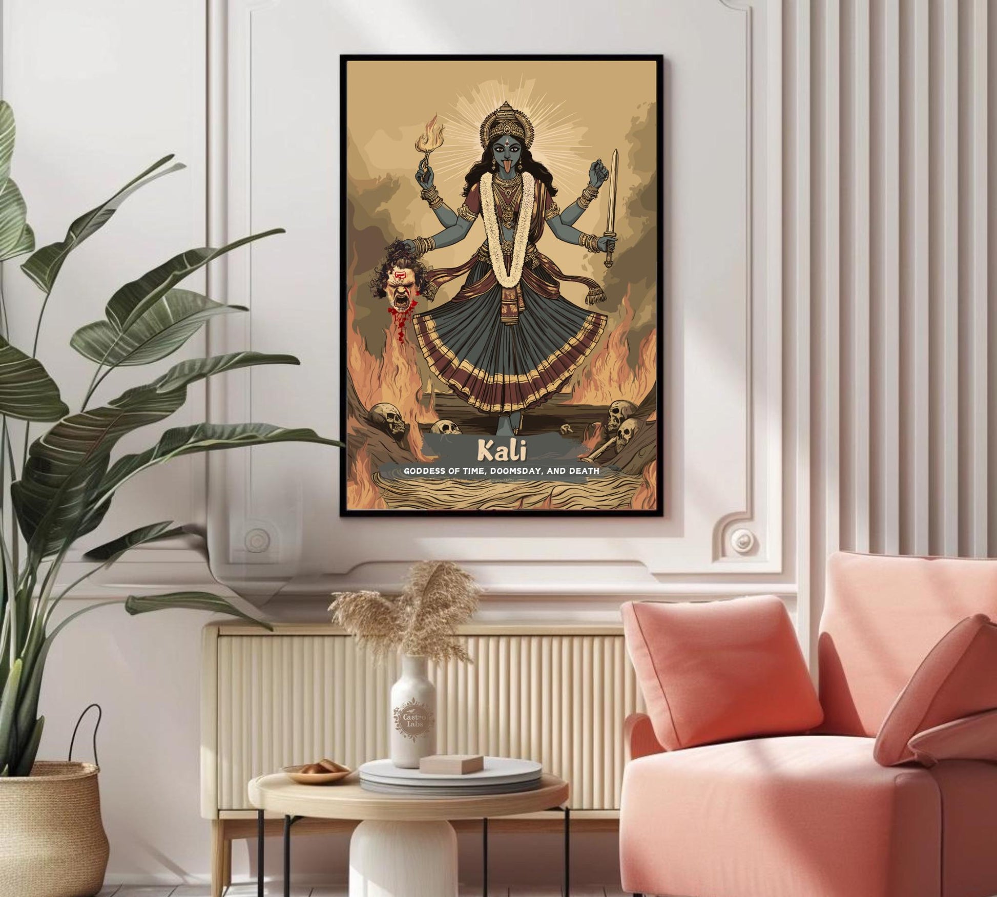 Notre affiche de la déesse hindoue Kali – L'œuvre d'art des déesses hindoues – envahit votre espace avec son design audacieux. Parfaite pour les passionnés de mythologie et les personnes en quête de transformation, elle représente Kali, la déesse hindoue de la destruction et du renouveau, dansant avec sa guirlande de crânes, débordant de puissance. Que vous honoriez sa puissance ou que vous aimiez l'art audacieux, cette affiche des déesses Kali sera un ajout saisissant à votre décoration.