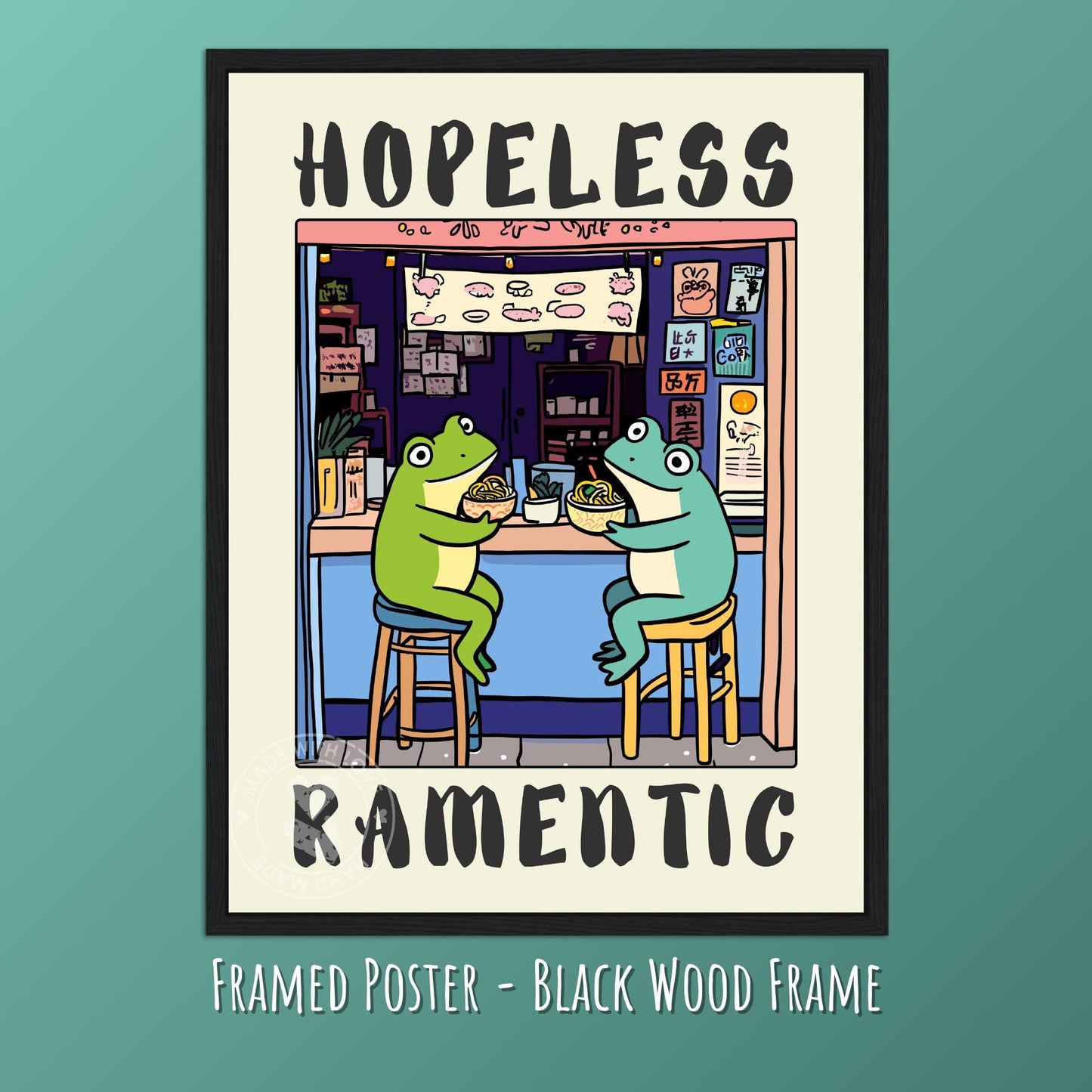 Cette affiche « Hopeless Ramentic » met en scène un adorable couple de grenouilles partageant un bol de ramen avec une touche sucrée. Avec son design ludique et adorable, elle montre ces grenouilles en train de savourer des nouilles ensemble, pleines de charme.