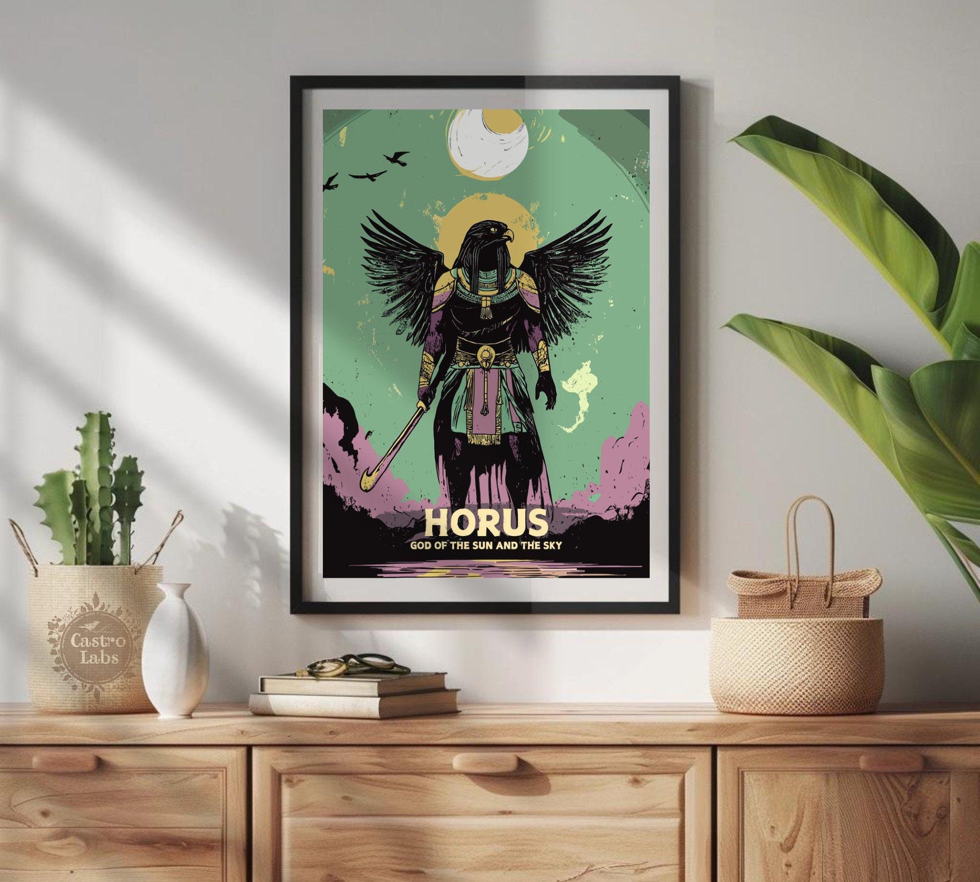Notre affiche du dieu Horus – Égypte antique – illumine votre intérieur avec son design vigilant. Parfaite pour les passionnés de mythologie et d'histoire, elle représente Horus, le dieu égyptien du ciel et de la royauté, avec sa tête de faucon contemplant un désert ensoleillé. Que vous vénériez sa protection ou que vous soyez amateur d'art ancien, cette affiche Horus Égypte sera un ajout saisissant à votre décoration.