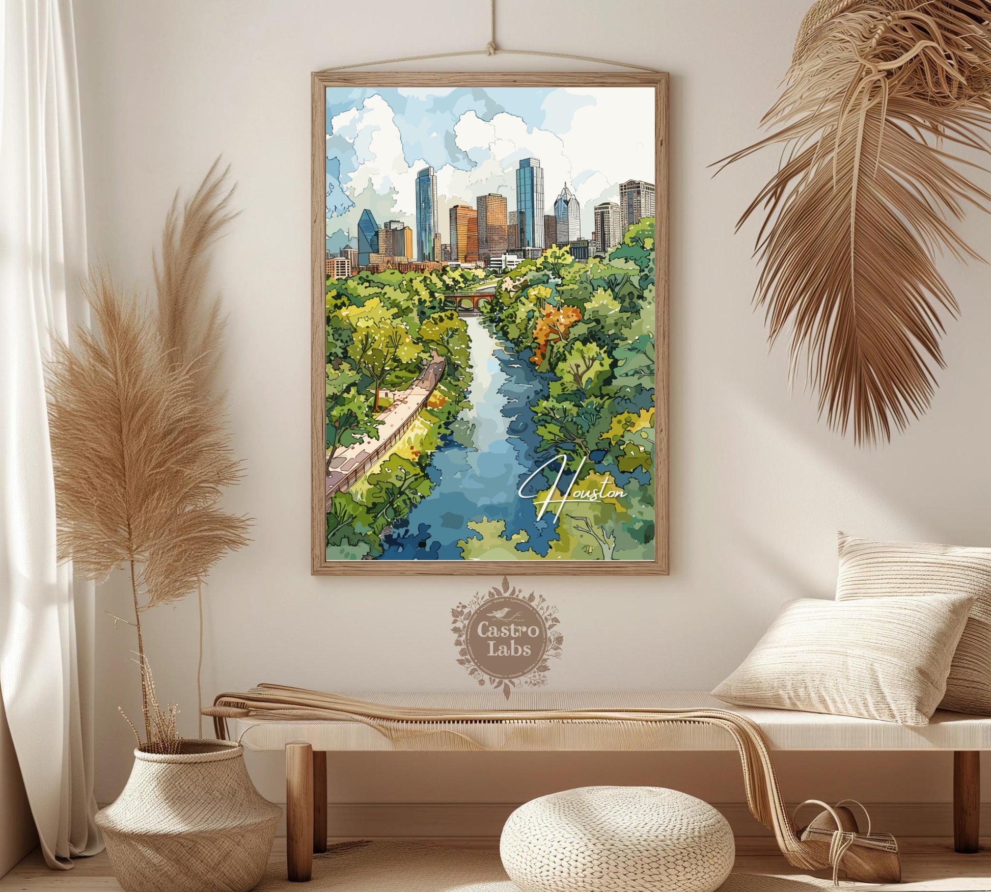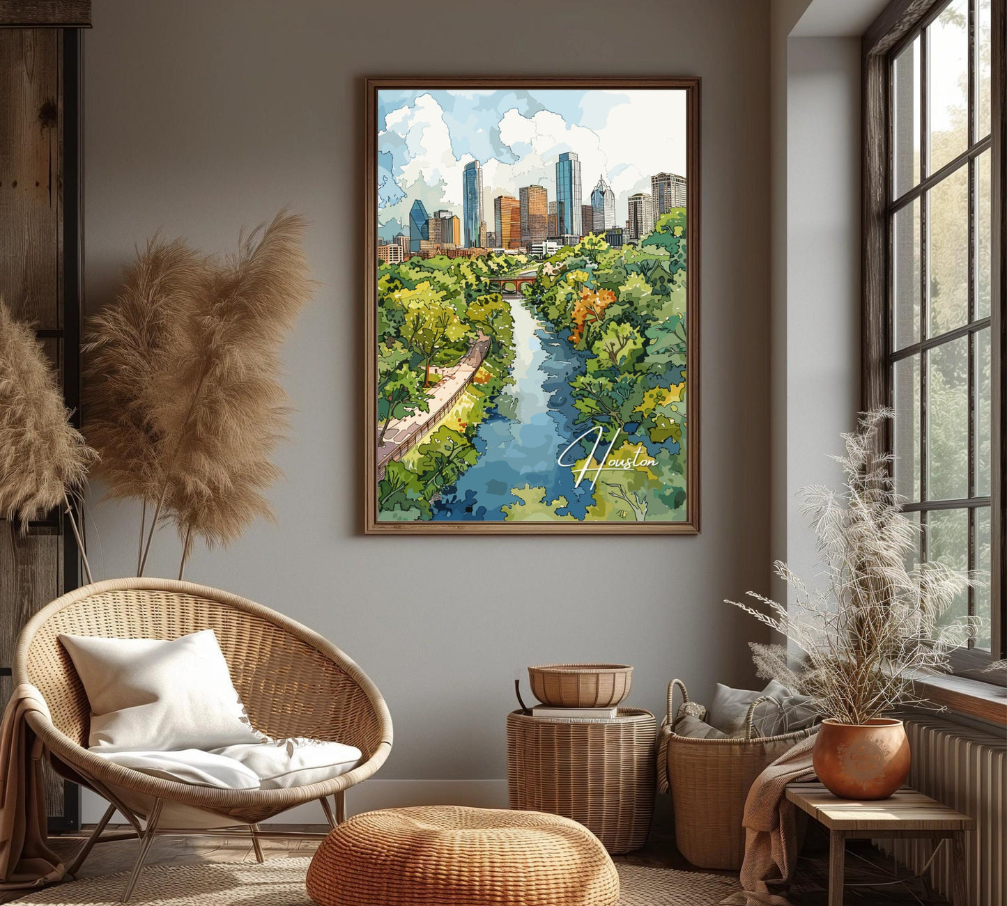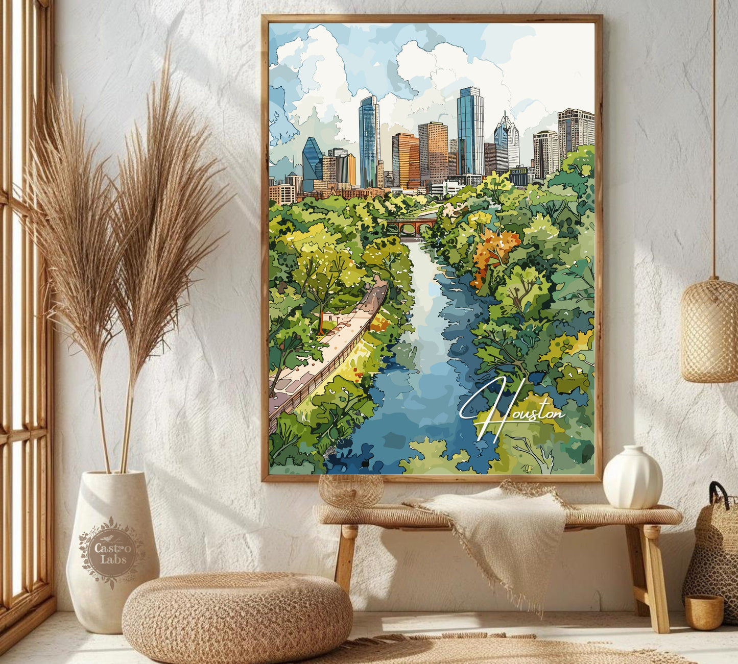 Apportez le charme et le dynamisme de Houston à vos murs avec notre aquarelle . Cette affiche texane capture la skyline emblématique de la ville, ses monuments et son atmosphère urbaine dynamique dans un style aquarelle délicat. Parfaite pour les citadins, les voyageurs et les amateurs de décoration artistique. Apportez une touche élégante et colorée à votre salon, bureau ou mur d'images.