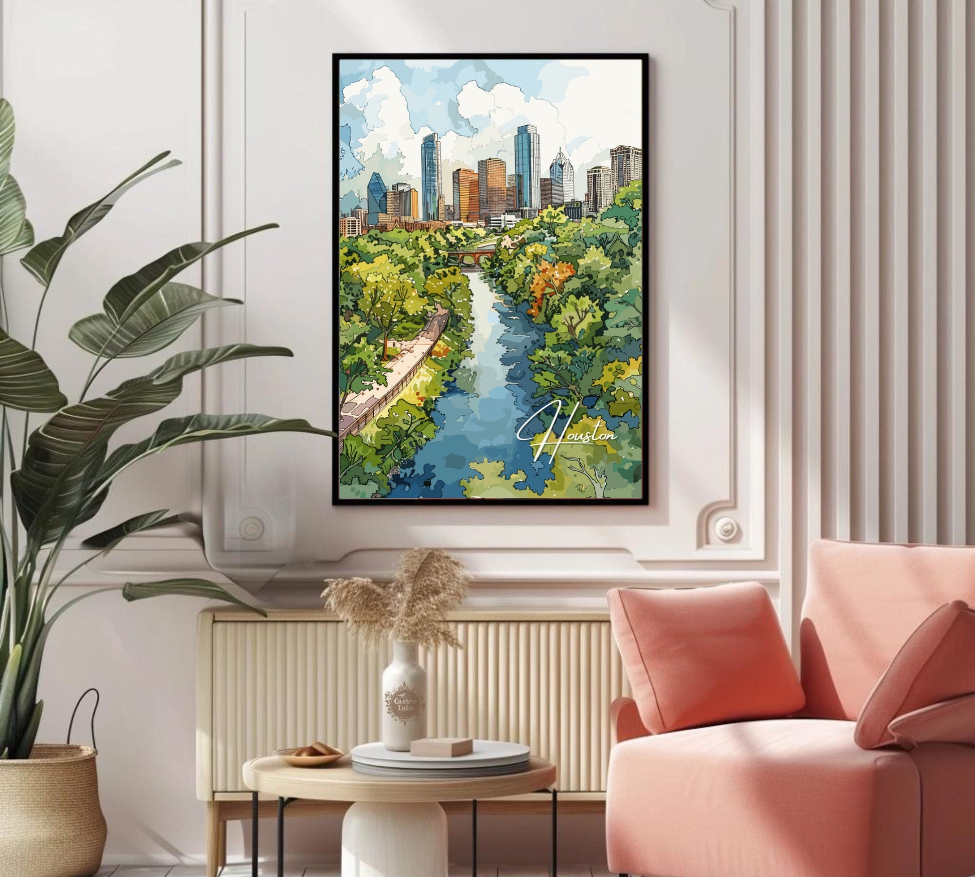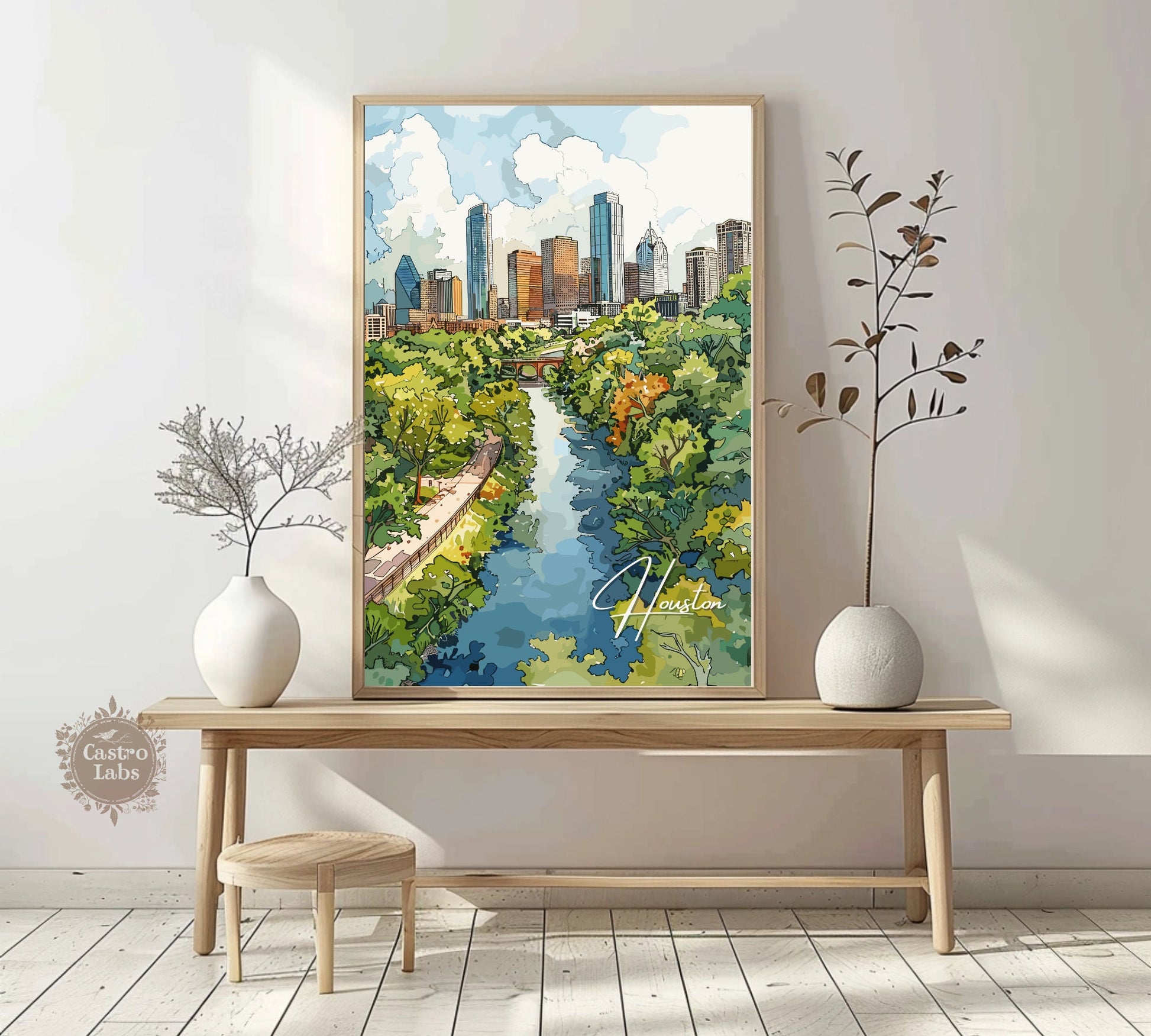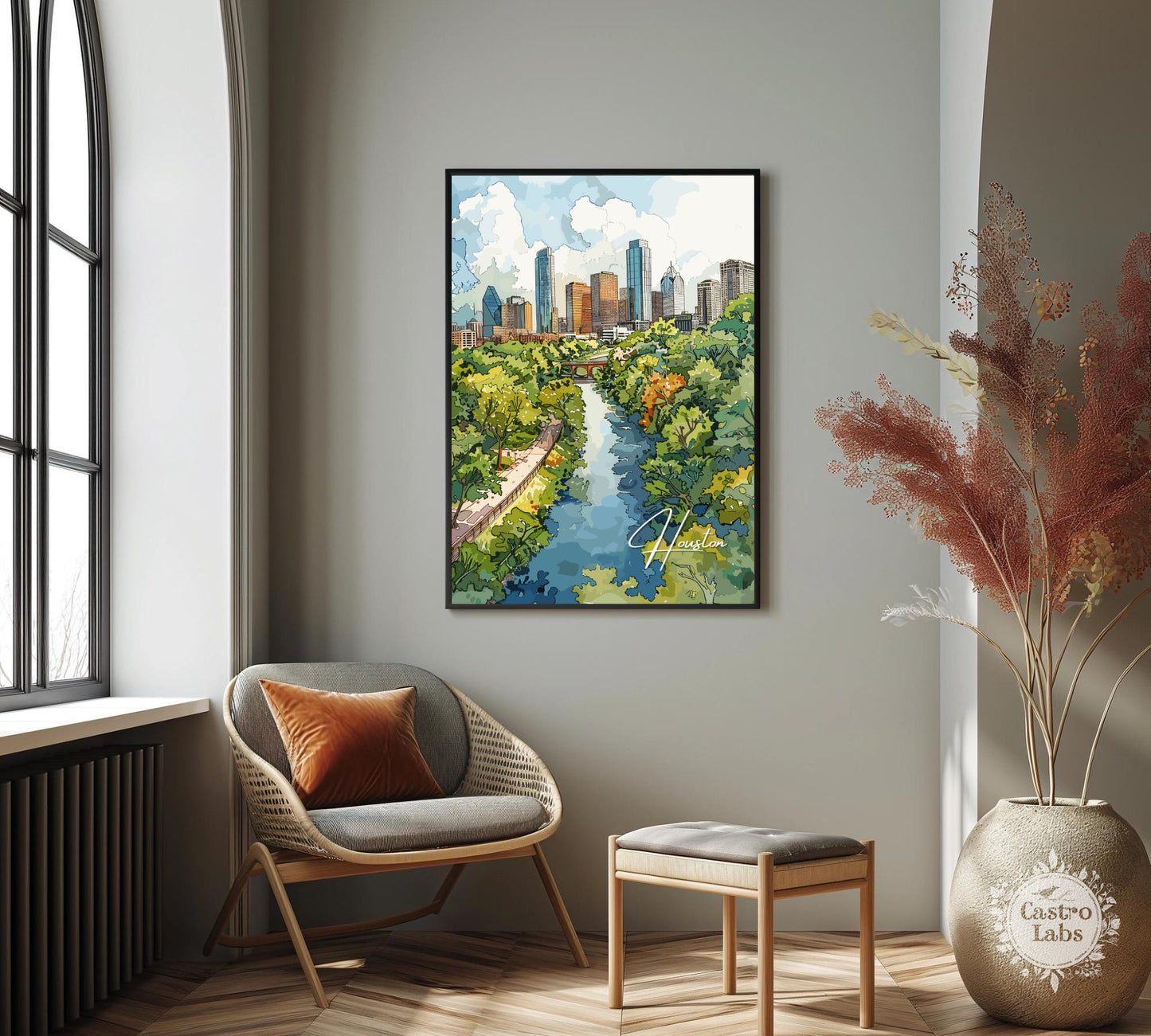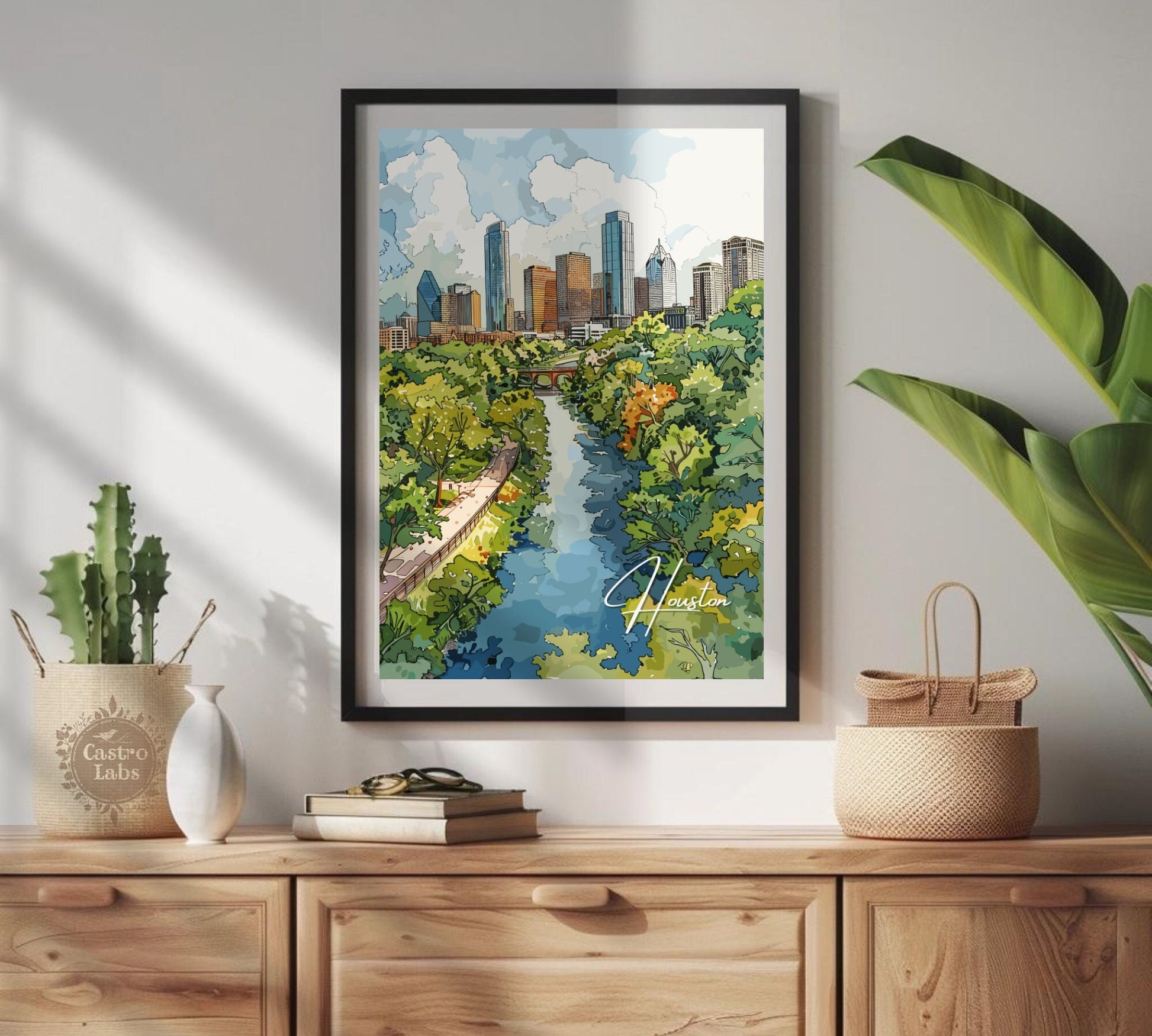 Apportez le charme et le dynamisme de Houston à vos murs avec notre aquarelle . Cette affiche texane capture la skyline emblématique de la ville, ses monuments et son atmosphère urbaine dynamique dans un style aquarelle délicat. Parfaite pour les citadins, les voyageurs et les amateurs de décoration artistique. Apportez une touche élégante et colorée à votre salon, bureau ou mur d'images.