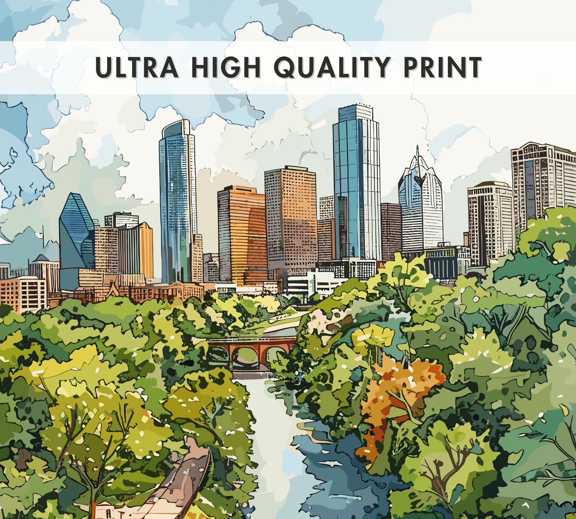 Disponible en téléchargement numérique et en tirage physique premium , cette aquarelle de Houston est disponible en plusieurs formats, des formats standard de la série A aux grands formats 76 x 102 cm. Imprimée sur un papier de haute qualité aux couleurs vives et aux détails précis, elle est idéale pour décorer votre intérieur ou pour offrir à toute personne inspirée par la beauté urbaine de Houston.