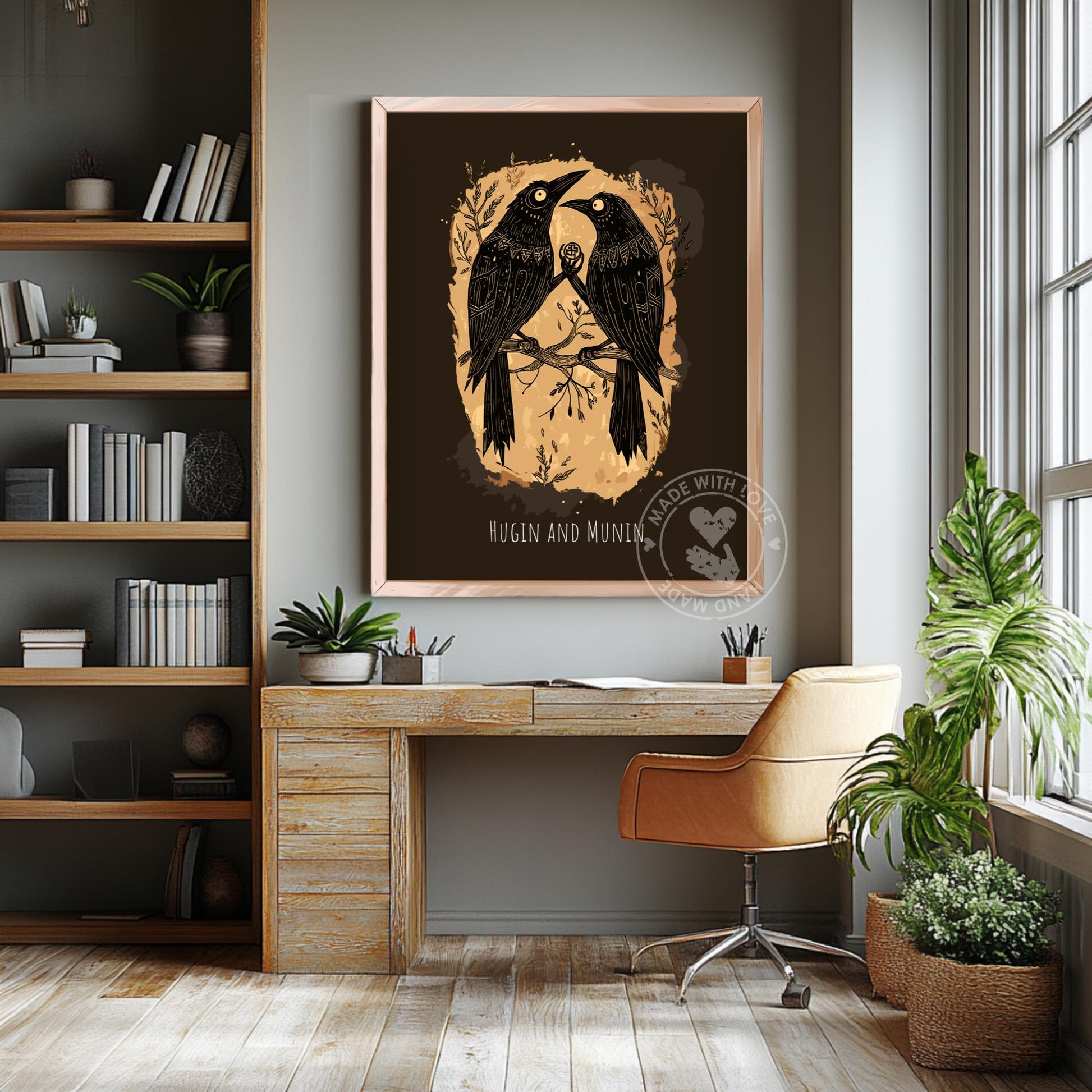 Cette affiche d'Hugin et Munin met en scène les corbeaux d'Odin perchés, le regard perçant, les ailes déployées dans un vol sombre. Elle capture Hugin et Munin avec leurs regards perçants, liés à la tradition nordique vigilante du Père de Tout.