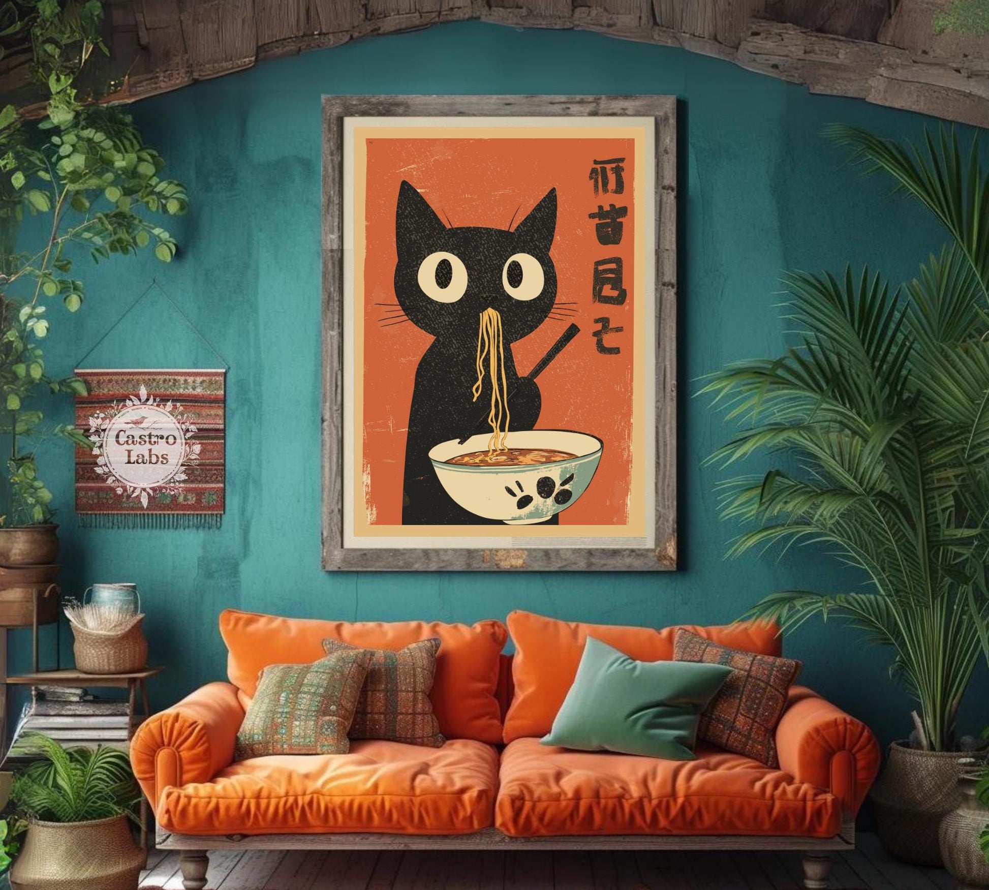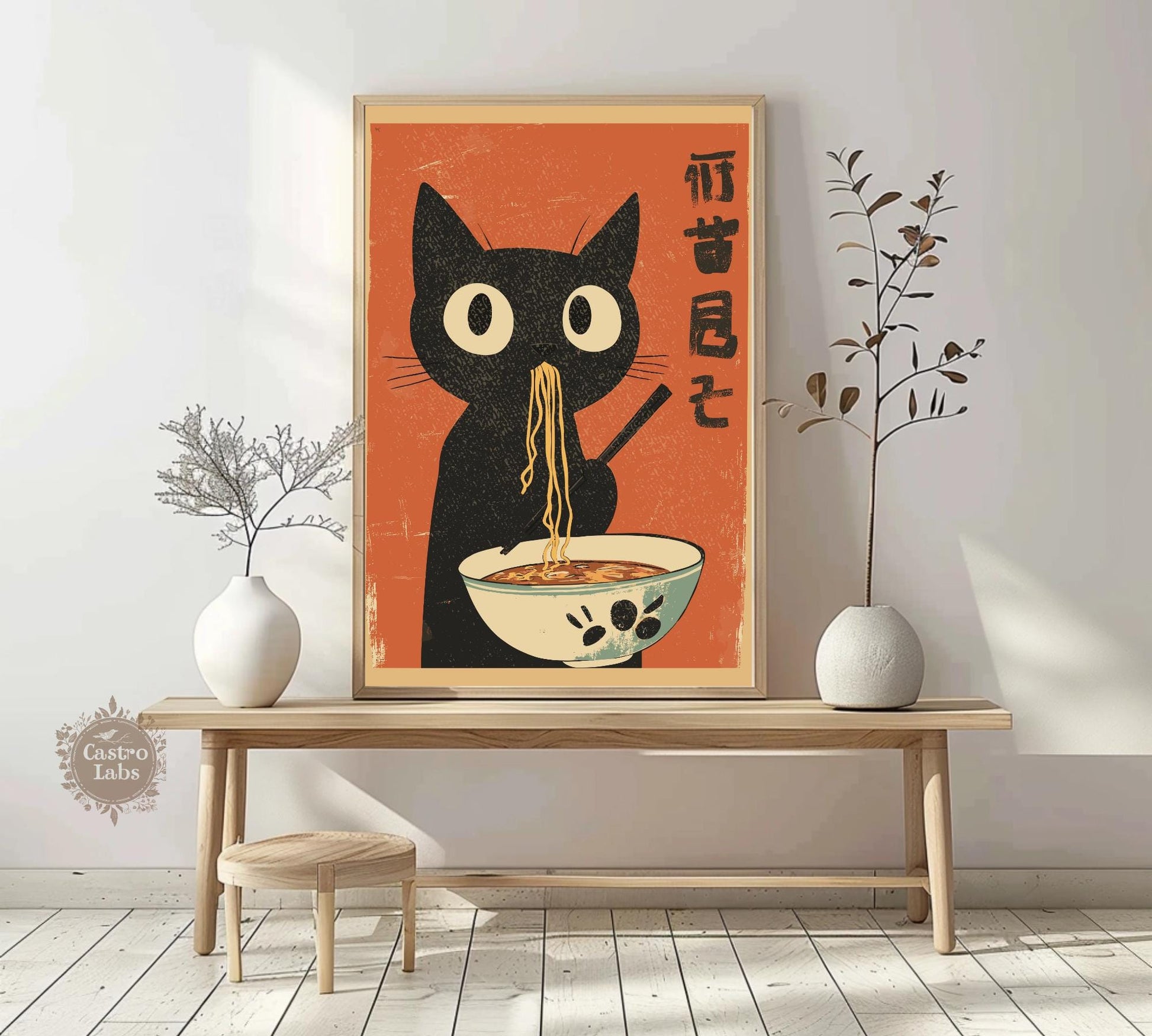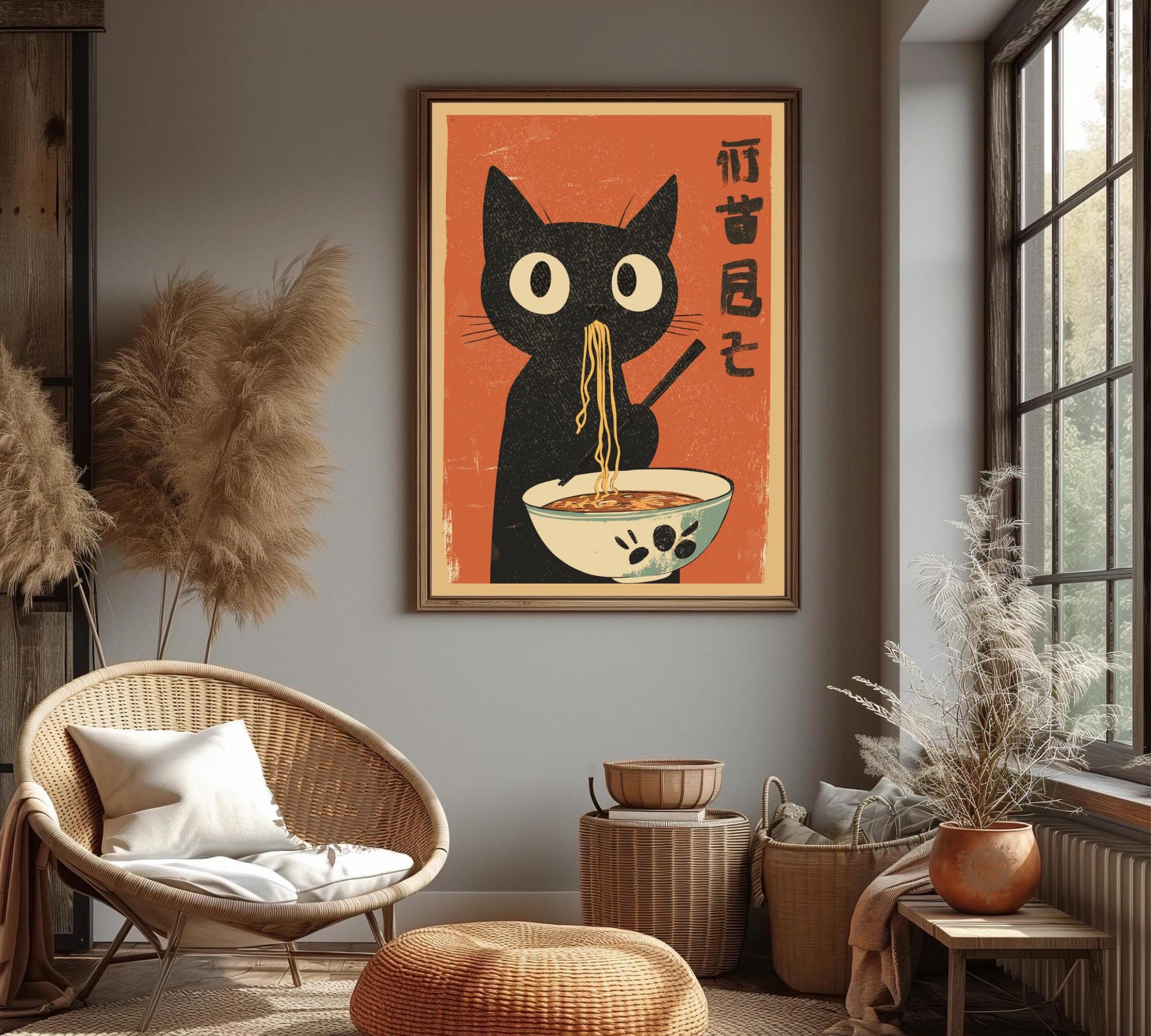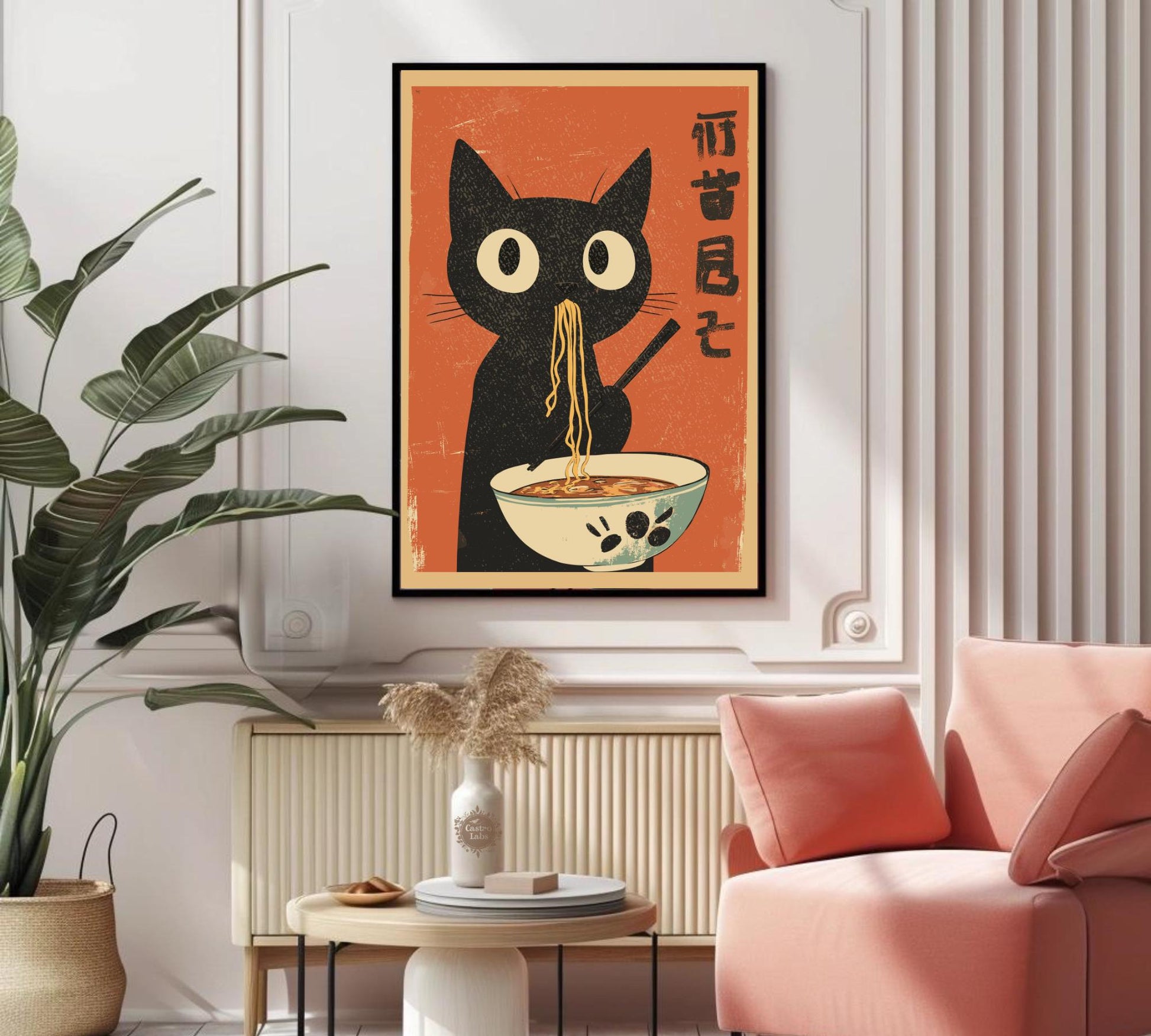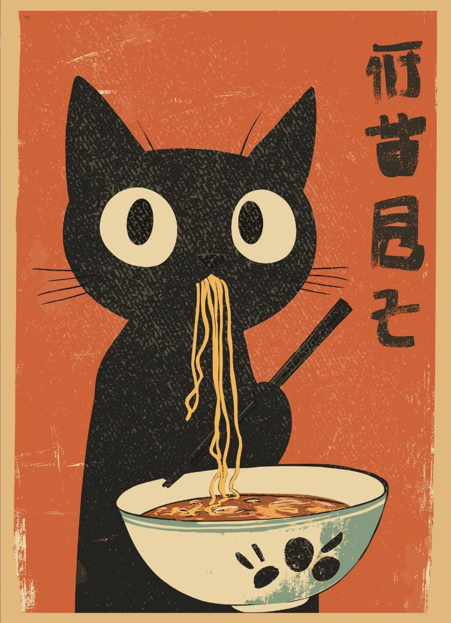 Ajoutez une touche de fantaisie à vos murs avec cette affiche « Chat affamé de ramen » , une affiche japonaise fantaisiste représentant un chat noir dévorant un bol de ramen avec appétit. Cette décoration murale amusante est parfaite pour une cuisine, un café ou une salle à manger en quête d'une touche d'humour et de personnalité.