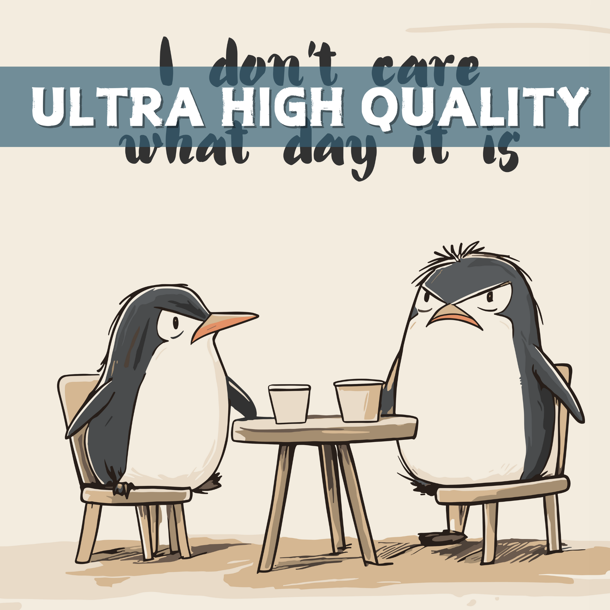 Cette affiche « Je veux du café » grogne avec deux pingouins boudeurs, affalés sur leurs tasses, avides d'une infusion. Elle dessine un couple d'oiseaux grincheux, nageoires croisées, cherchant avec horreur un coup de fouet caféiné.