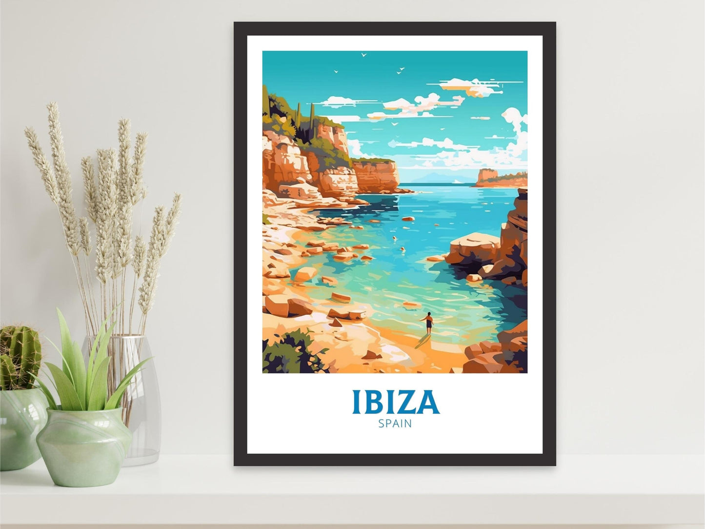 Que vous ayez déjà goûté à l'ambiance électrique d'Ibiza ou rêvé de ses eaux turquoise et de ses criques cachées, l' affiche « Ibiza Travel » fait entrer l'esprit de cette île espagnole chérie chez vous. Imprimée sur du papier de haute qualité avec des encres riches et résistantes à la décoloration, cette affiche apporte une touche dynamique et joyeuse à vos murs et à votre intérieur.