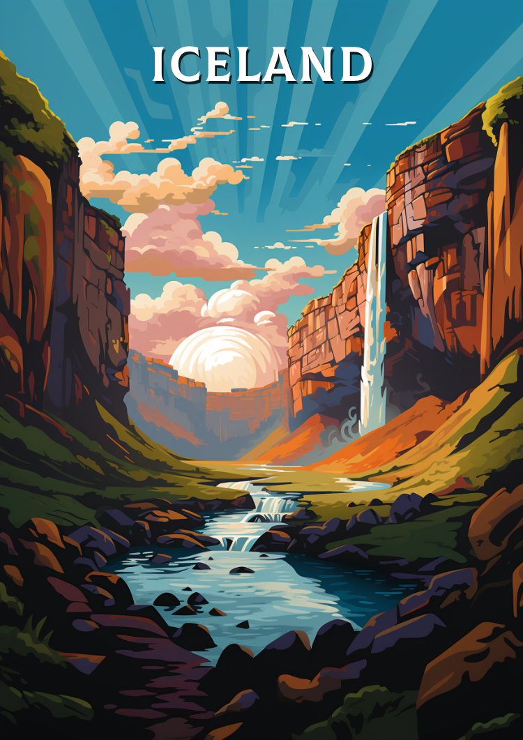 Intégrez les paysages époustouflants de l'Islande à votre intérieur grâce à notre affiche de voyage islandaise , mettant en scène une majestueuse cascade islandaise au cœur d'une nature sauvage et sauvage. Cette affiche détaillée capture la puissance brute et l'élégance sereine des eaux en cascade sur fond de nature sauvage emblématique de l'Islande. Parfaite pour les amoureux de la nature islandaise , des voyages d'aventure et des œuvres d'art murales pittoresques.