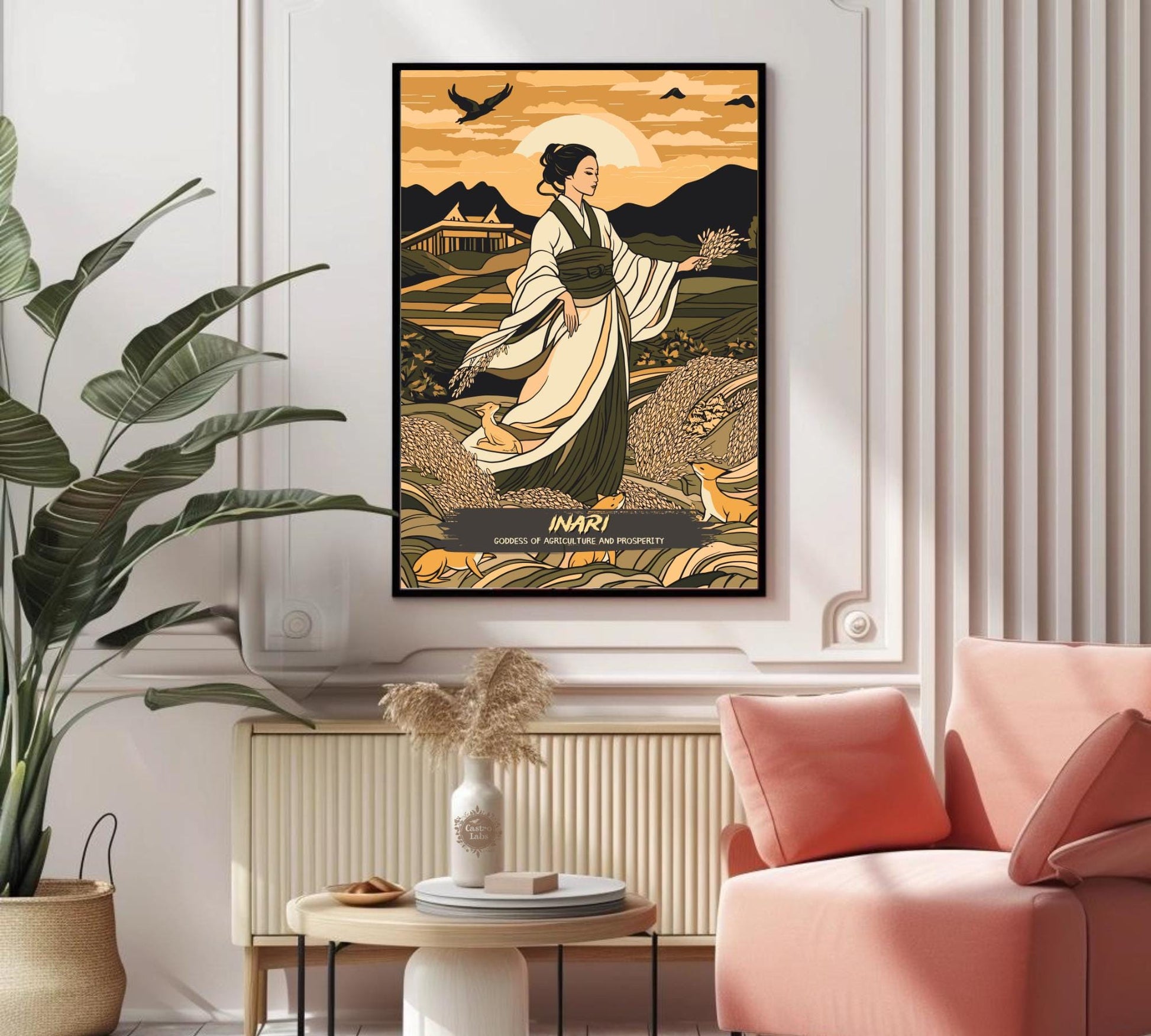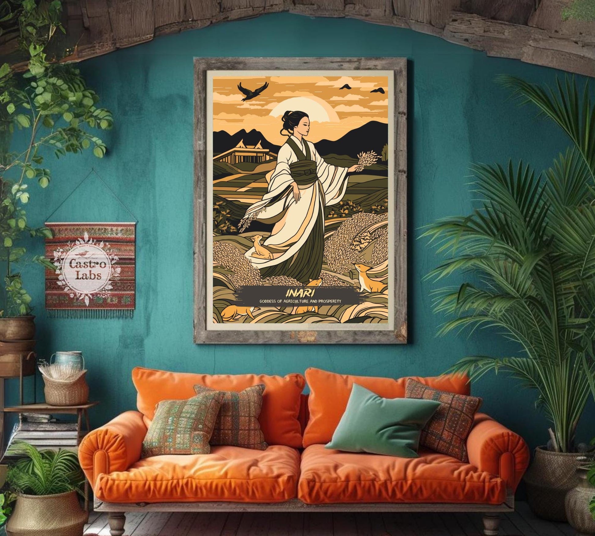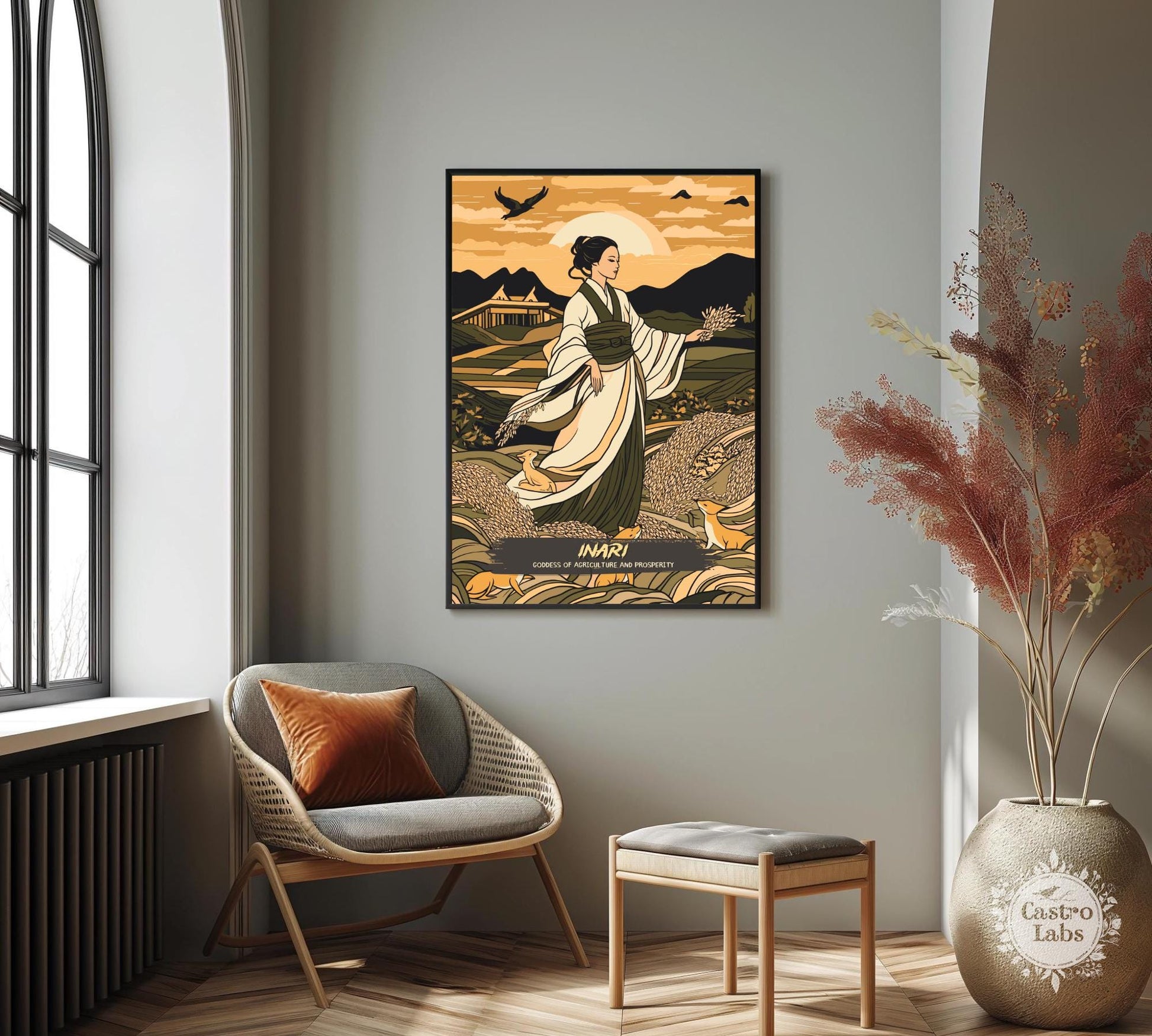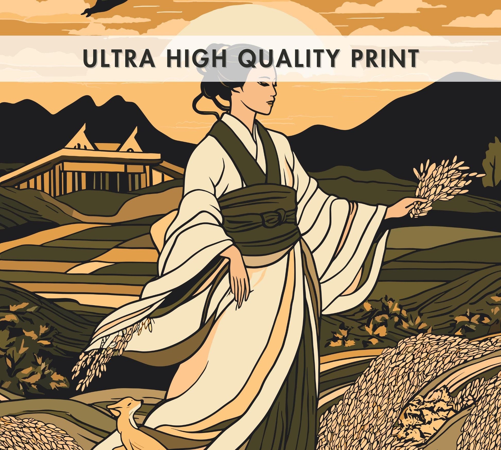 Notre affiche de la déesse Inari – Œuvre d'art mythologique japonaise – embellit votre intérieur grâce à son design serein. Parfaite pour les passionnés de mythologie et les amoureux de la nature, elle représente Inari, déesse japonaise du riz, de la fertilité et des renards, entourée de ses kitsune dans un champ paisible. Que vous honoriez son abondance ou que vous aimiez l'art élégant, cette affiche mythologique d'Inari apportera une touche d'élégance à votre décoration.