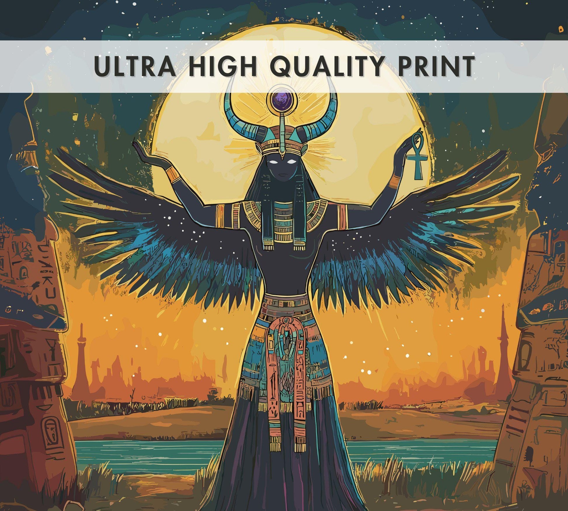 Notre affiche de la déesse égyptienne Isis – Œuvre d'art mythologique – embellit votre intérieur de son design divin. Parfaite pour les passionnés de mythologie et les personnes en quête de spiritualité, elle représente Isis, déesse égyptienne de la magie et de la maternité, les ailes déployées sur un Nil céleste. Que vous vénériez sa puissance ou que vous soyez amateur d'art ancien, cette affiche mythologique d'Isis apportera une touche majestueuse à votre décoration.