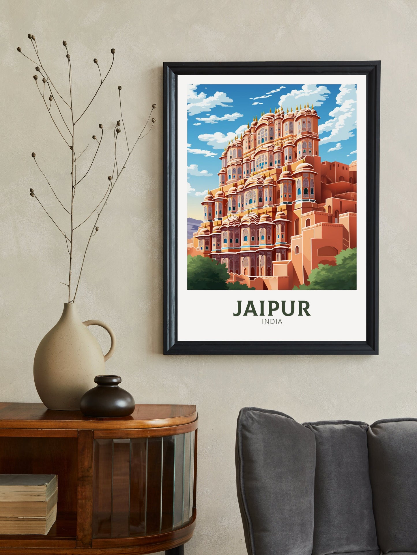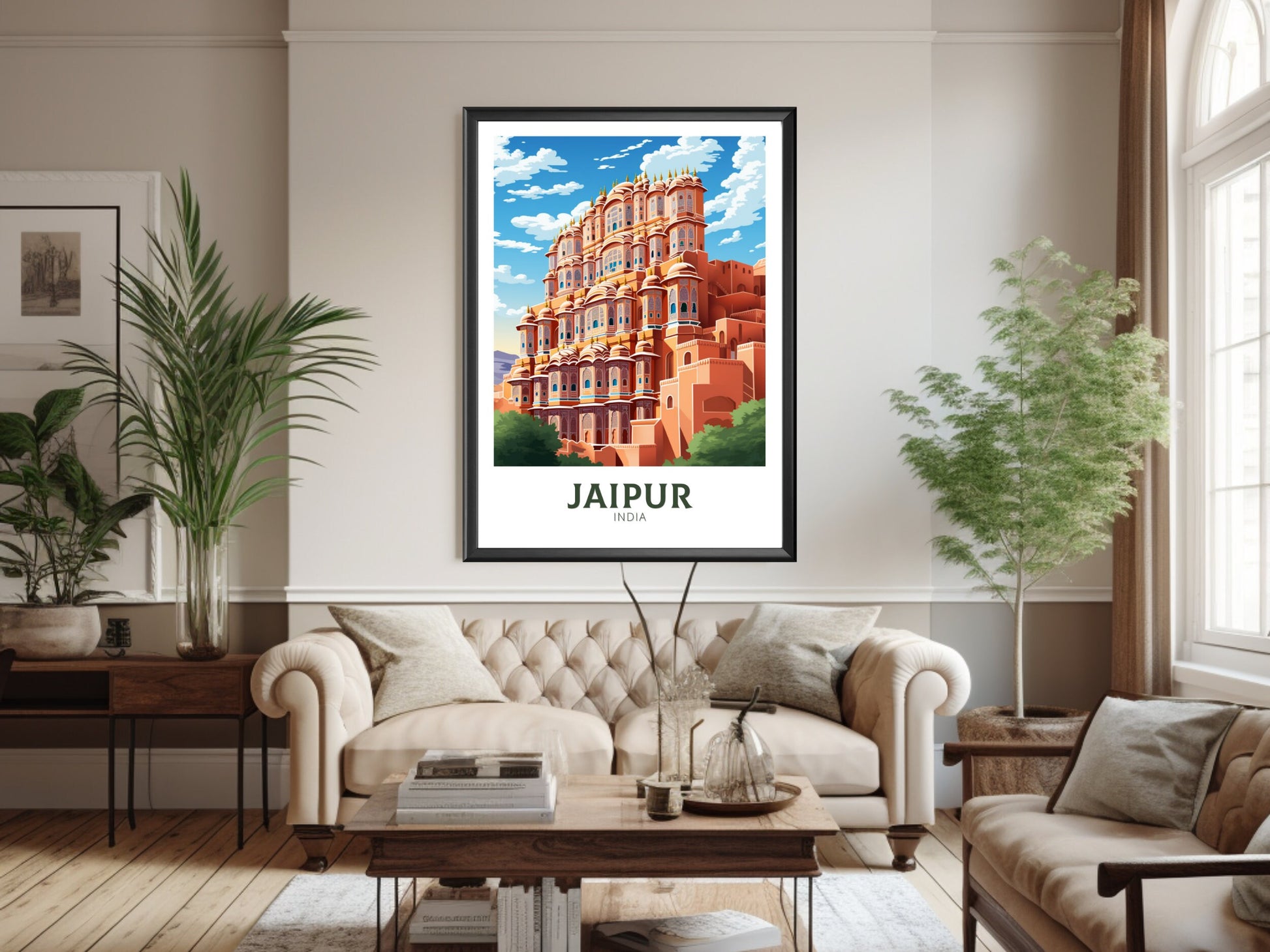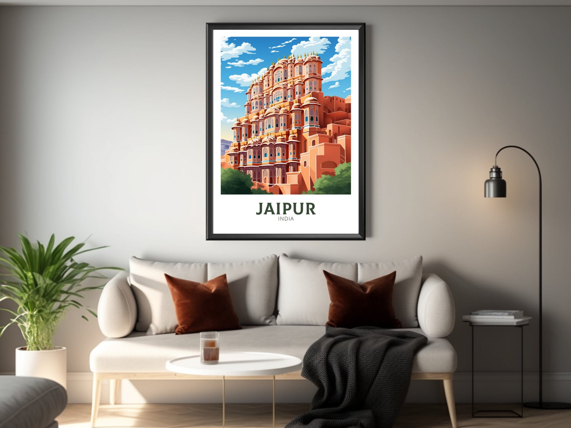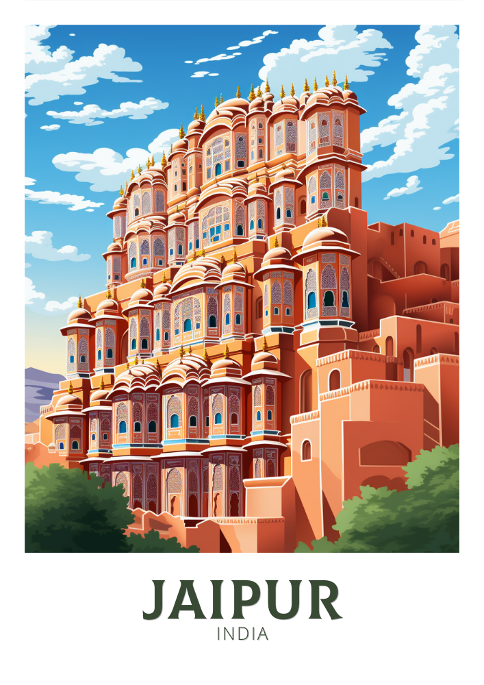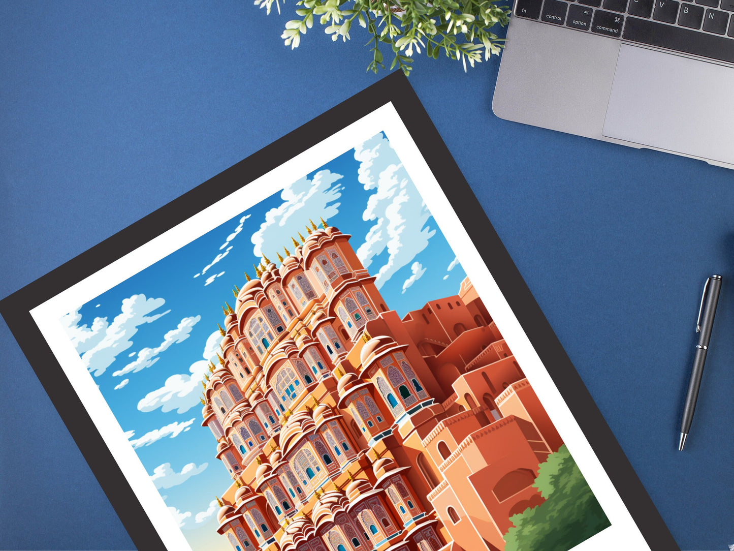 Notre affiche de voyage Jaipur – Design rétro indien – plonge votre intérieur dans la splendeur royale de la Ville rose de l'Inde grâce à son design nostalgique. Idéale pour les passionnés de voyages et les amateurs d'art rétro, elle capture le majestueux Hawaï Mahal de Jaipur et ses bazars animés dans un style intemporel. Que vous ayez exploré ses palais ou rêvé de son charme, cette affiche rétro Jaipur sera un atout déco exceptionnel.