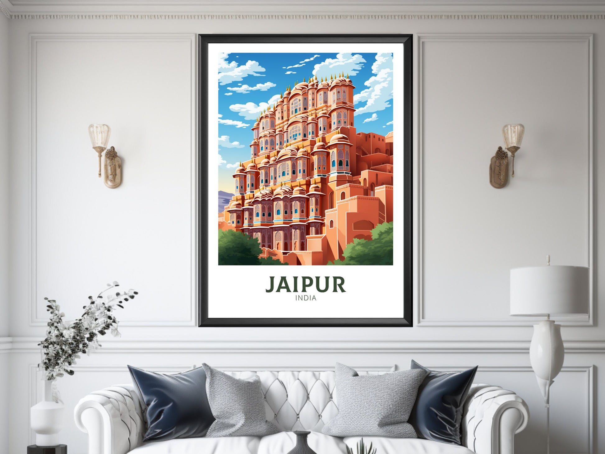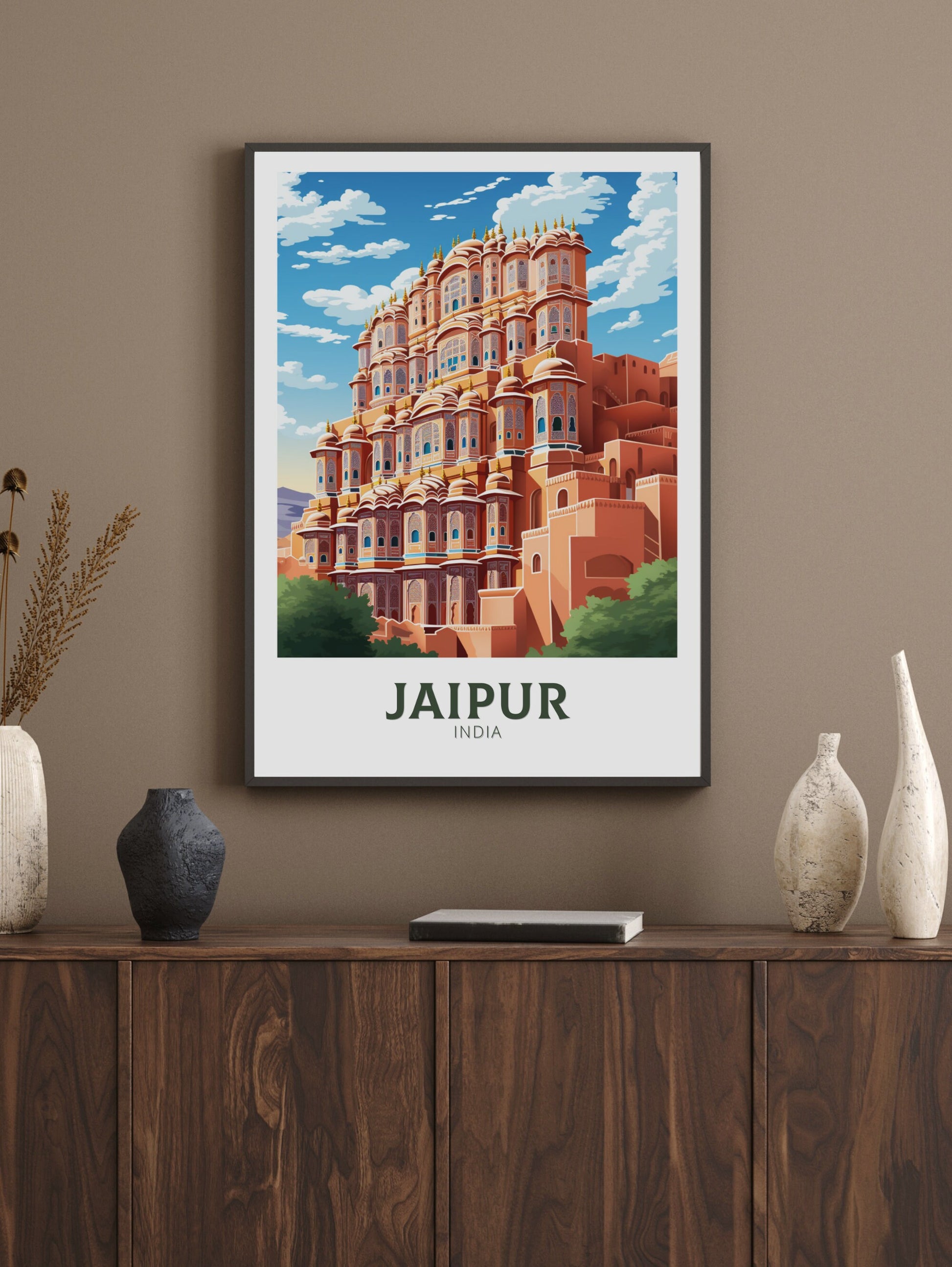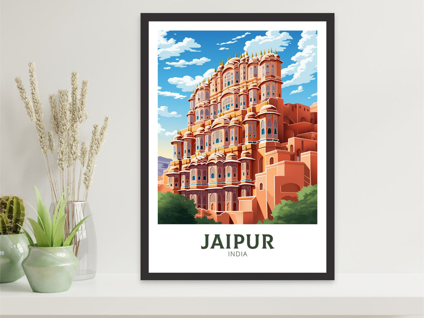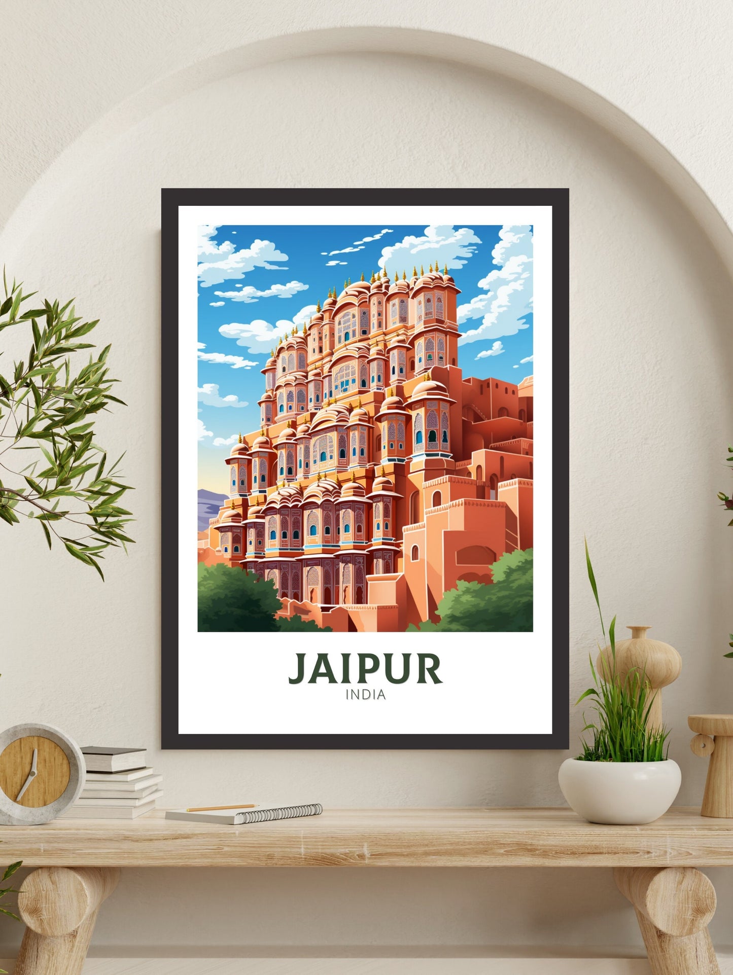 Notre affiche de voyage Jaipur – Design rétro indien – plonge votre intérieur dans la splendeur royale de la Ville rose de l'Inde grâce à son design nostalgique. Idéale pour les passionnés de voyages et les amateurs d'art rétro, elle capture le majestueux Hawaï Mahal de Jaipur et ses bazars animés dans un style intemporel. Que vous ayez exploré ses palais ou rêvé de son charme, cette affiche rétro Jaipur sera un atout déco exceptionnel.