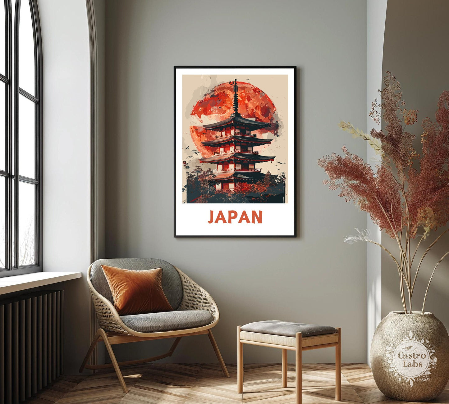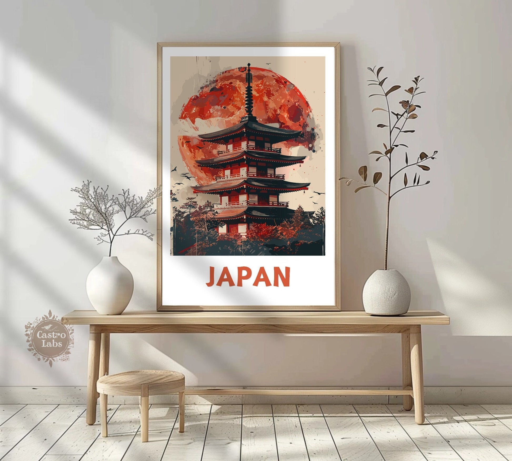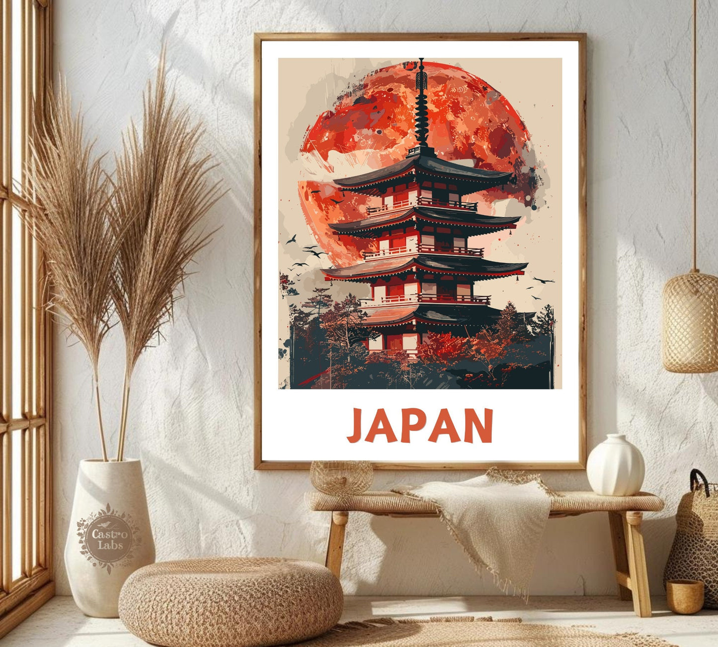 Notre affiche de voyage au Japon – Temple japonais – vous plonge dans la beauté sereine du Japon grâce à son design apaisant. Idéale pour les passionnés de voyages et d'art, elle met en scène un temple japonais traditionnel niché au milieu des cerisiers en fleurs et des collines brumeuses. Que vous ayez visité le Japon ou que vous recherchiez la paix, cette affiche Temple japonais sera un ajout magnifique à votre décoration.