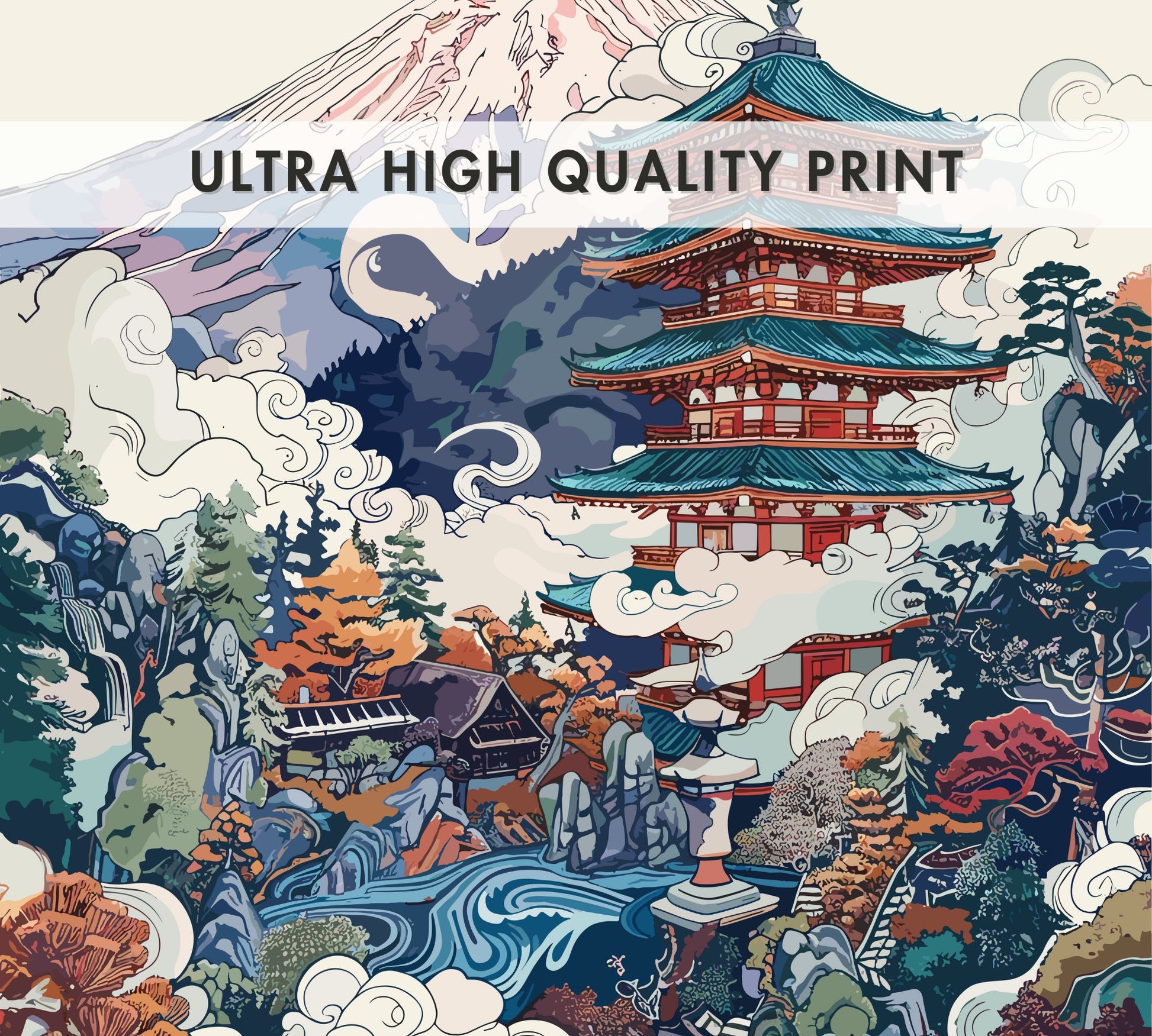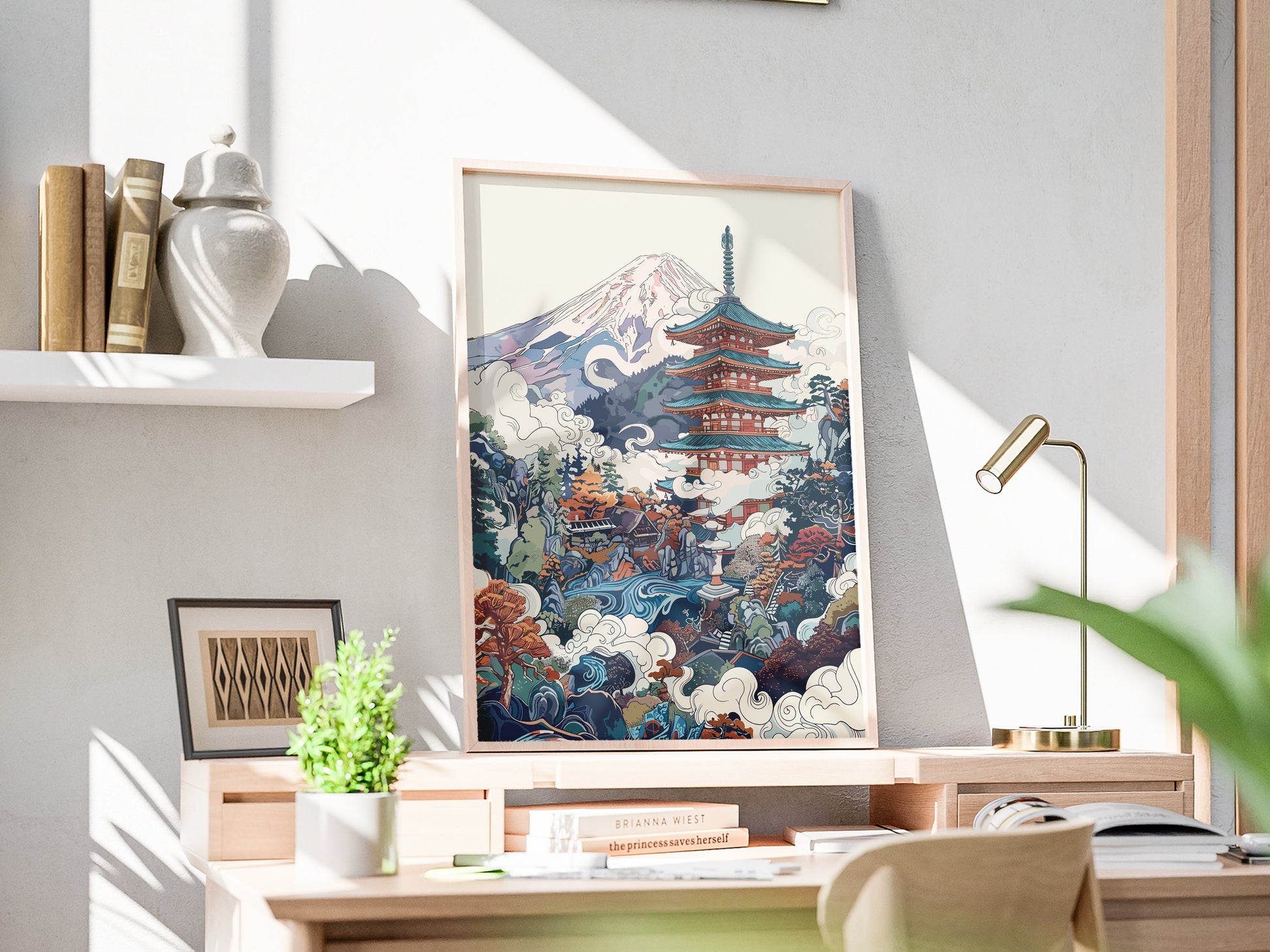 Une imposante pagode perce le ciel sur cette affiche de pagode japonaise , encadrée de cerisiers en fleurs et d'une sérénité sacrée. Imprimée sur un papier robuste et de haute qualité, elle est un choix remarquable pour les admirateurs de sanctuaires ou ceux qui sont attirés par l'héritage spirituel du Japon.