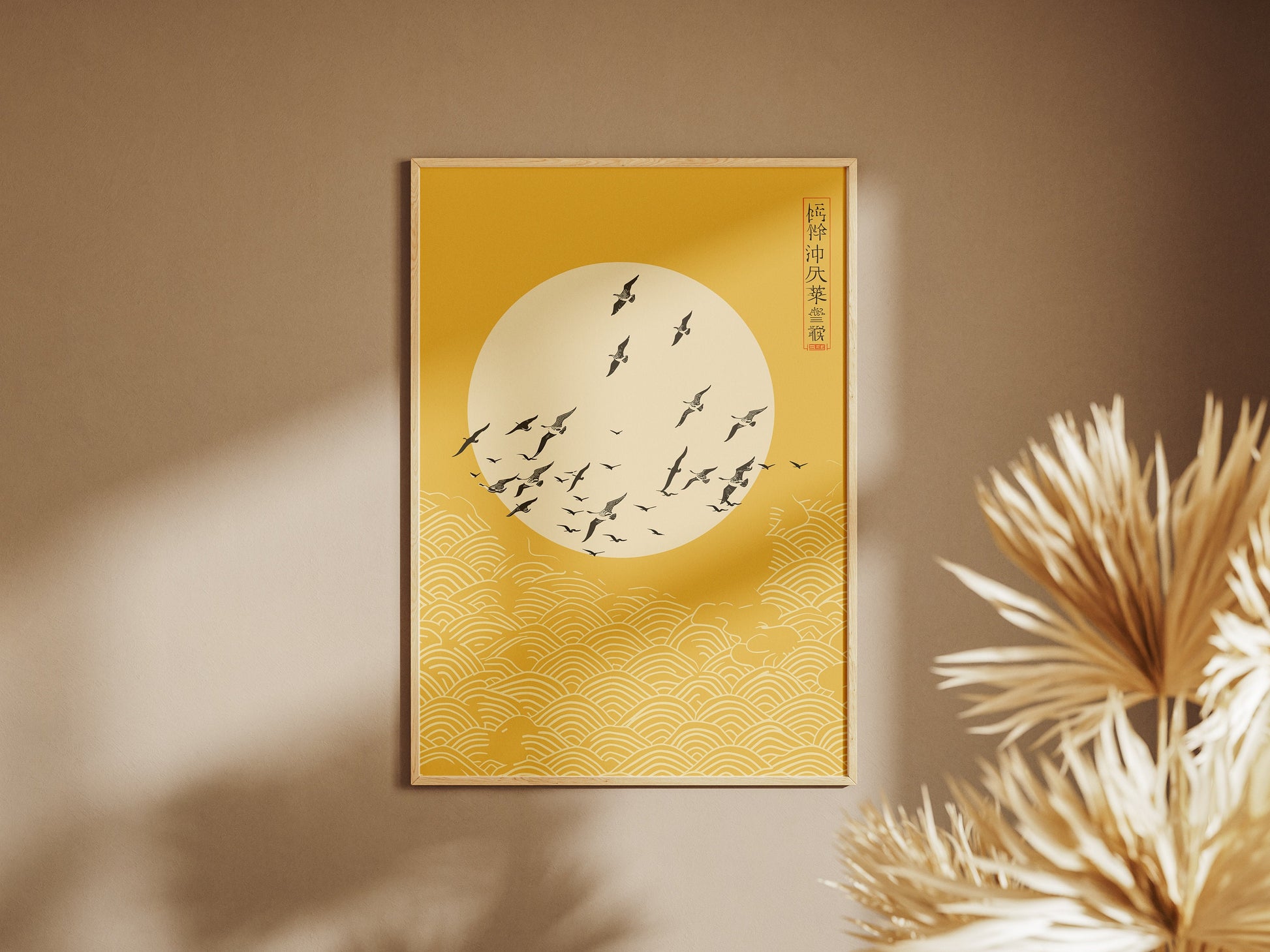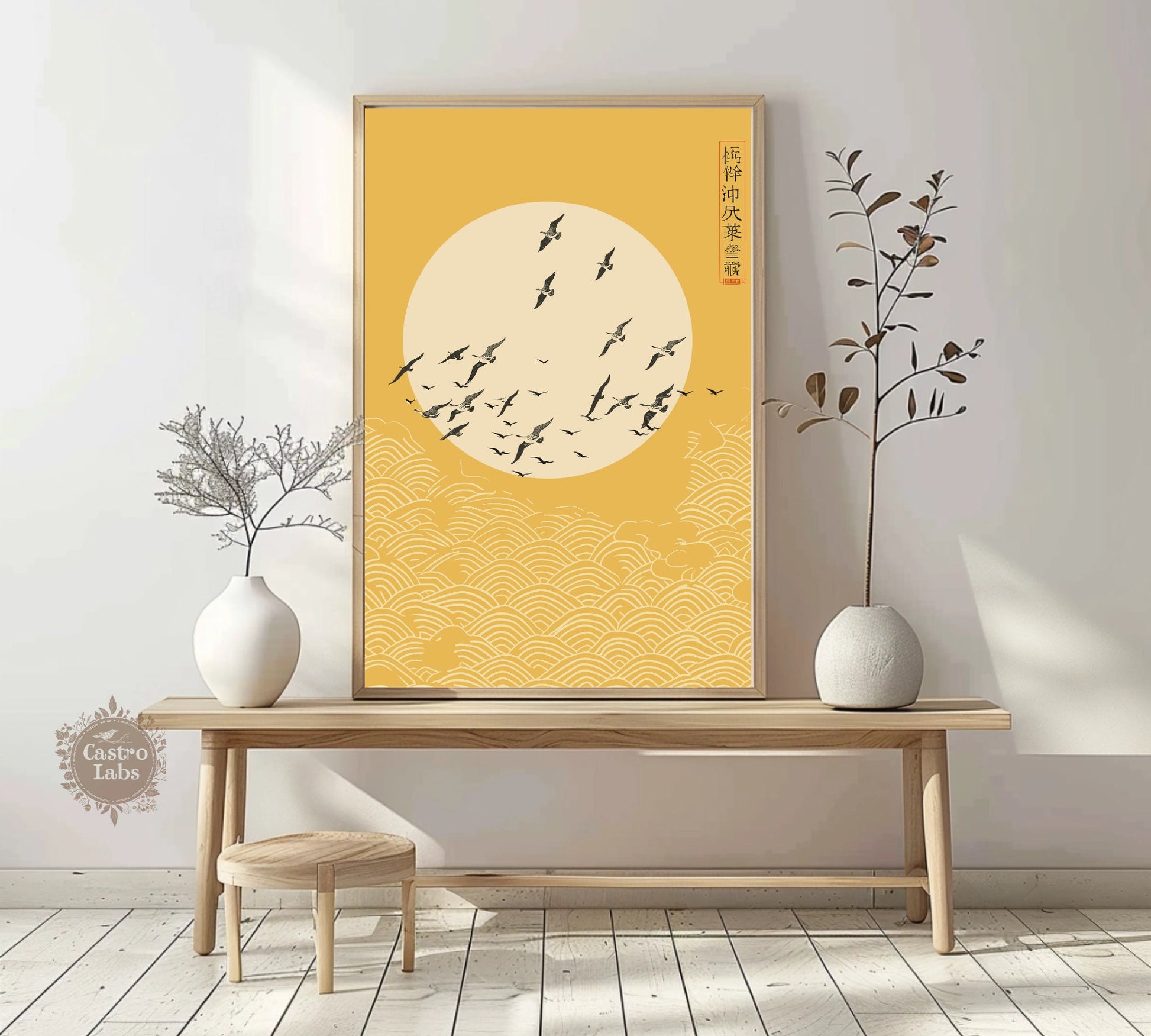 L'œuvre « Soleil levant japonais » capture l'énergie dynamique du symbole emblématique du soleil, mêlant éléments traditionnels japonais et élégance minimaliste du style Japandi. Ses rayons chaleureux et audacieux évoquent puissance et espoir, créant un point focal saisissant dans tout décor moderne.
