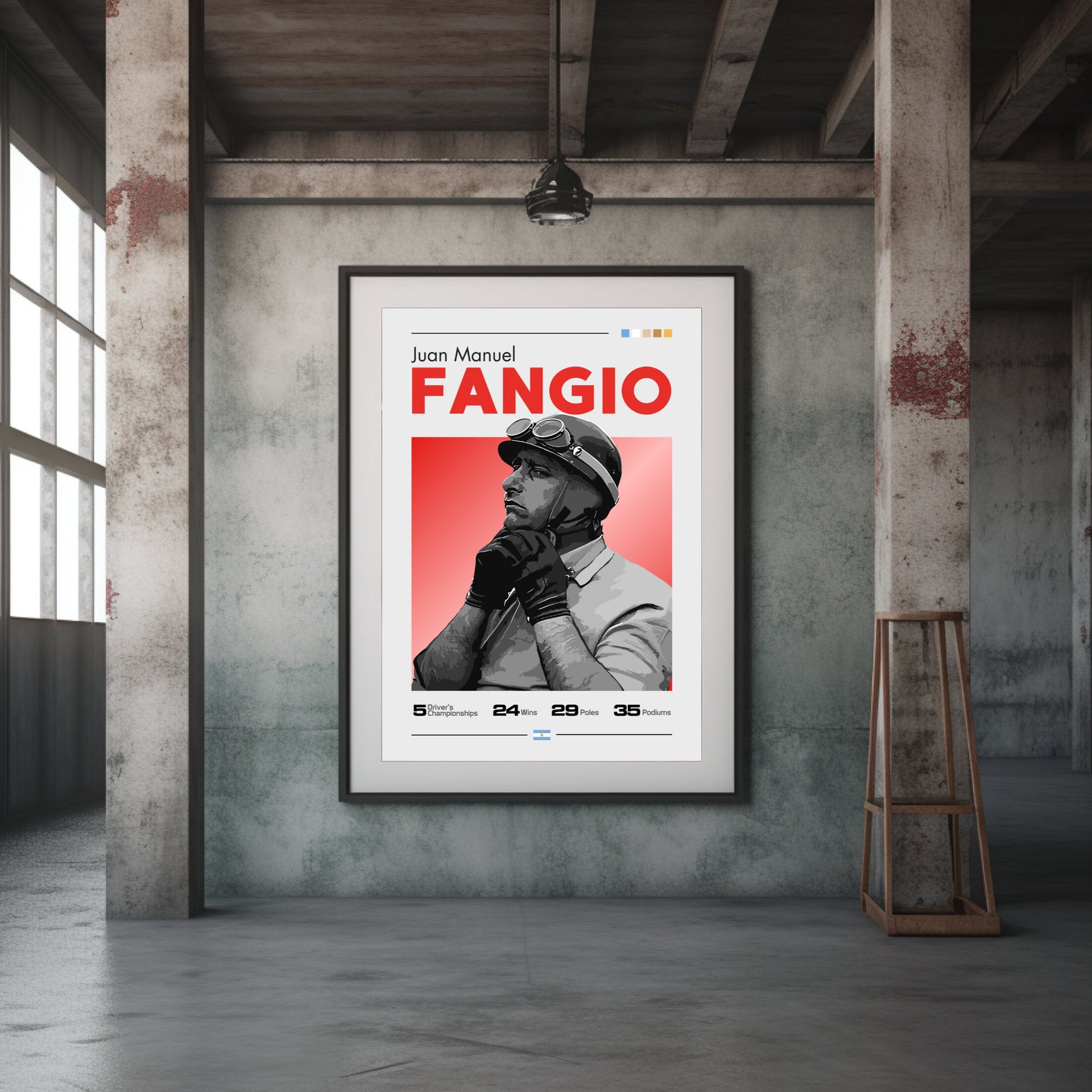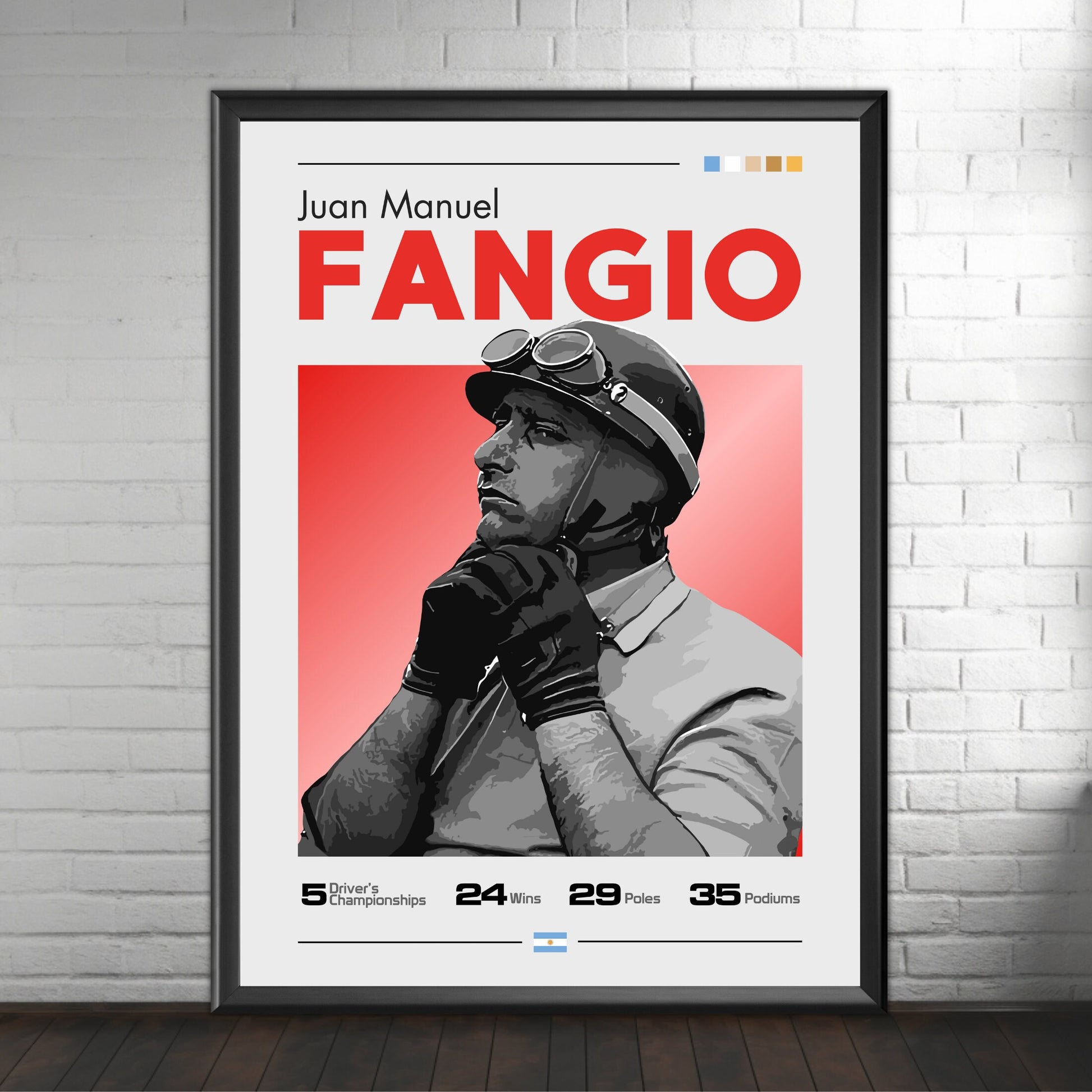 Célébrez Juan Manuel Fangio, l'un des plus grands pilotes de l'histoire de la Formule 1, avec cette affiche de sport automobile haut de gamme. Surnommé El Maestro , Fangio a dominé le sport dans les années 1950, remportant cinq championnats du monde avec quatre écuries différentes : Alfa Romeo, Maserati, Mercedes et Ferrari. Ses exploits ont établi une référence en matière de grandeur qui a perduré pendant des décennies.
