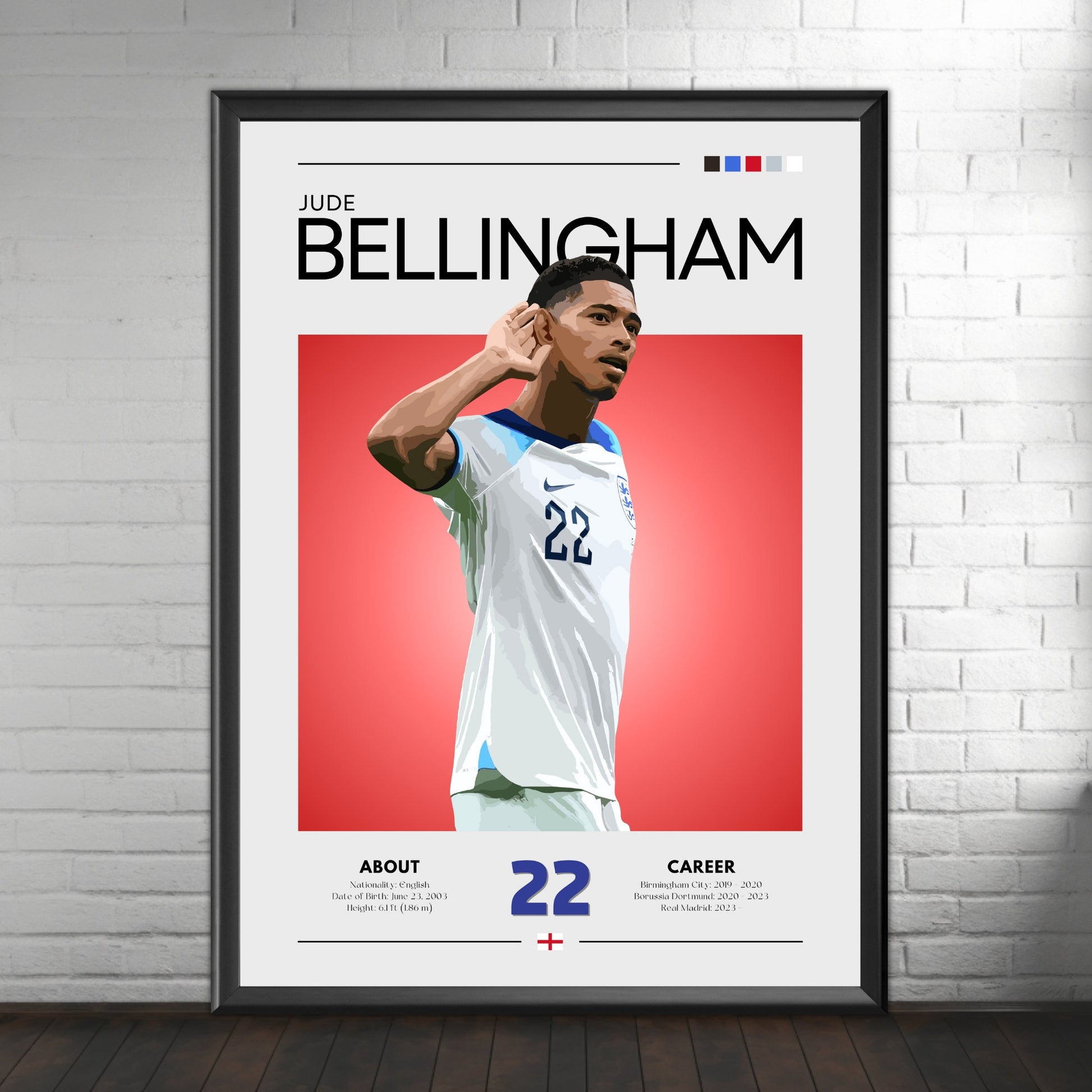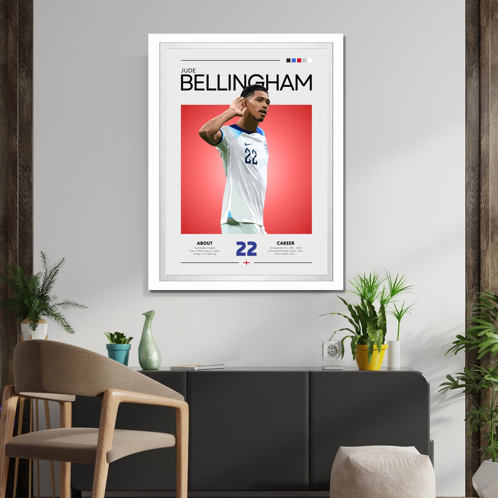 Que vous soyez un fervent supporter de l'Angleterre ou que vous admiriez simplement un footballeur exceptionnel, cette œuvre d'art sera un ajout remarquable à votre collection. Célébrez l'énergie du jeu, l'esprit indomptable de la jeunesse et l'avenir prometteur du football anglais avec cette affiche captivante. Sublimez votre espace avec le dynamisme de Jude Bellingham, étoile montante du football, et laissez l'écho de chaque match palpitant résonner dans votre environnement.