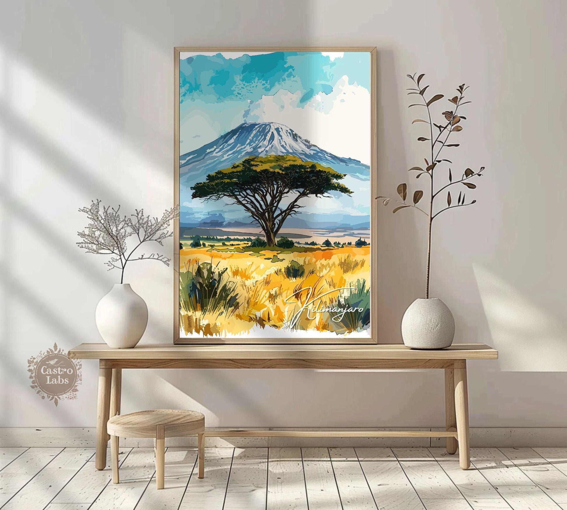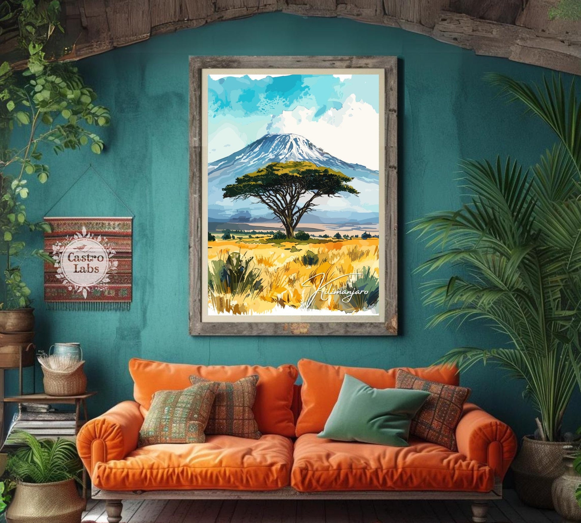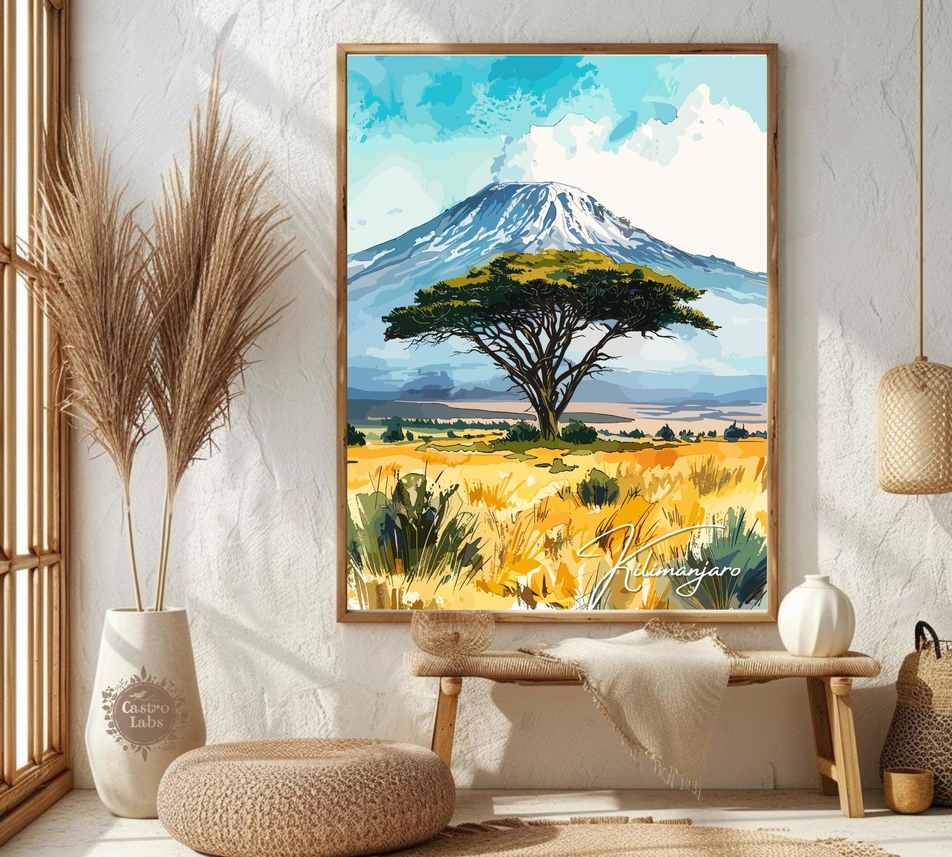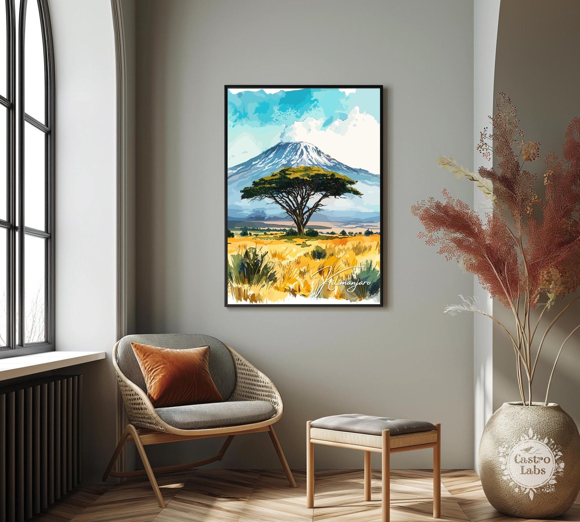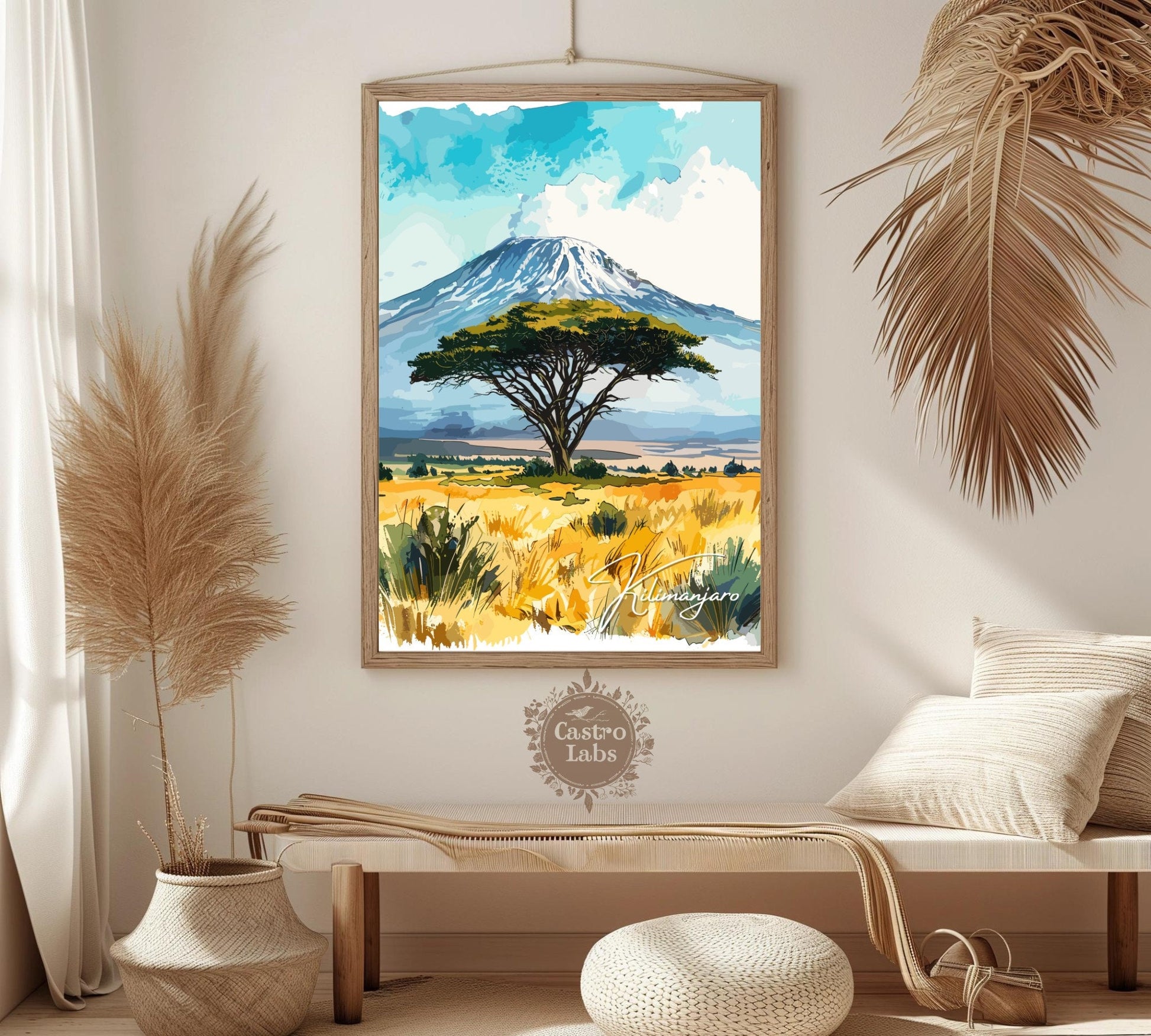 Notre affiche Kilimandjaro - Paysage africain - plonge votre intérieur dans les hauteurs majestueuses du Kilimandjaro en Tanzanie grâce à son design vibrant. Idéale pour les passionnés de voyages et d'art, elle capture le sommet enneigé et les vastes savanes avec des détails saisissants. Que vous ayez parcouru ses pentes ou rêvé de sa grandeur, cette affiche Kilimandjaro sera un ajout magnifique à votre décoration.