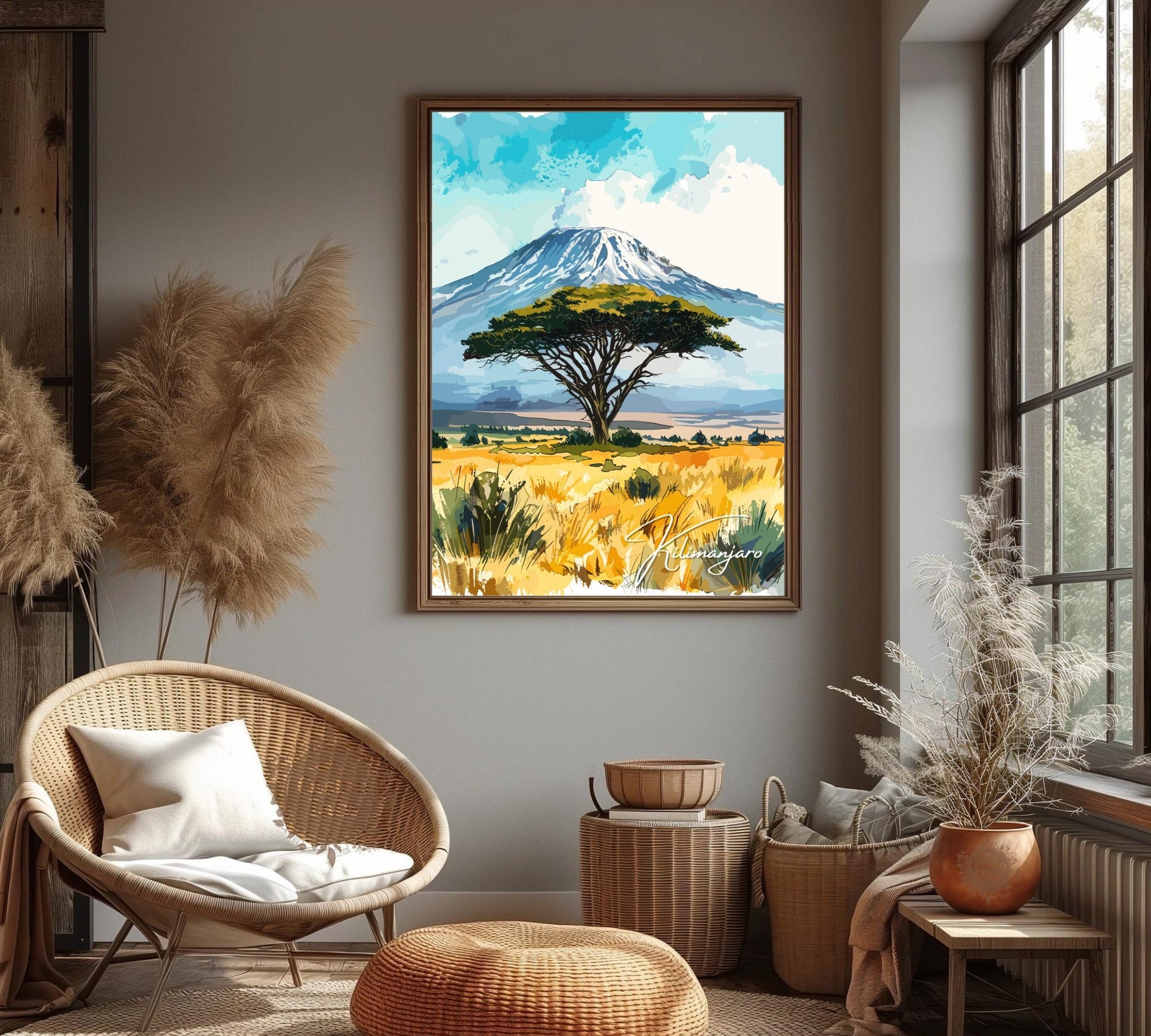 Transformez votre intérieur en un lieu empreint de l'esprit grandiose du Kilimandjaro grâce à cette œuvre captivante. Idéale pour les salons, les bureaux ou les espaces inspirés du voyage, elle s'harmonise parfaitement avec d'autres œuvres d'art africaines. Plus qu'un simple objet de décoration, cette affiche de paysage africain est un voyage vers les paysages emblématiques du Kilimandjaro.