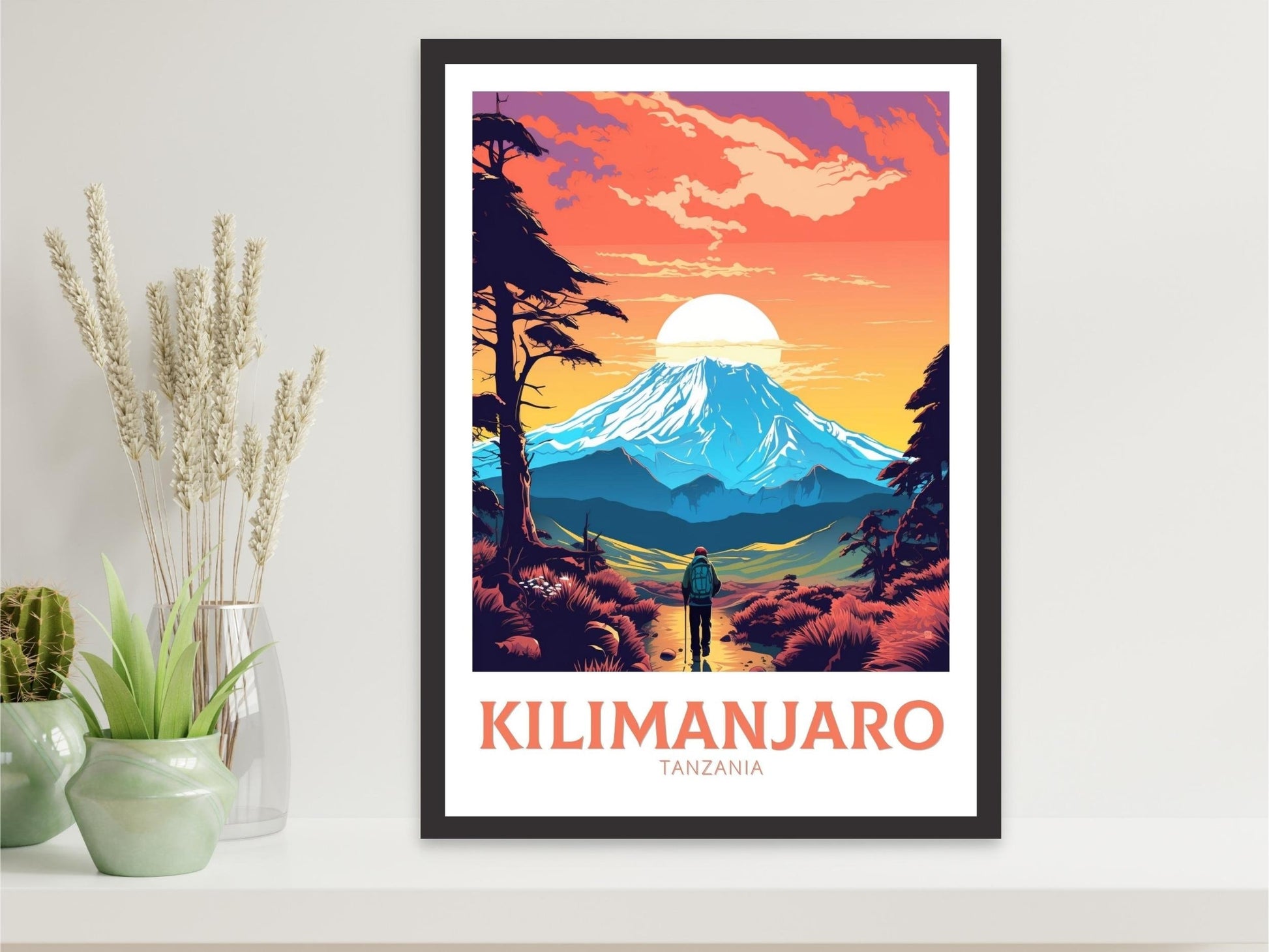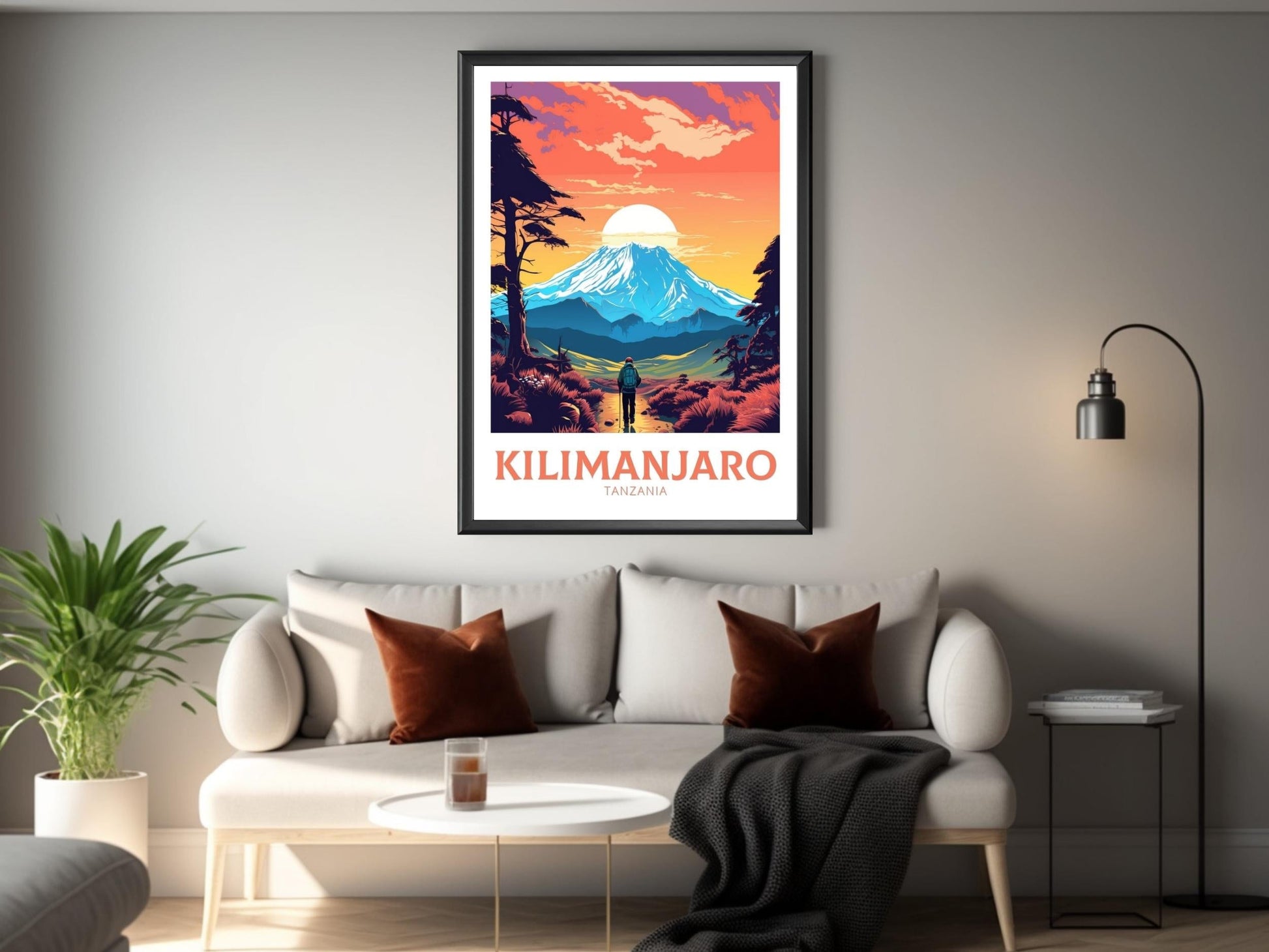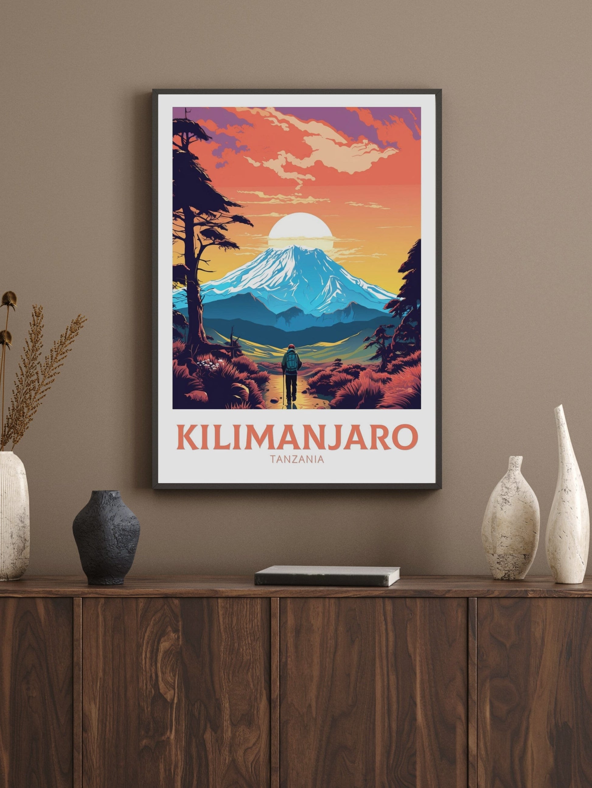 Notre affiche vintage Kilimandjaro - Tanzania Art plonge votre intérieur dans les hauteurs majestueuses du Kilimandjaro en Tanzanie grâce à son design nostalgique. Parfaite pour les passionnés de voyages et d'art rétro, elle capture le sommet enneigé et les vastes savanes dans un style intemporel. Que vous ayez parcouru ses pentes ou rêvé de sa grandeur, cette affiche vintage Kilimandjaro sera un ajout magnifique à votre décoration.