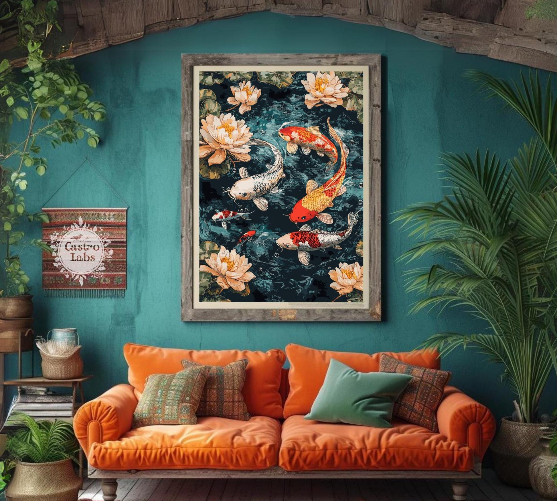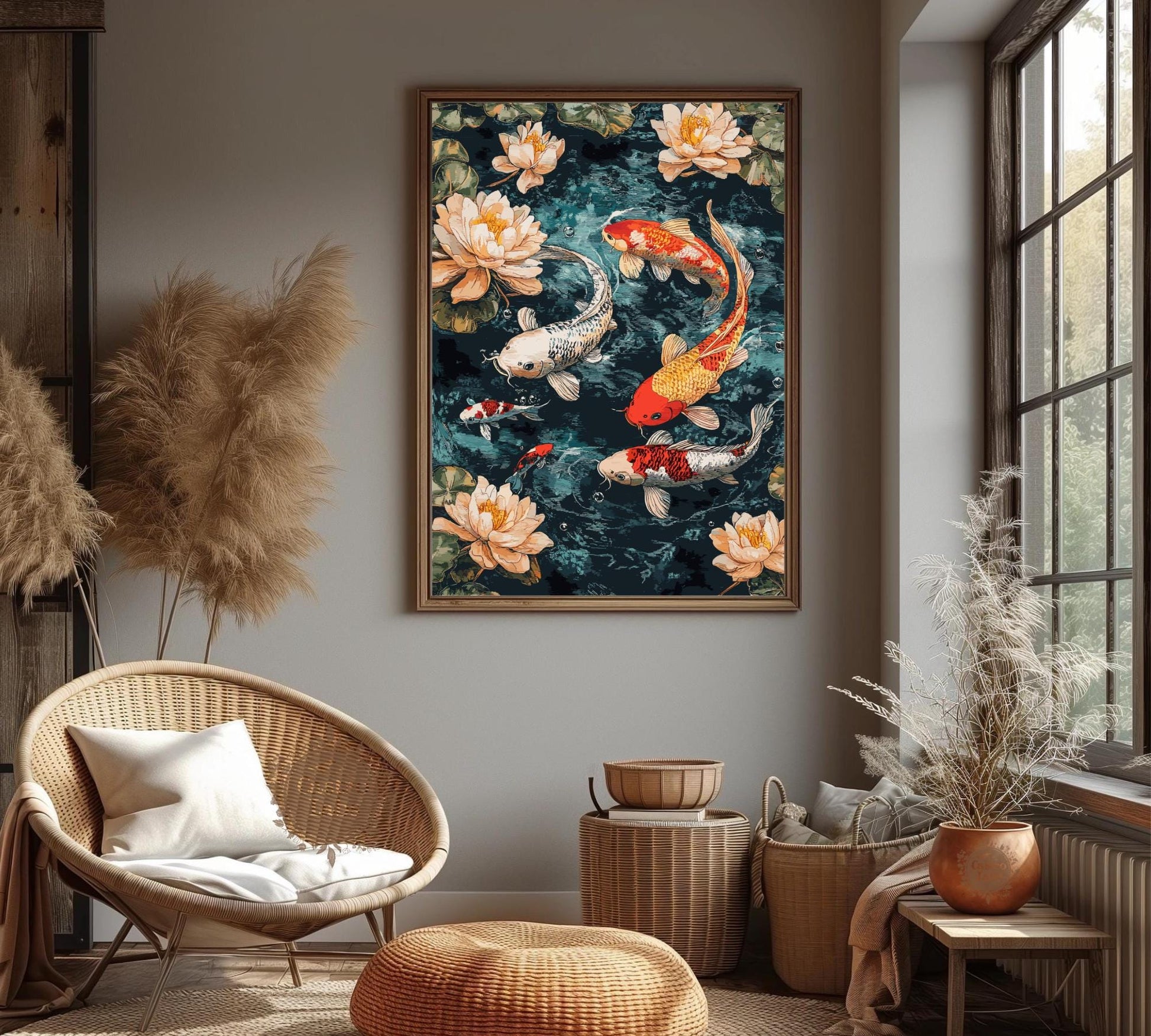 Réalisée sur un papier durable et de haute qualité, cette œuvre d'art japonaise reflète la danse paisible des carpes koï. Parfaite pour les amoureux de la nature ou les amateurs d'esthétique orientale en quête d'une touche murale apaisante. Une touche de zen.