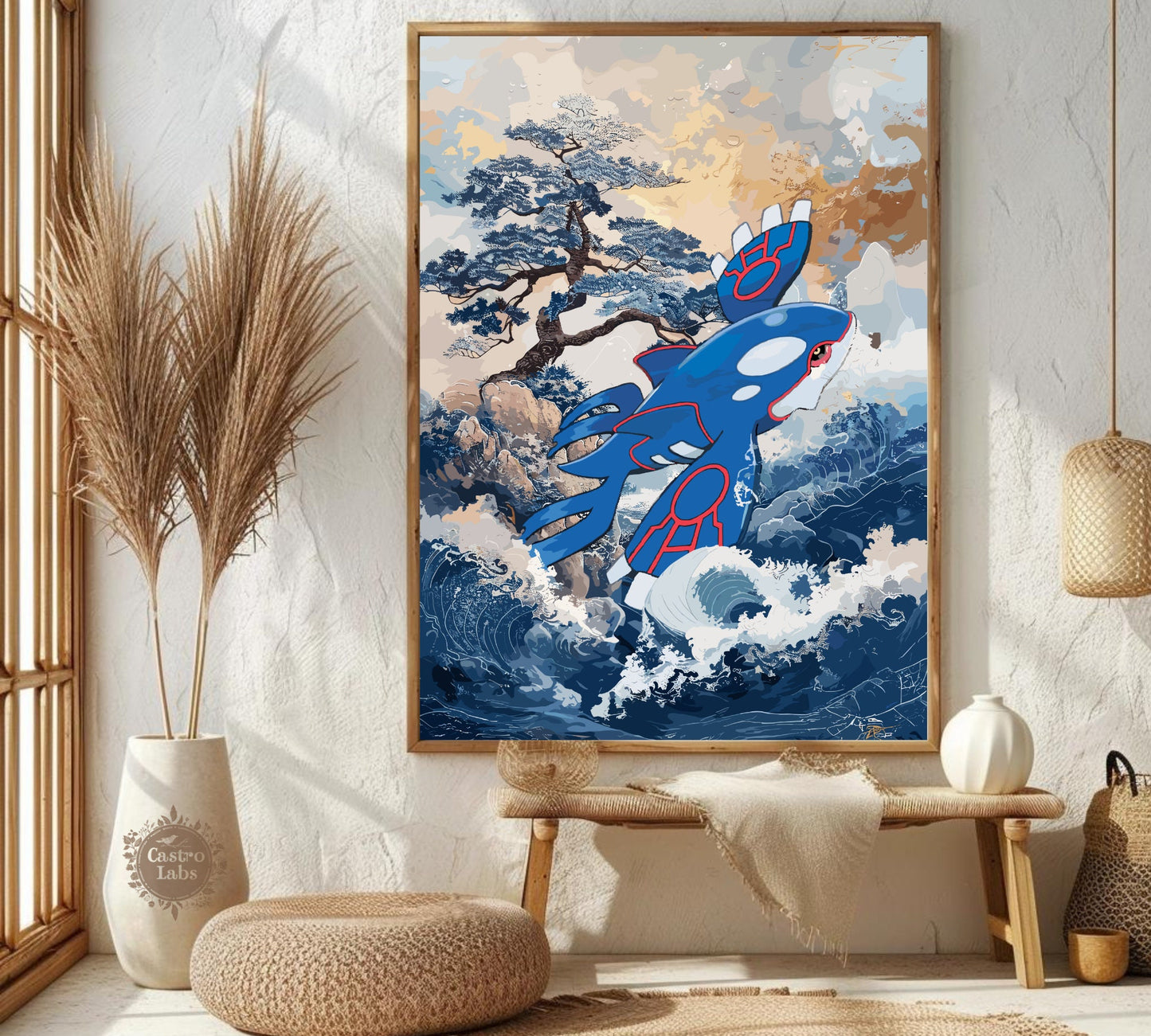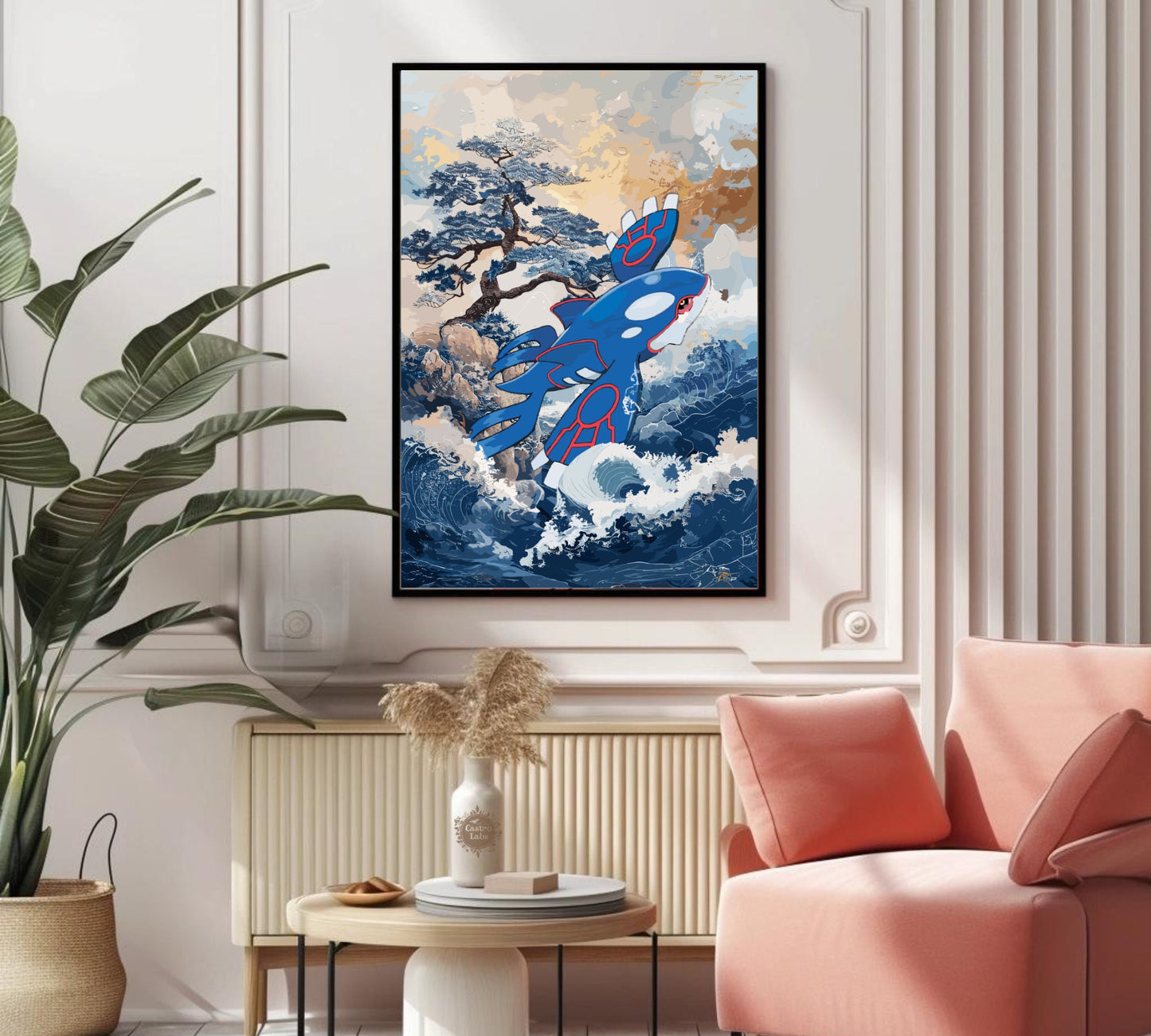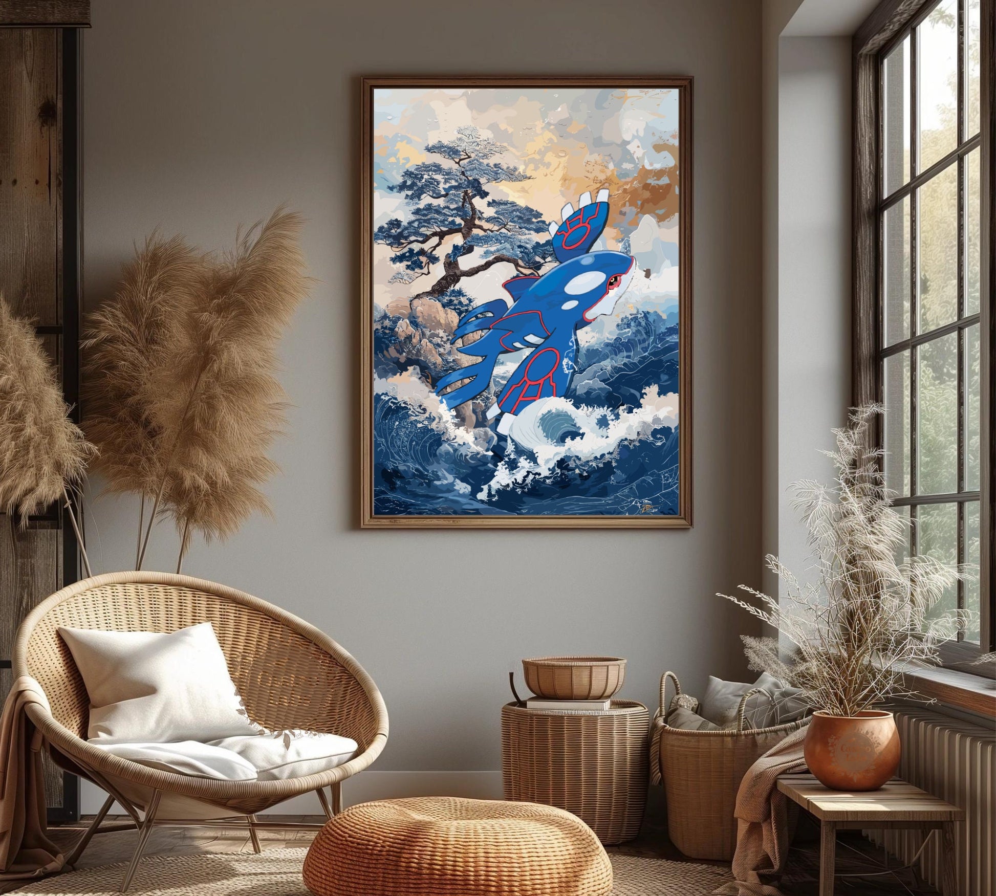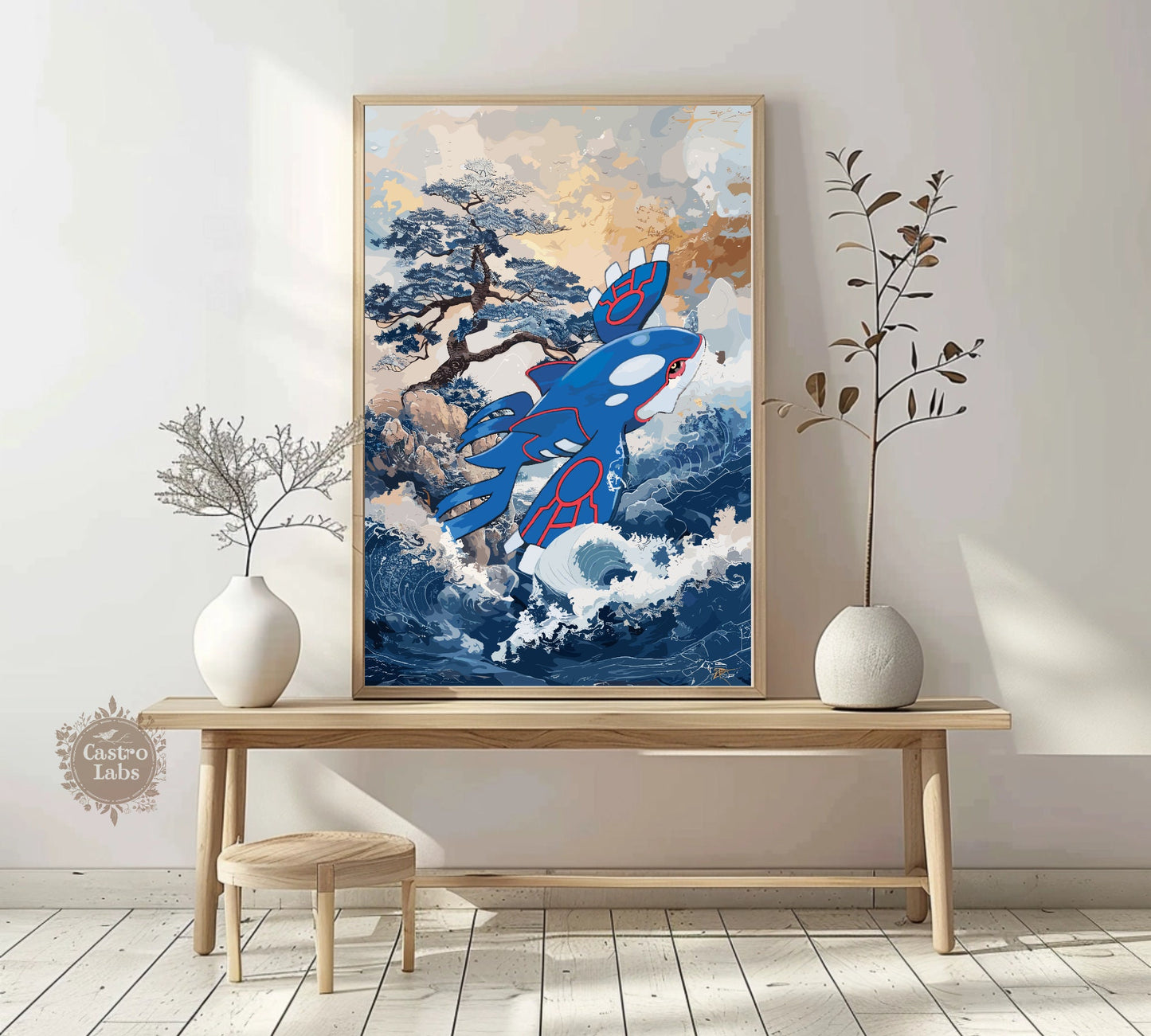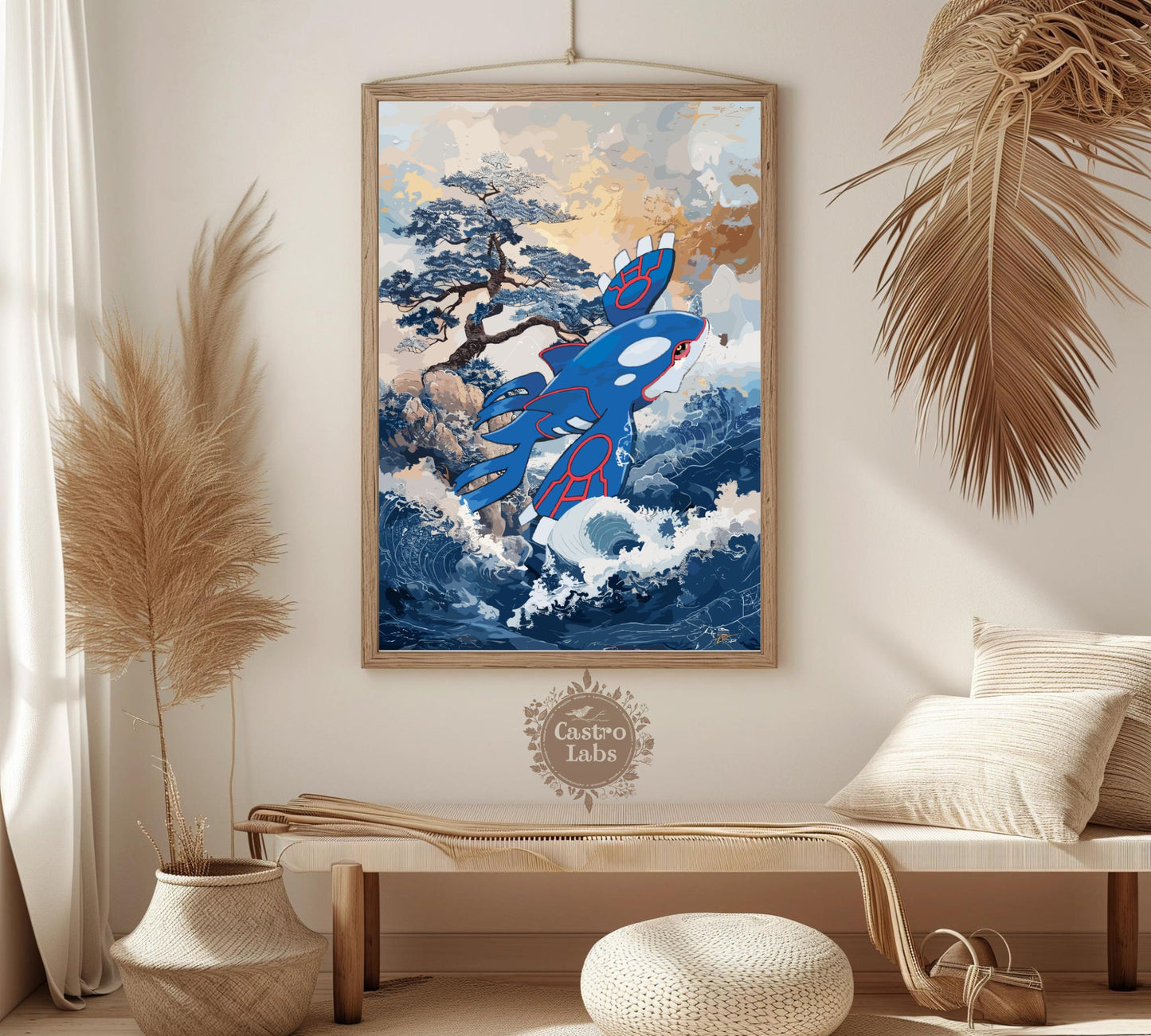 Faites entrer les mers légendaires dans votre maison avec cette affiche d'art Kyogre de style tapisserie japonaise , un incontournable pour les amateurs de Pokémon qui souhaitent mélanger l'esthétique de l'anime avec l'art culturel.