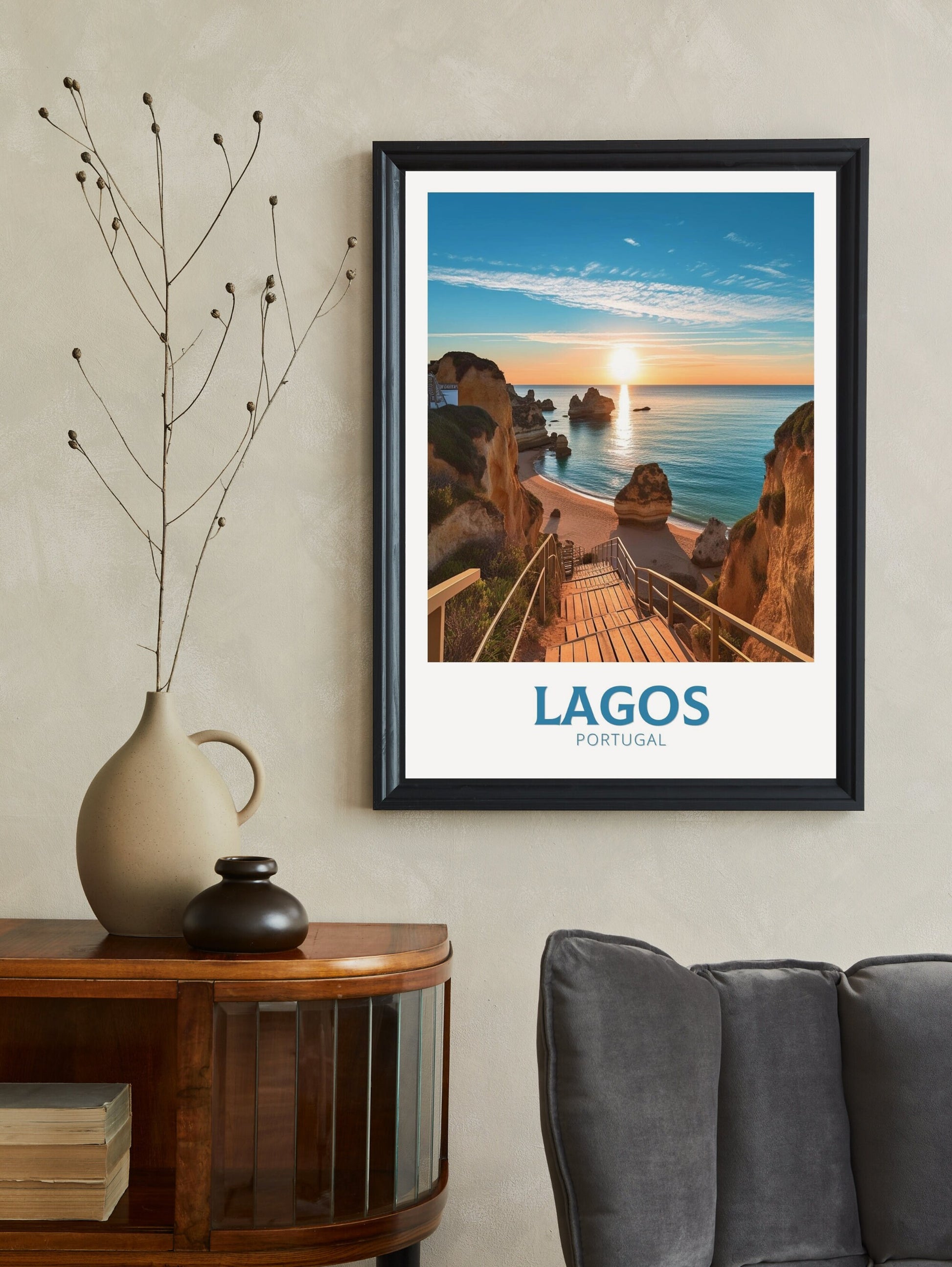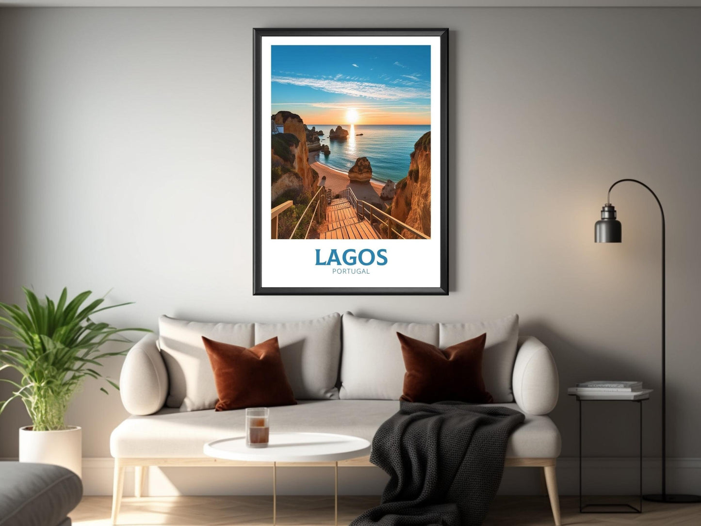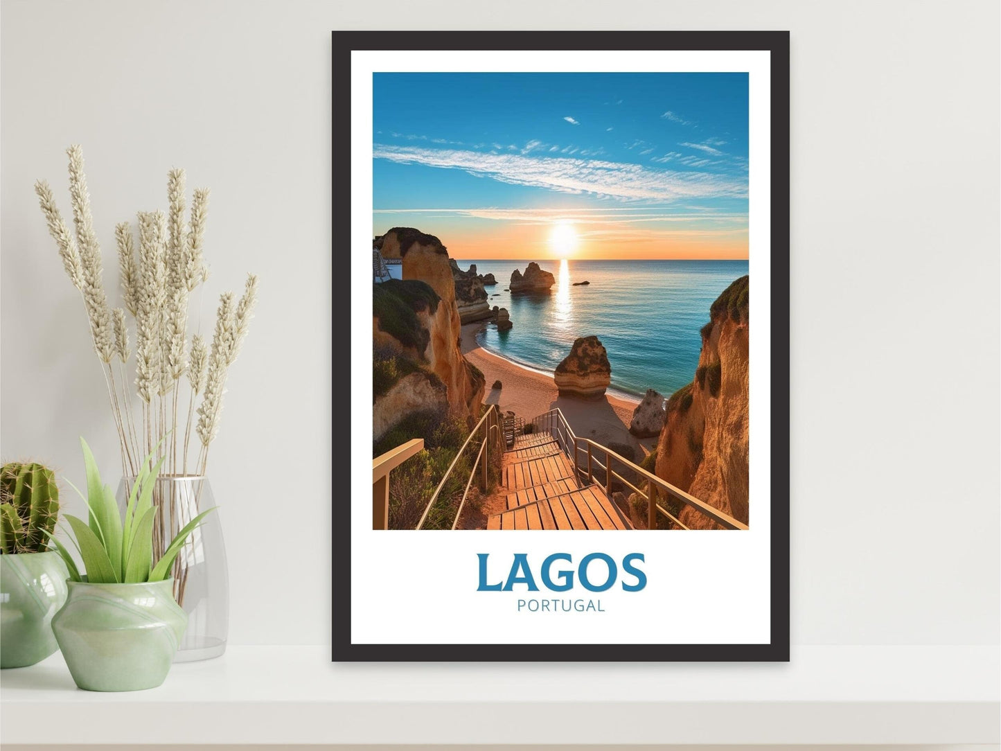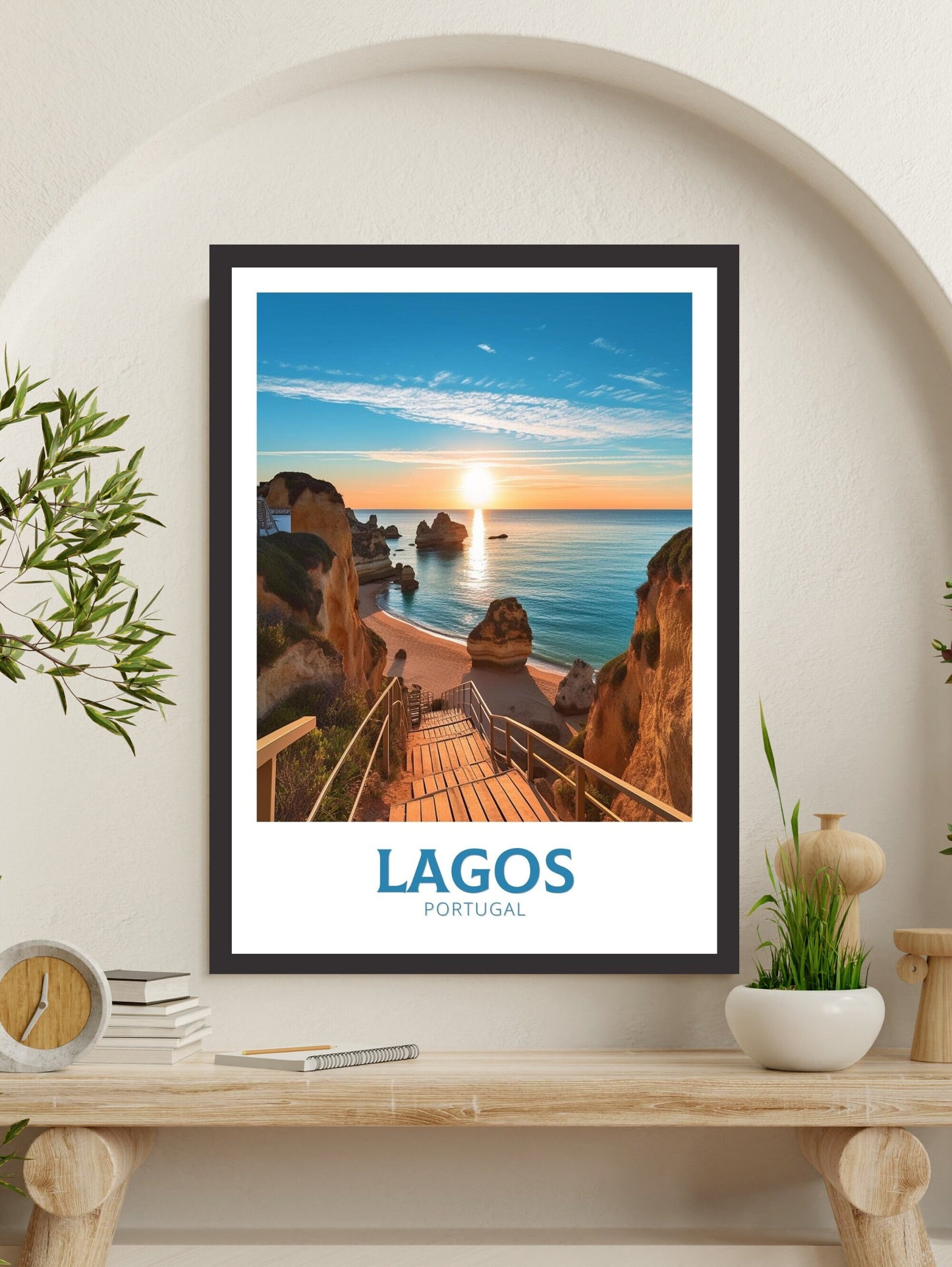 Découvrez la beauté époustouflante du littoral du sud du Portugal grâce à notre affiche de voyage de Lagos , une œuvre d'art portugaise vibrante immortalisant les falaises à couper le souffle, les plages dorées et la charmante vieille ville de Lagos. Connue pour son littoral pittoresque et son riche passé maritime, Lagos est une destination incontournable pour les amateurs de voyages au Portugal et d'escapades balnéaires pittoresques.