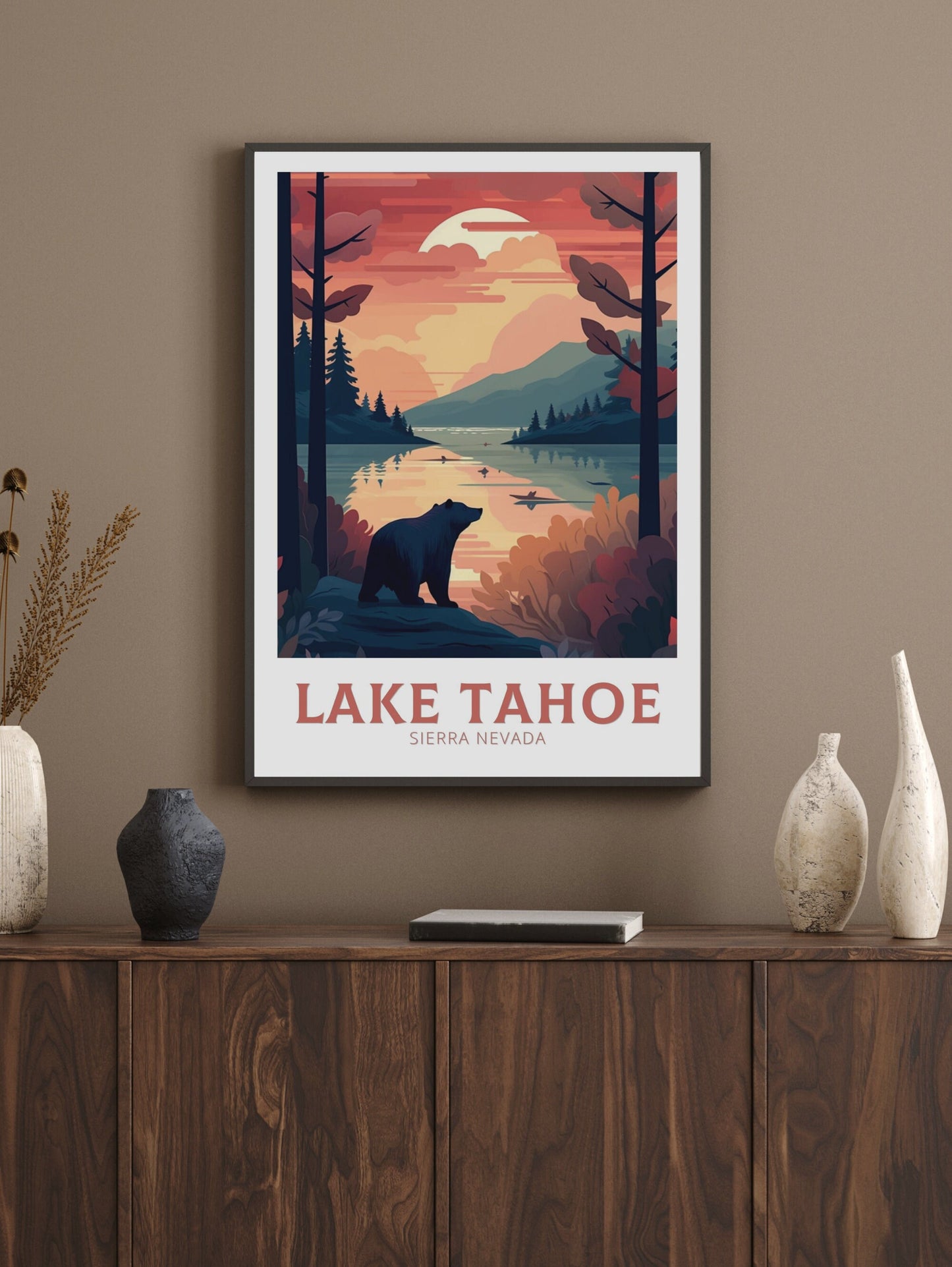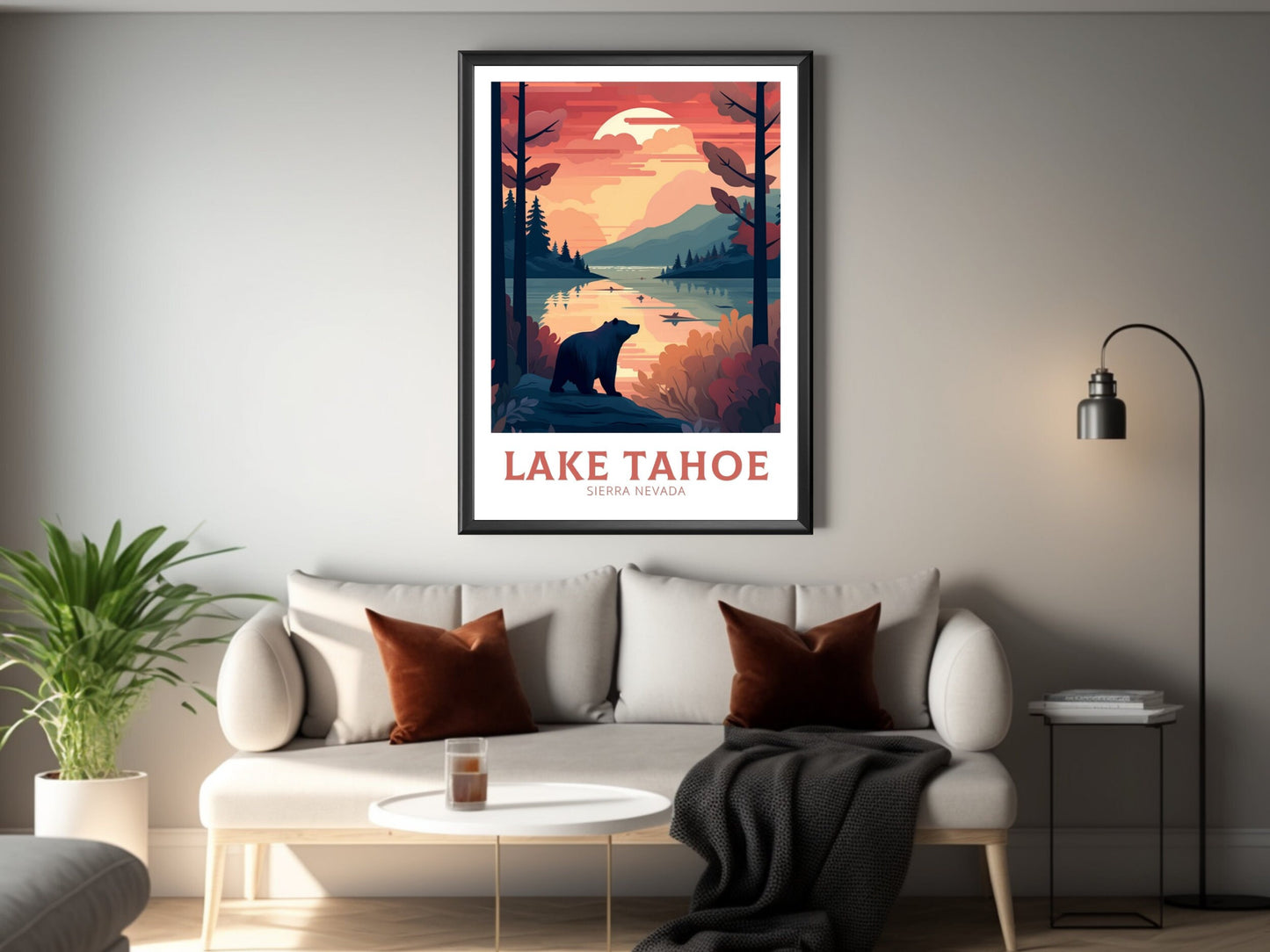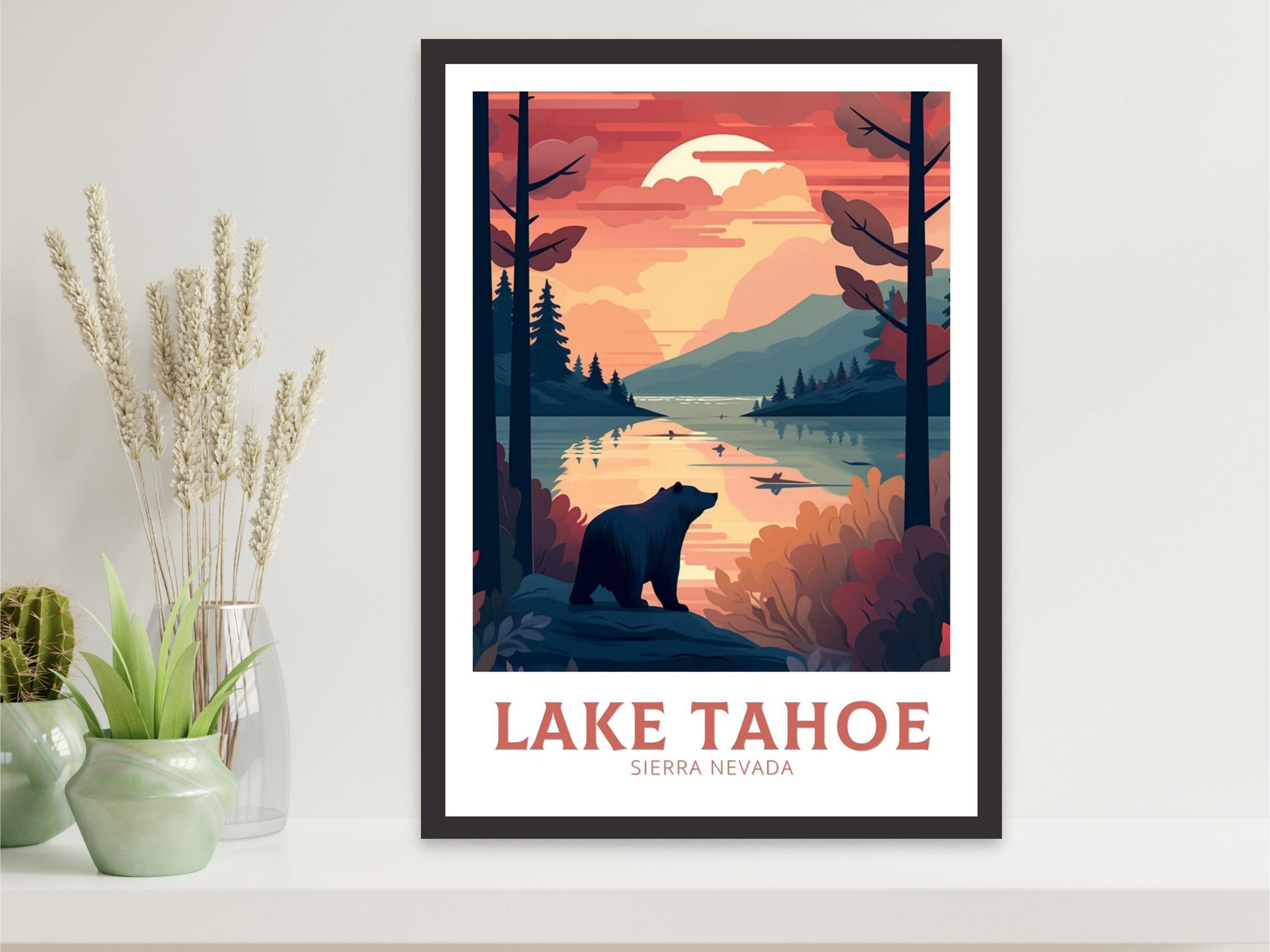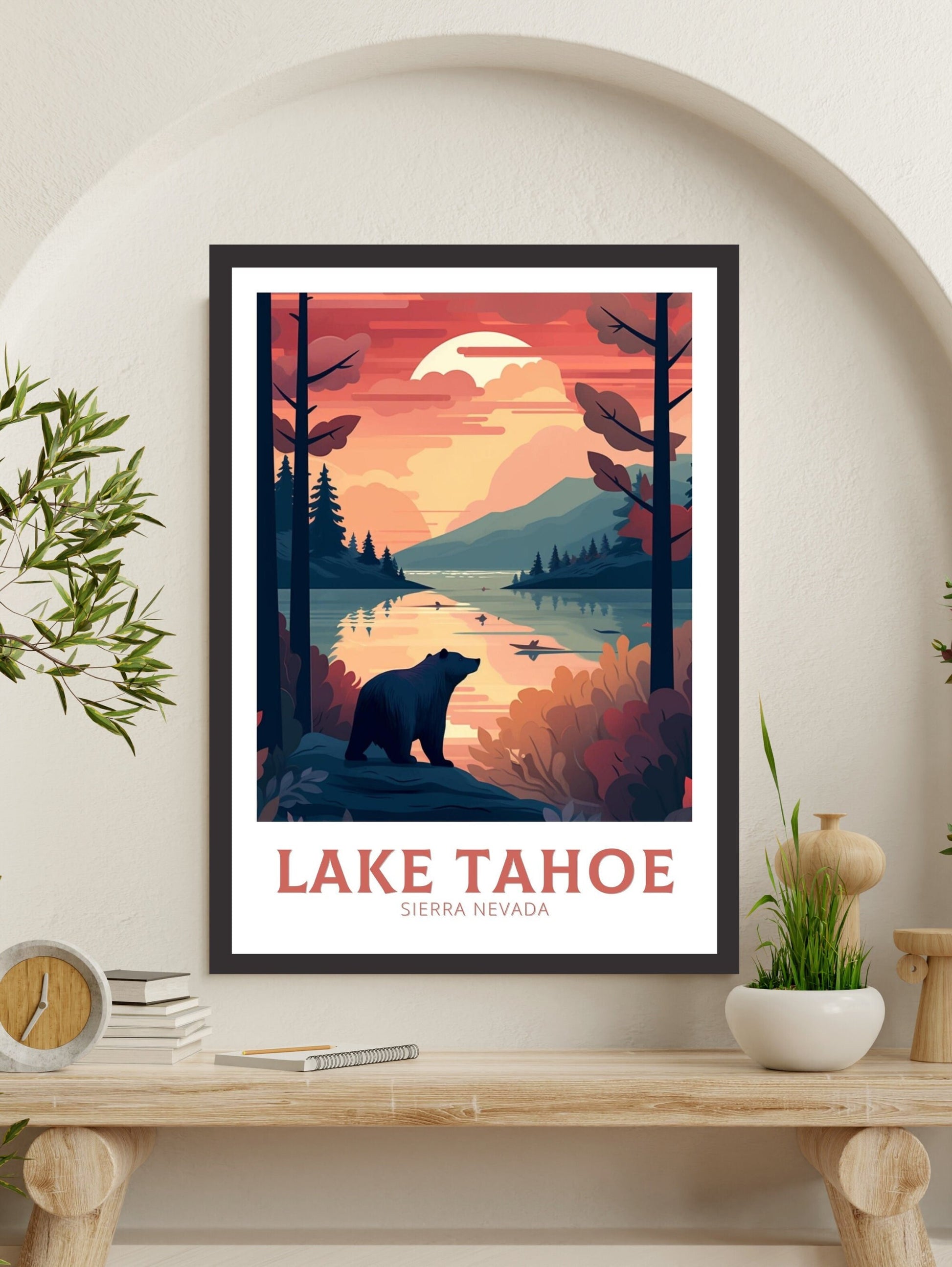 Célébrez la beauté naturelle des montagnes avec notre affiche de voyage du lac Tahoe . Cette œuvre d'art de la Sierra Nevada immortalise les eaux cristallines du lac Tahoe, entourées de sommets alpins et de forêts de conifères. Elle est idéale pour les amoureux de la nature, les voyageurs et les amateurs de décoration d'intérieur inspirée de la montagne. Introduisez la sérénité du plein air dans votre salon, votre bureau ou votre mur de galerie.