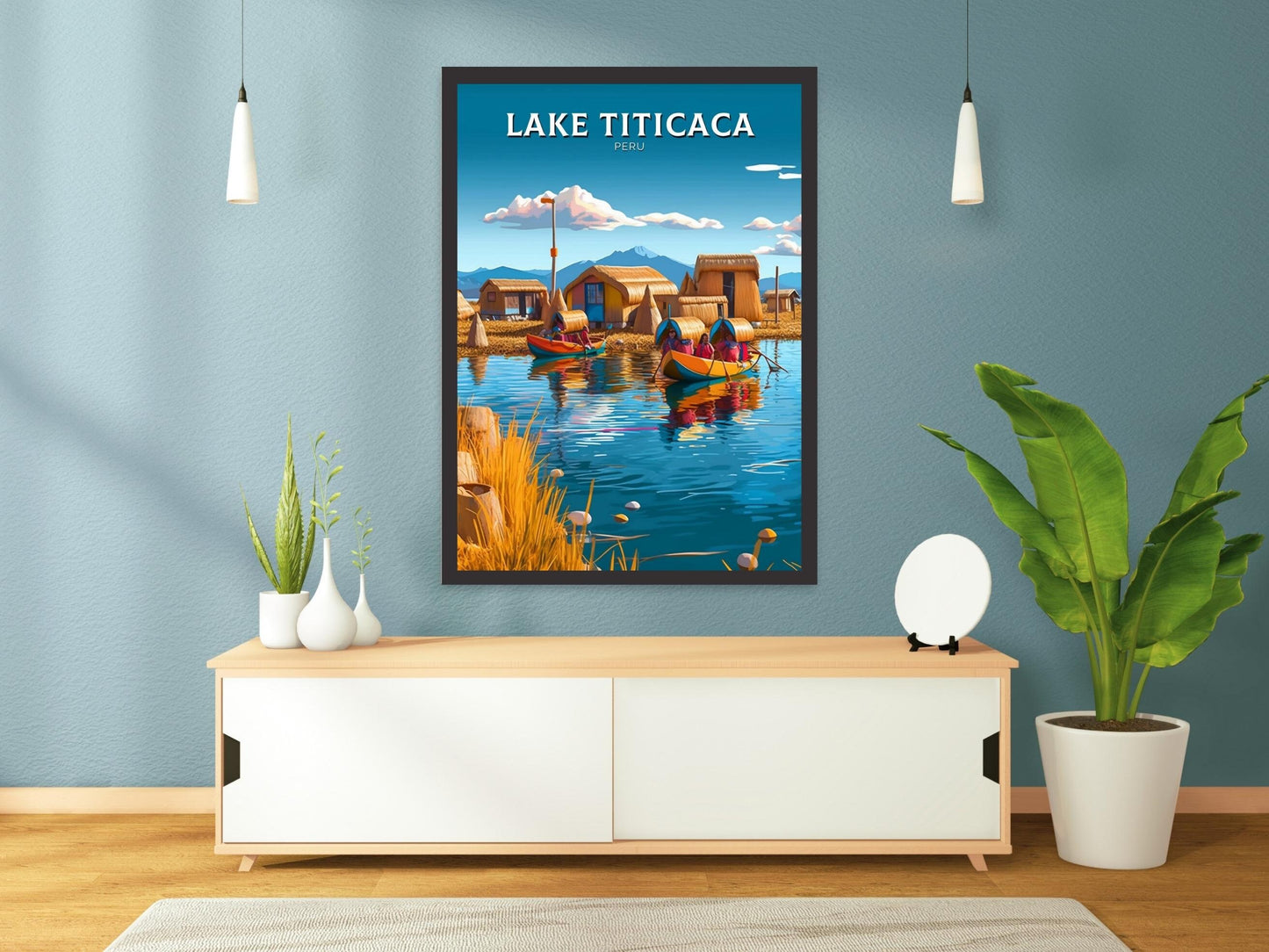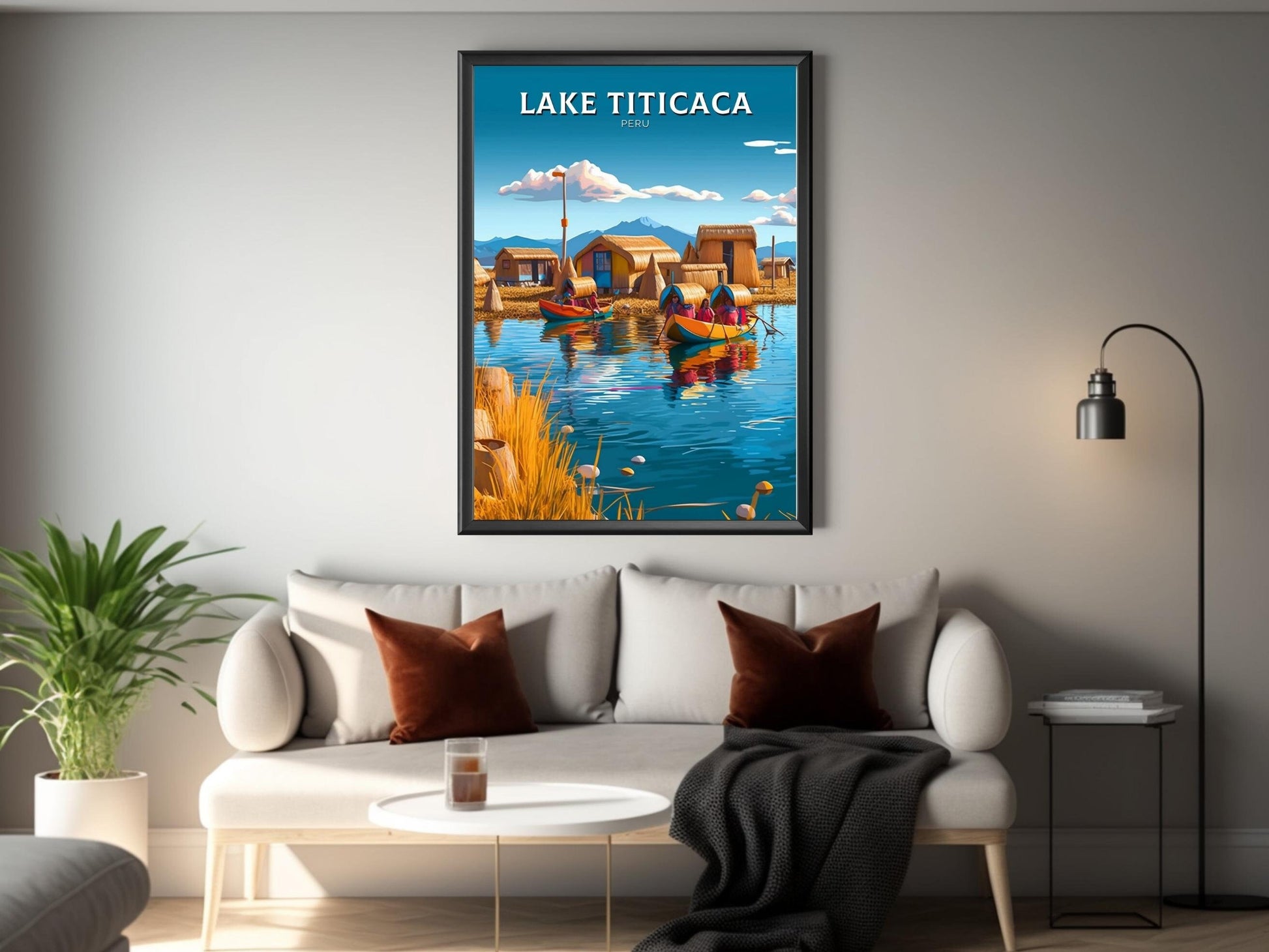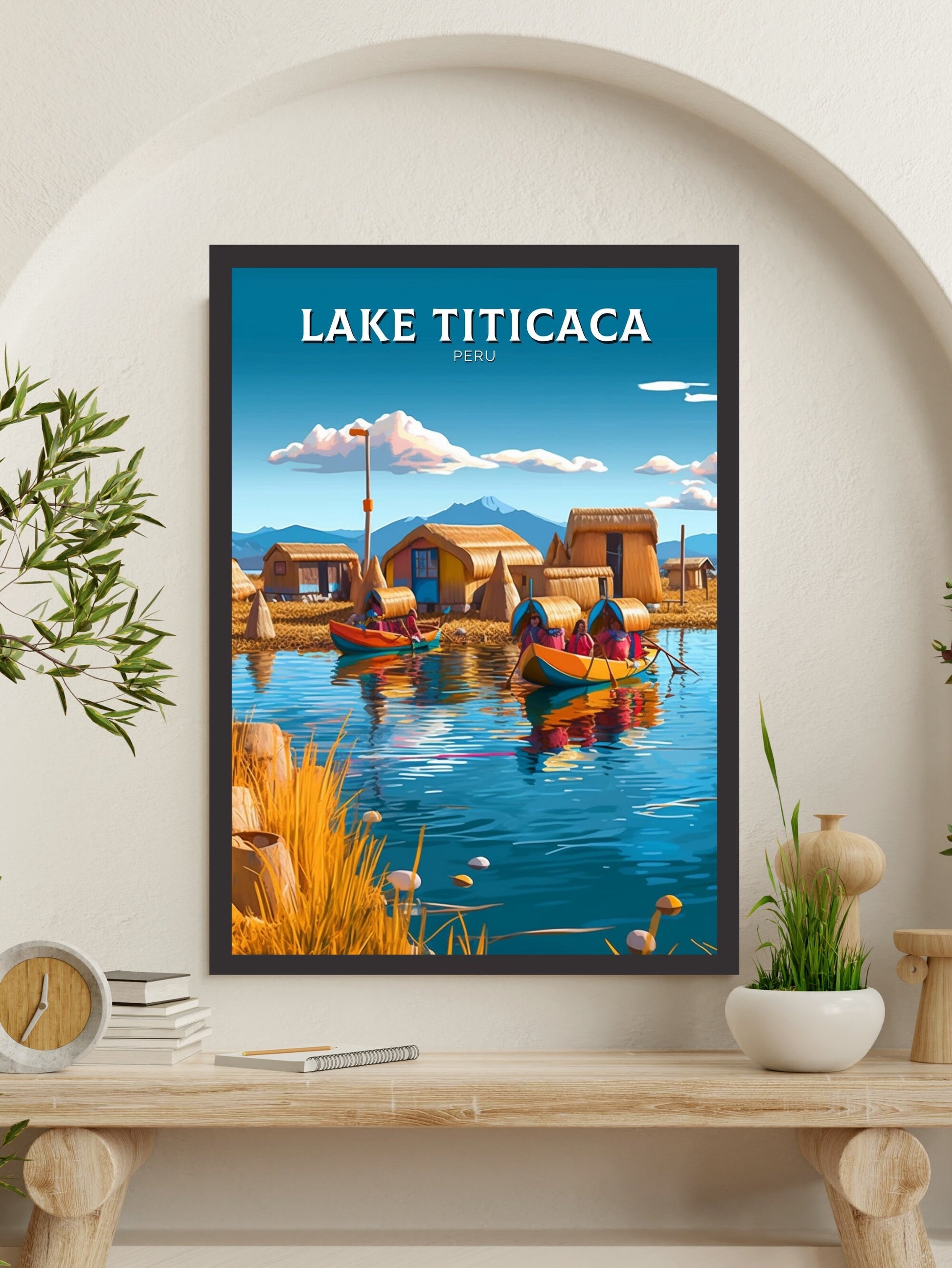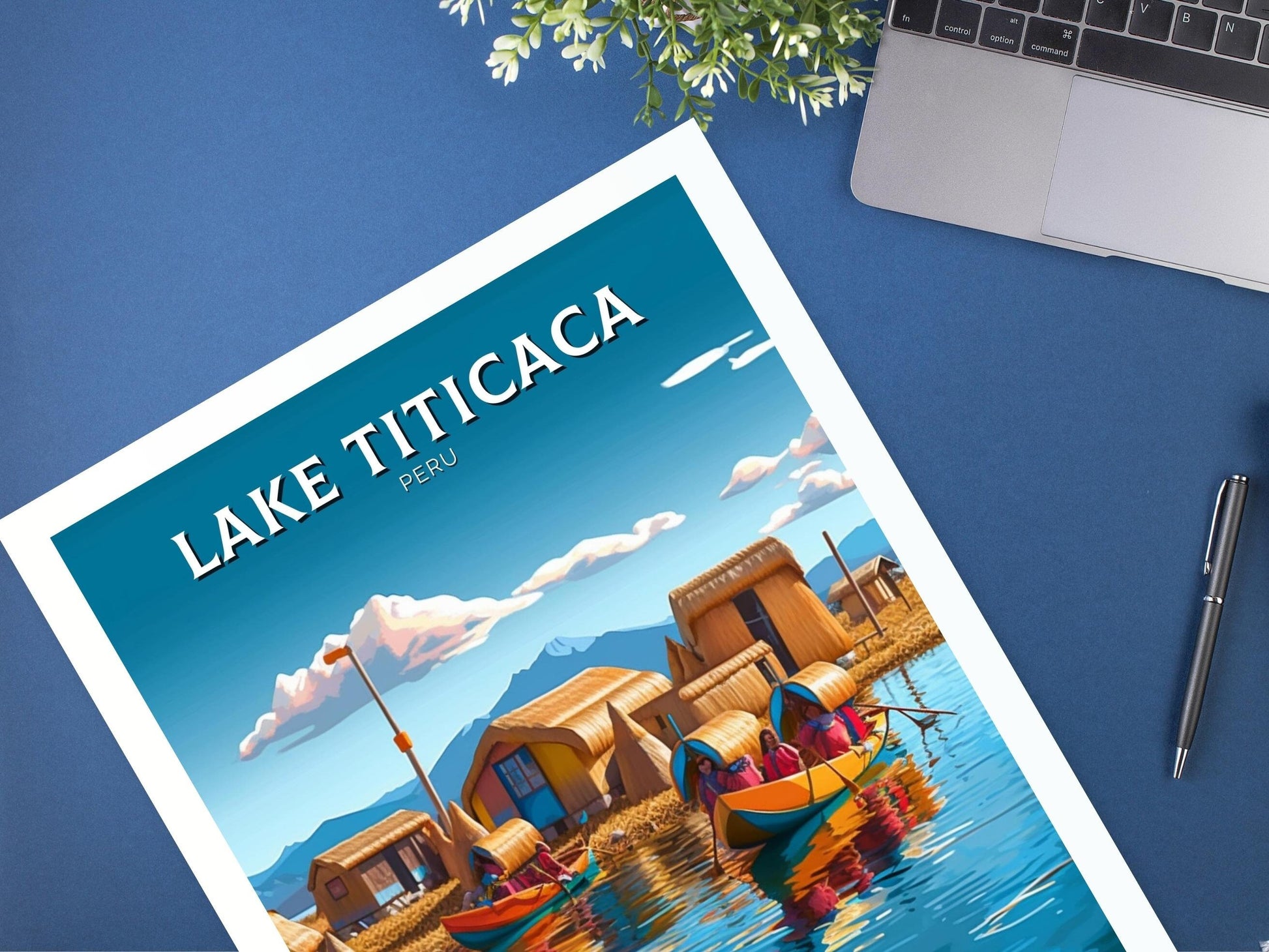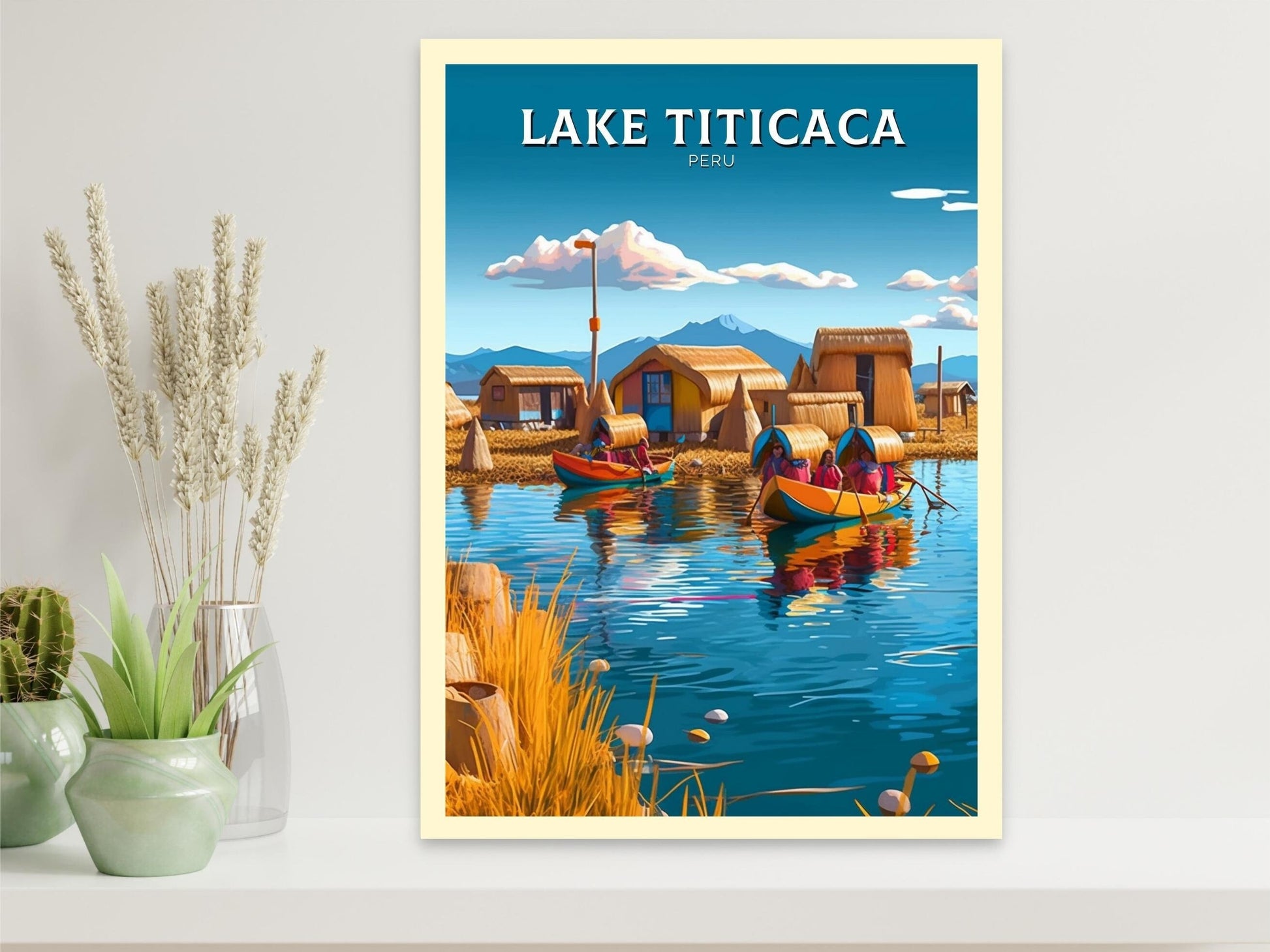 Notre affiche de voyage du lac Titicaca – Art rétro andin – plonge votre intérieur dans la beauté sereine du lac Titicaca, à cheval entre le Pérou et la Bolivie, grâce à son design nostalgique. Idéale pour les passionnés de voyages et les amateurs d'art rétro, elle capture les eaux d'un bleu profond et les îles flottantes des Uros avec un style intemporel. Que vous ayez navigué sur ses étendues ou rêvé de son calme, cette affiche rétro Titicaca sera un ajout magnifique à votre décoration.