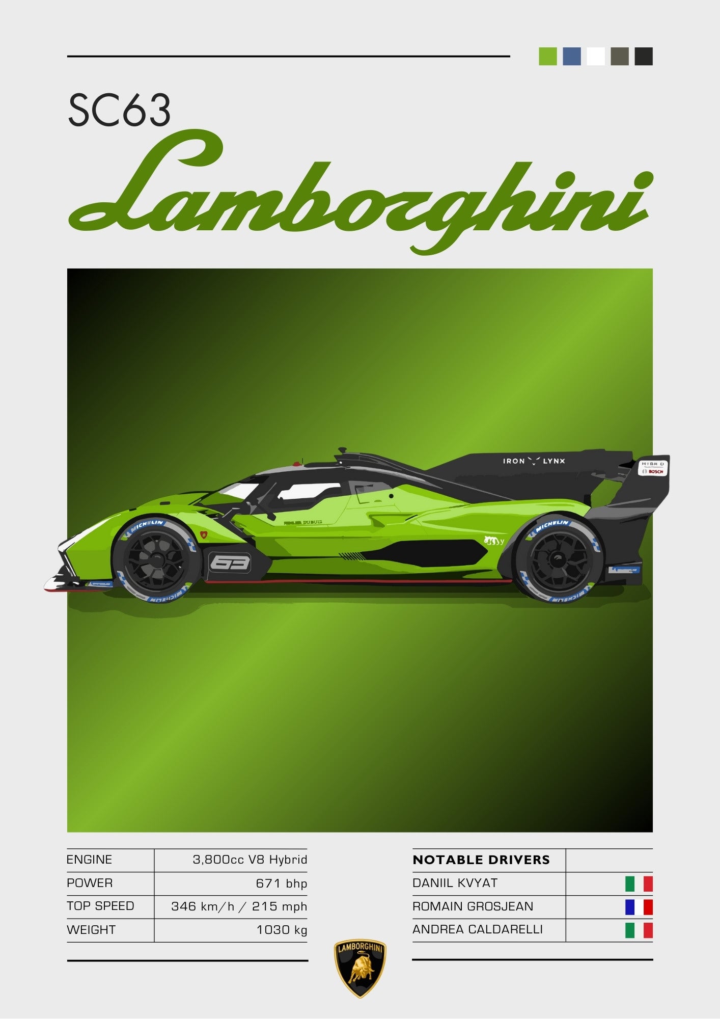 L' affiche Lamborghini SC63 est un incontournable pour les fans du Mans, les passionnés d'endurance et les passionnés de supercars . Exposée seule ou en collection, elle rend hommage à la quête de victoire de Lamborghini sur la scène automobile la plus mythique du monde.