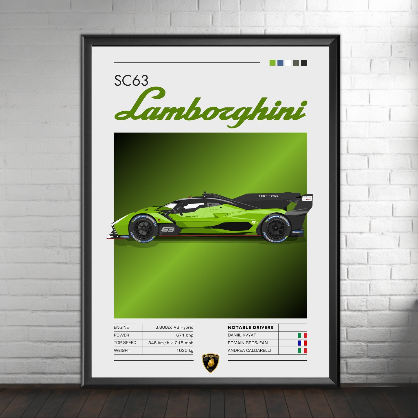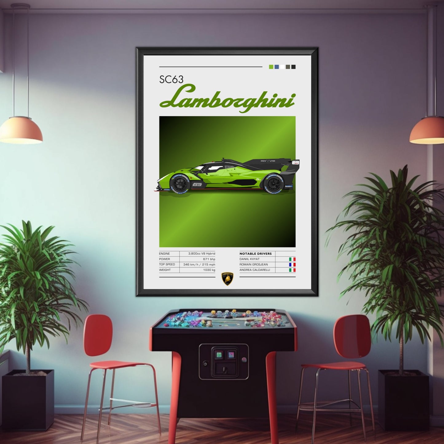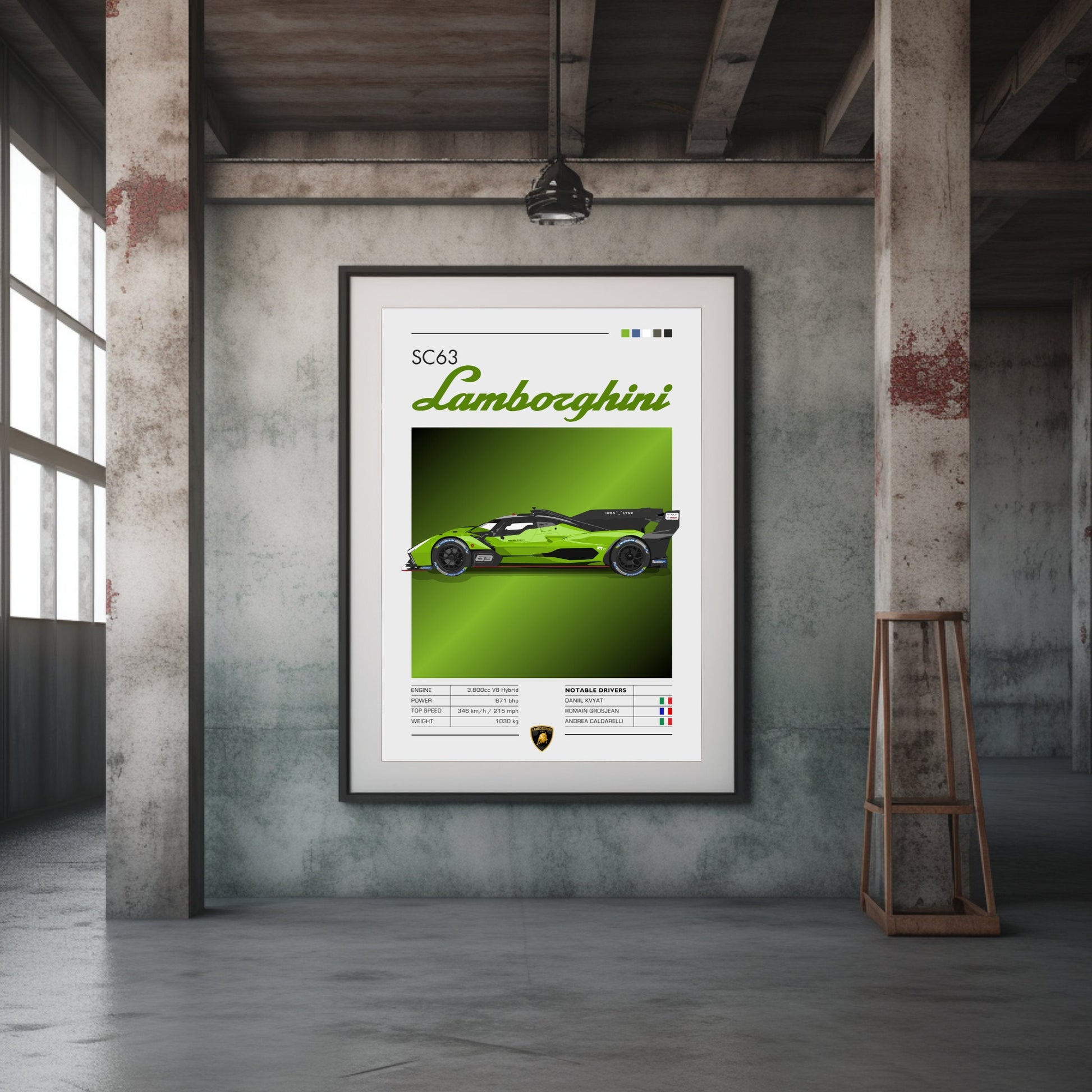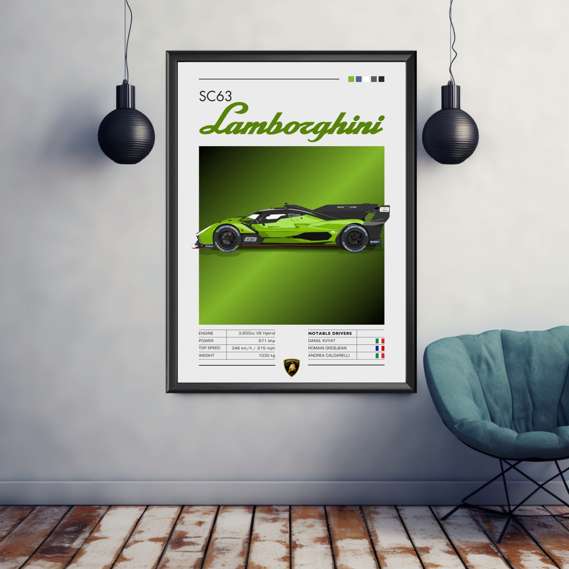 Introduisez l'endurance moderne dans votre intérieur avec l' affiche Lamborghini SC63 – Décoration murale Le Mans Hypercar pour les fans de course . Illustrant l'entrée remarquée de Lamborghini dans la catégorie reine de l'endurance, cette œuvre capture la puissance, le design et l'esprit futuriste de l'Hypercar SC63.