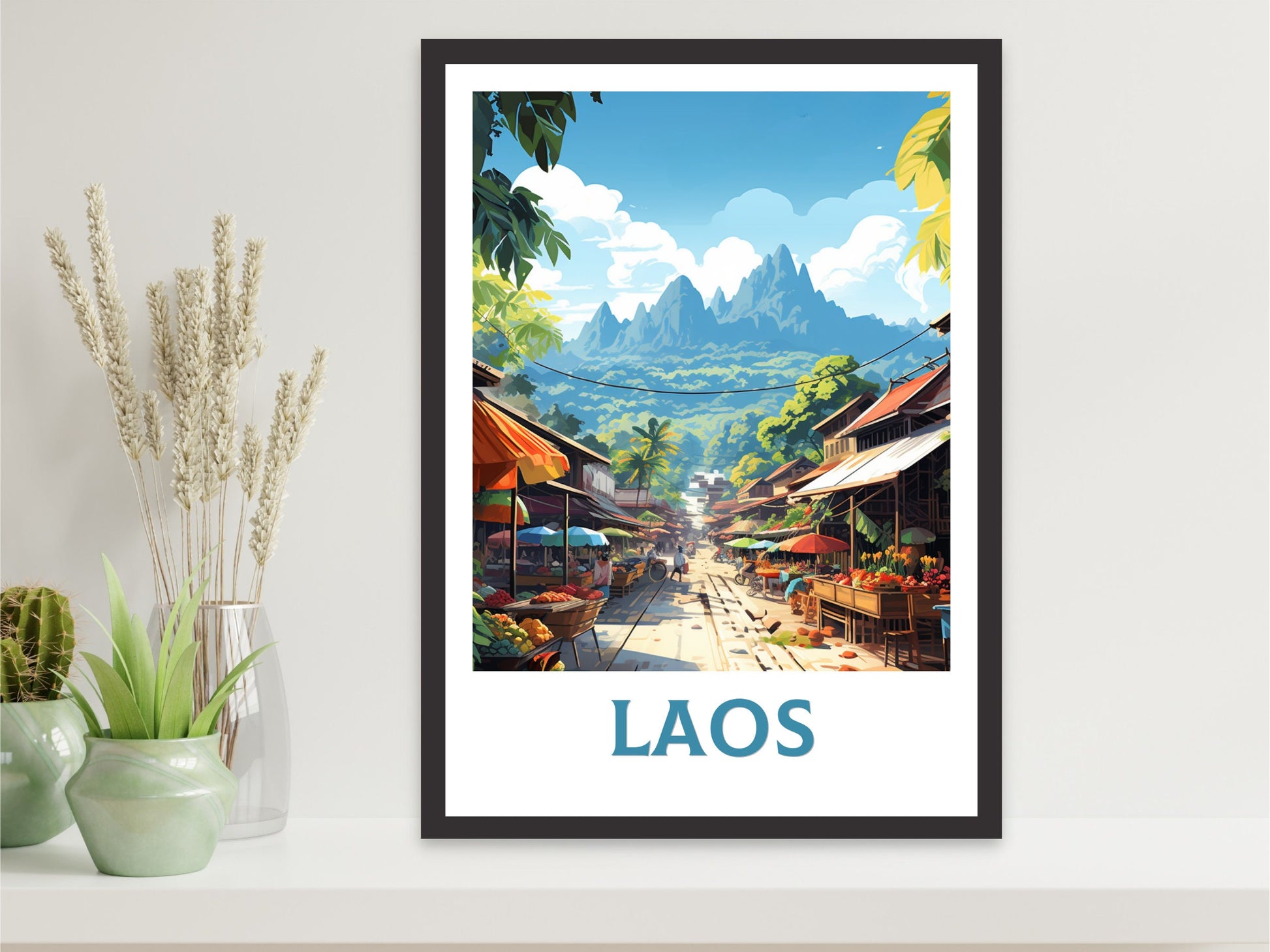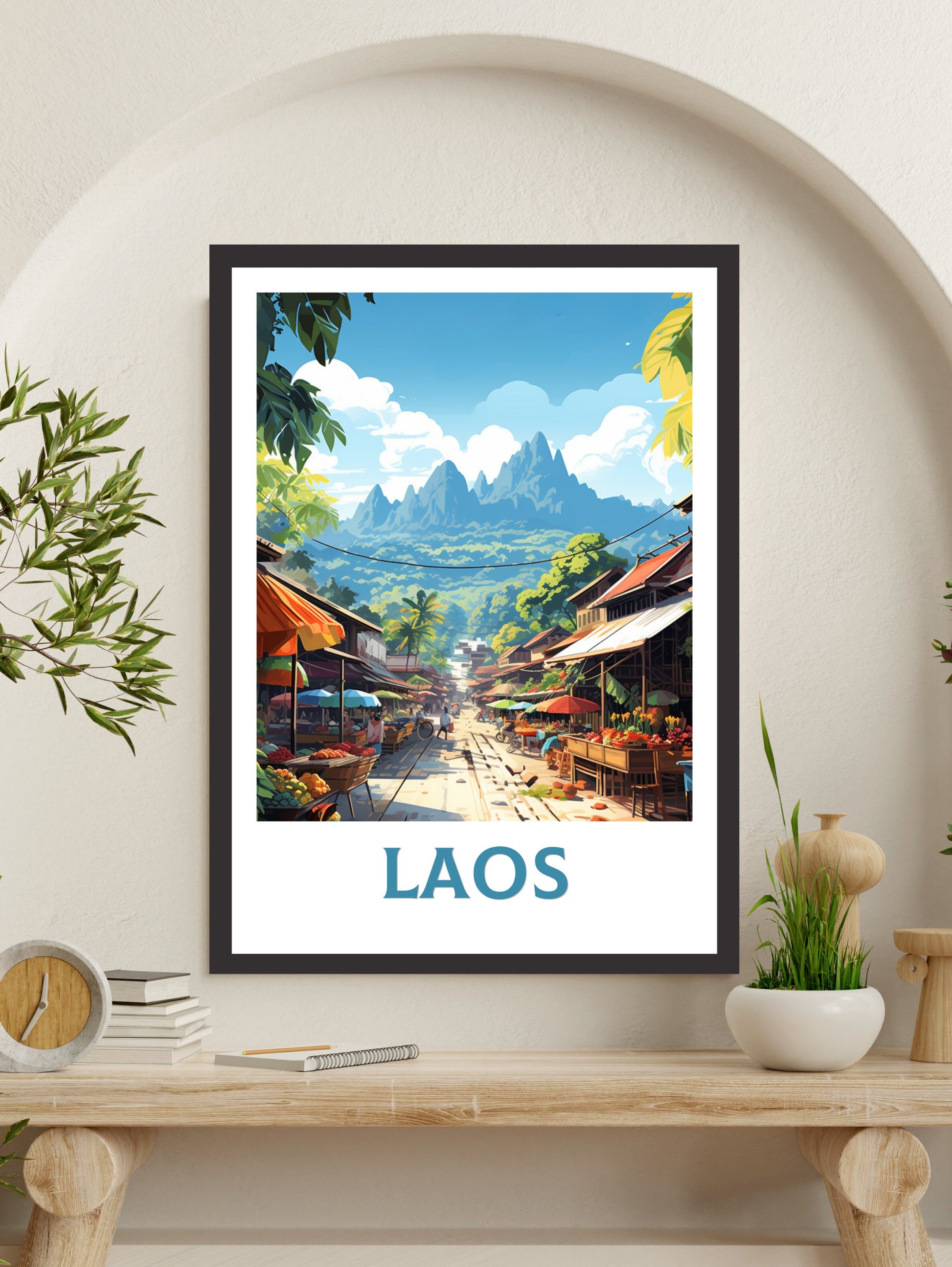 Notre affiche Laos – Illustration de voyage – transporte votre intérieur dans la beauté paisible du Laos grâce à son design captivant. Idéale pour les passionnés de voyages et les amateurs d'art, elle capture avec force détails la jungle luxuriante, les temples dorés et le Mékong du pays. Que vous ayez exploré son calme ou rêvé de sa sérénité, cette affiche de voyage du Laos sera un ajout remarquable à votre décoration.