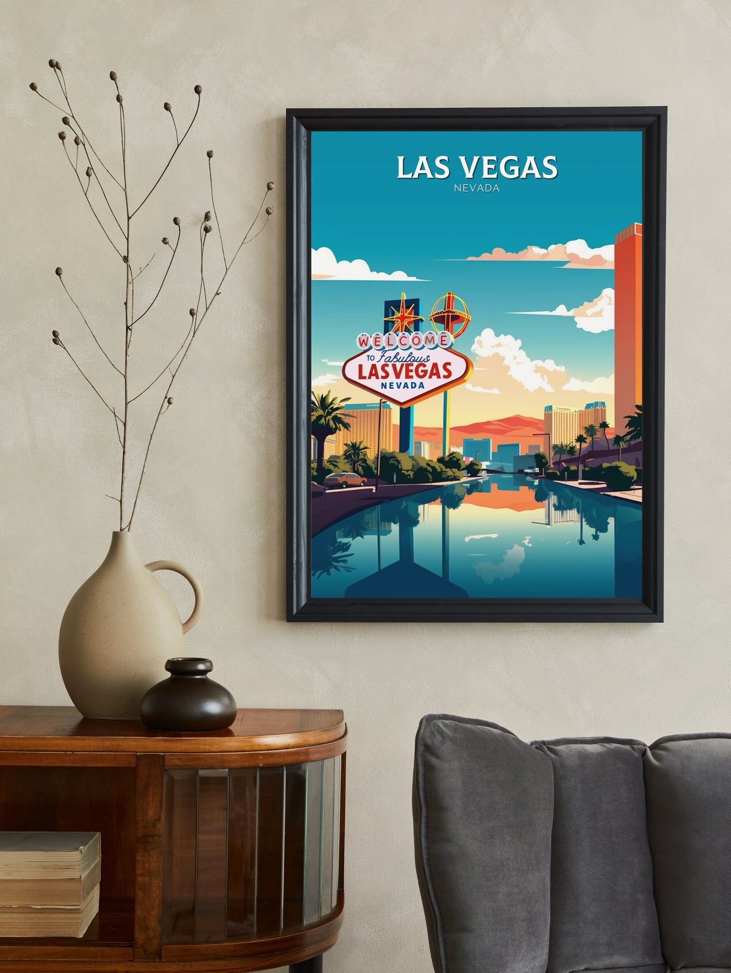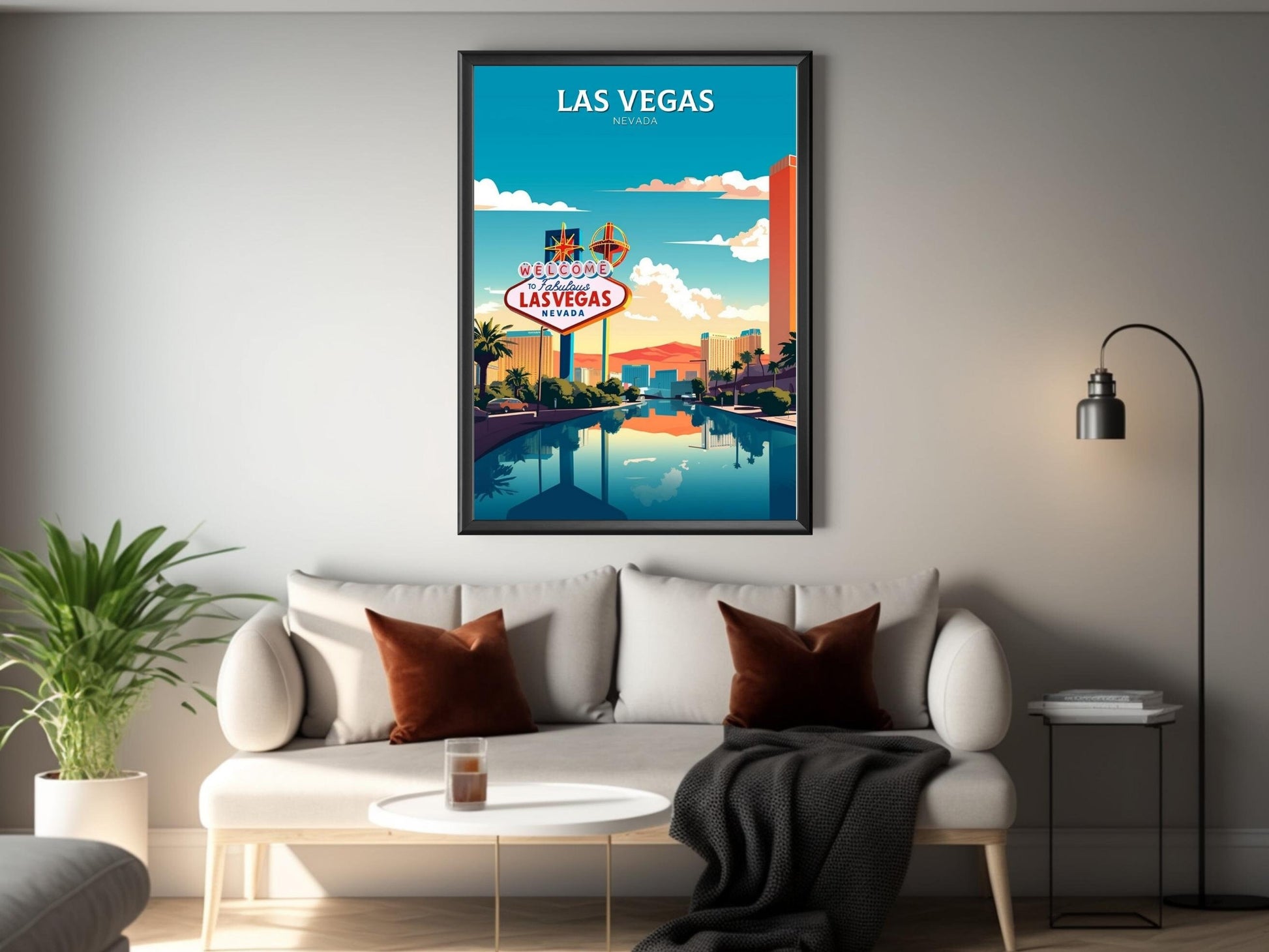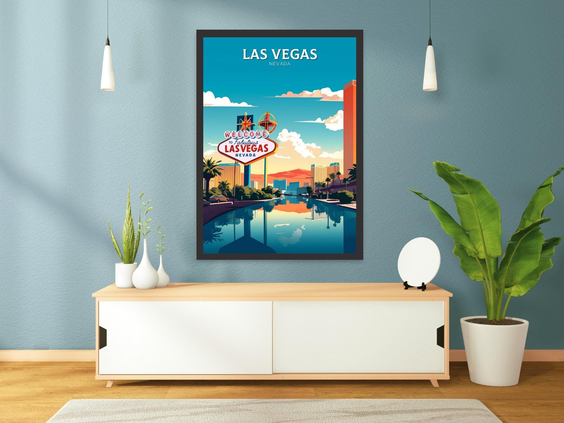Cette affiche de Las Vegas illumine vos murs avec ses néons rétro et le faste du désert, témoin du passé de la « Ville du péché ». Elle dépeint un paysage classique du Strip de Las Vegas, vibrant de charme d'antan.
