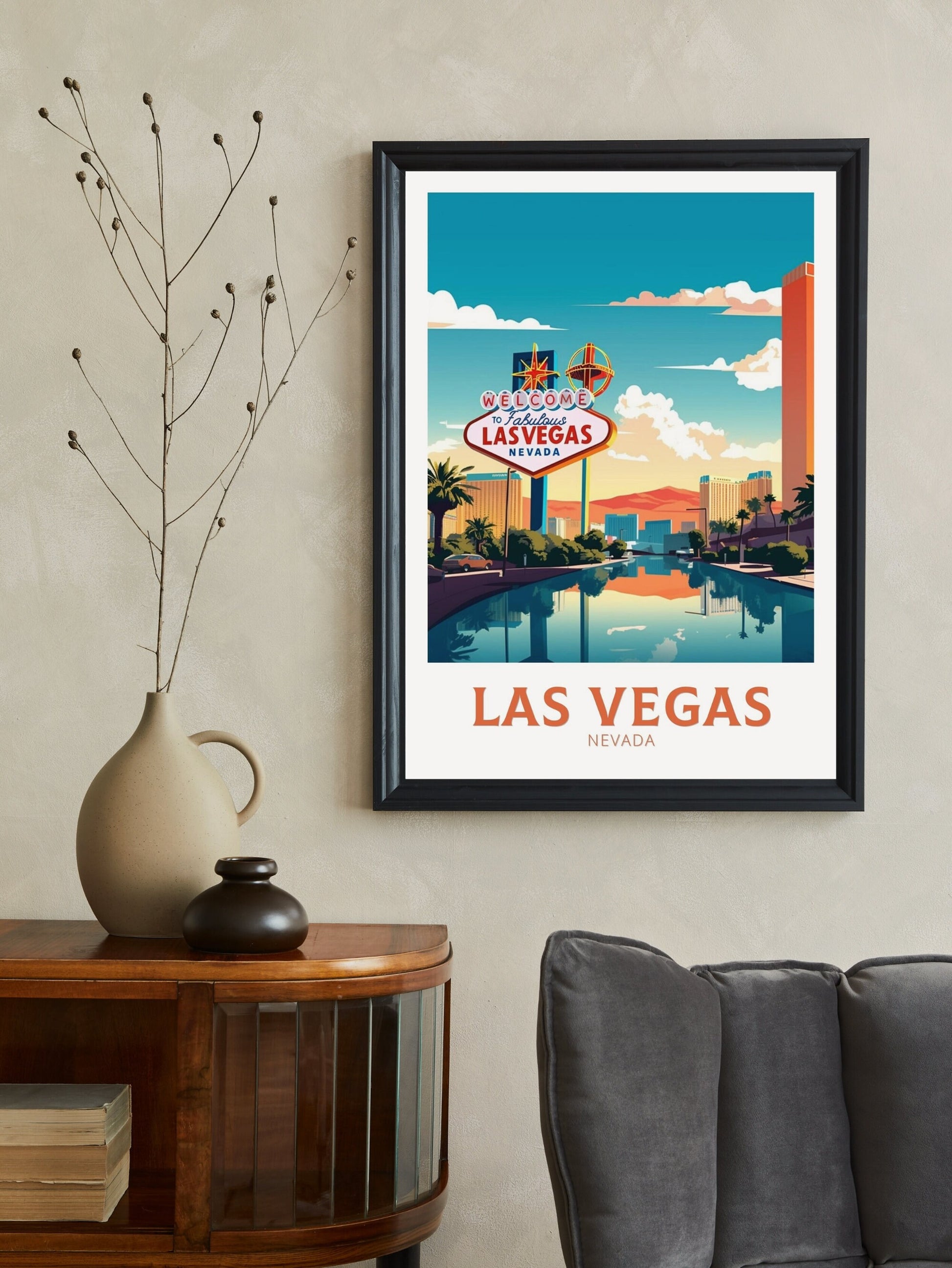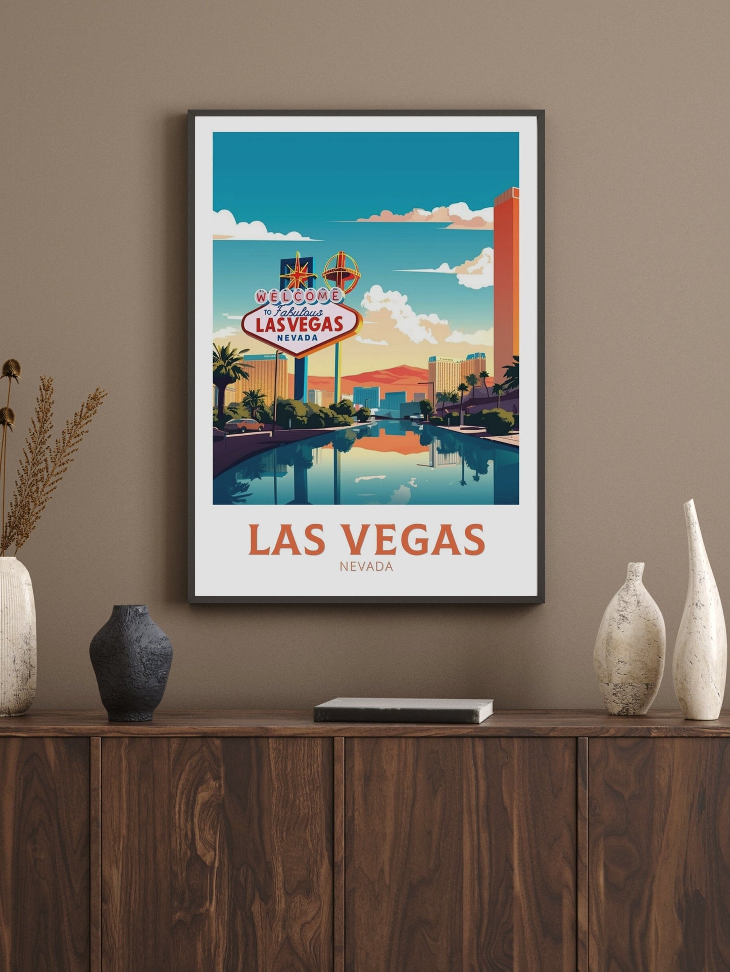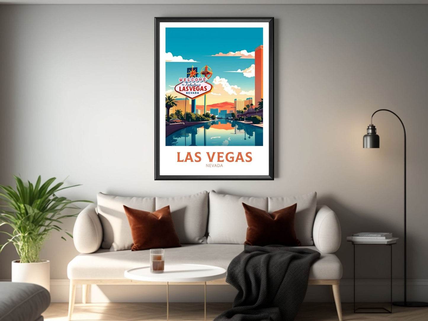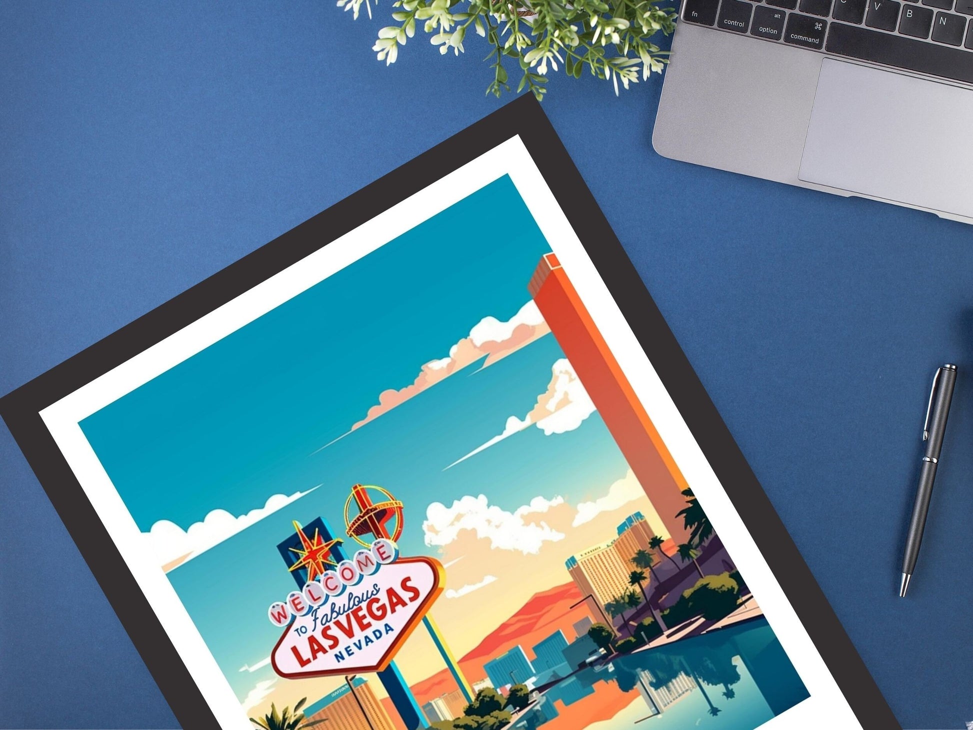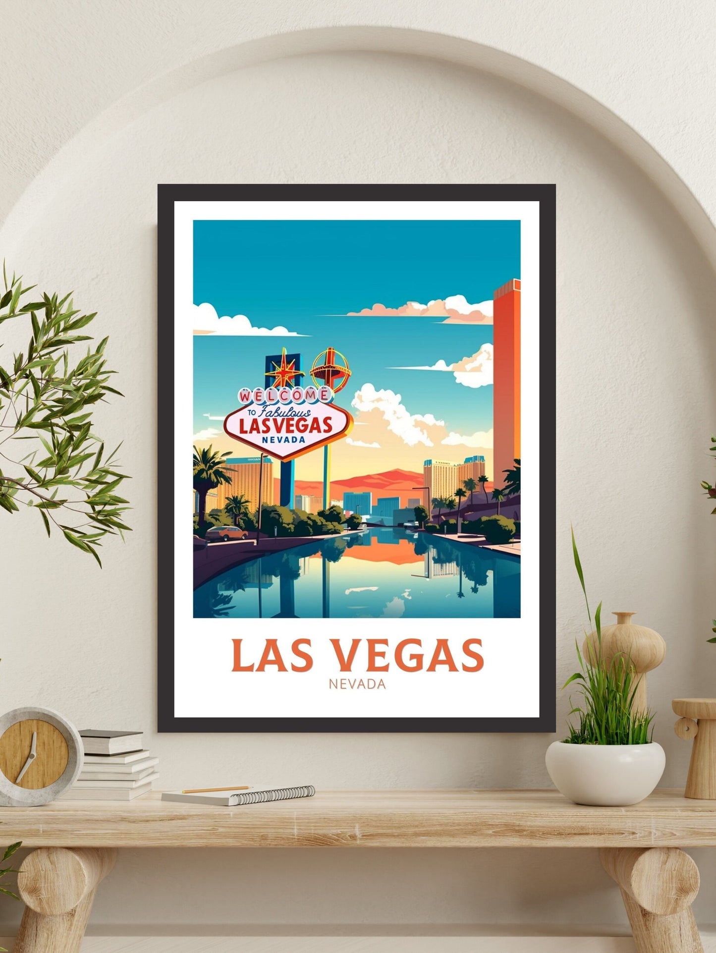 Disponible en téléchargement numérique et en tirage physique premium , cette affiche de voyage Las Vegas est disponible en plusieurs formats, des formats de série A aux grands formats 76 x 102 cm. Imprimée sur un papier de haute qualité aux couleurs vives et aux détails précis, elle constitue une décoration remarquable ou un cadeau attentionné pour tous ceux qui sont inspirés par l'énergie et l'effervescence de Las Vegas.