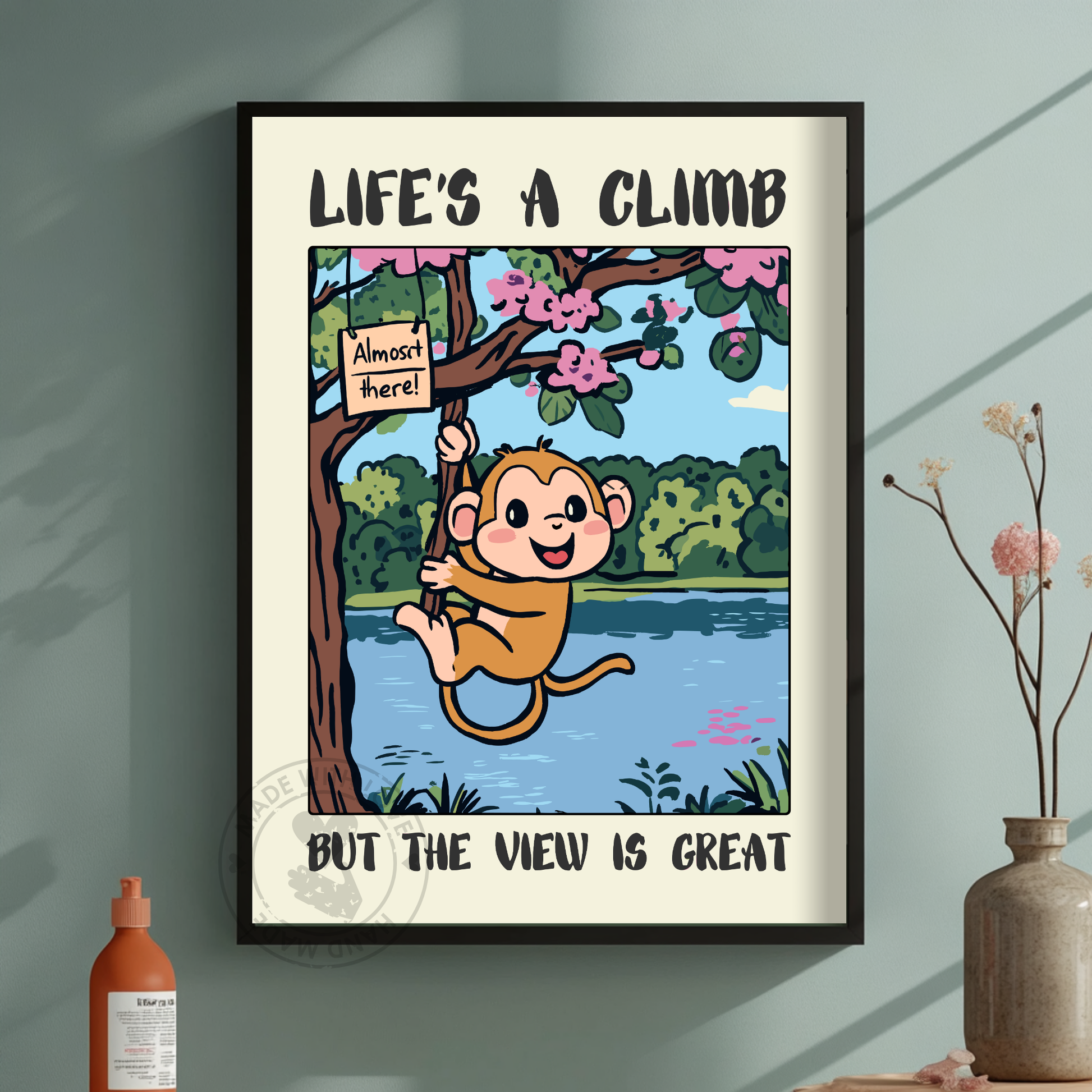 L'affiche « Cette vie est une ascension, mais la vue est magnifique » représente un singe maladroit perché en hauteur, affichant un large sourire. Elle dessine un grimpeur effronté se prélassant au sommet d'une branche, savourant la victoire.