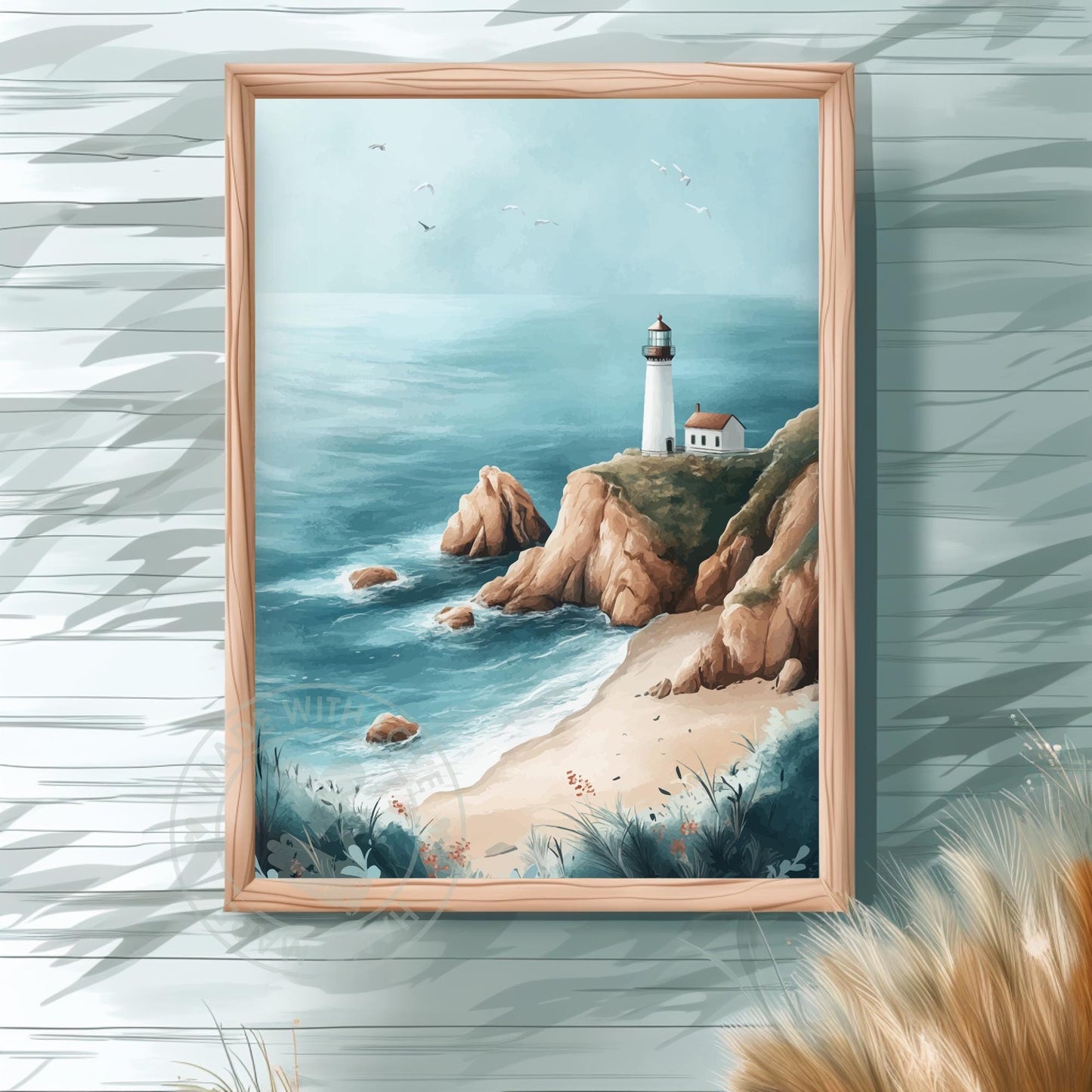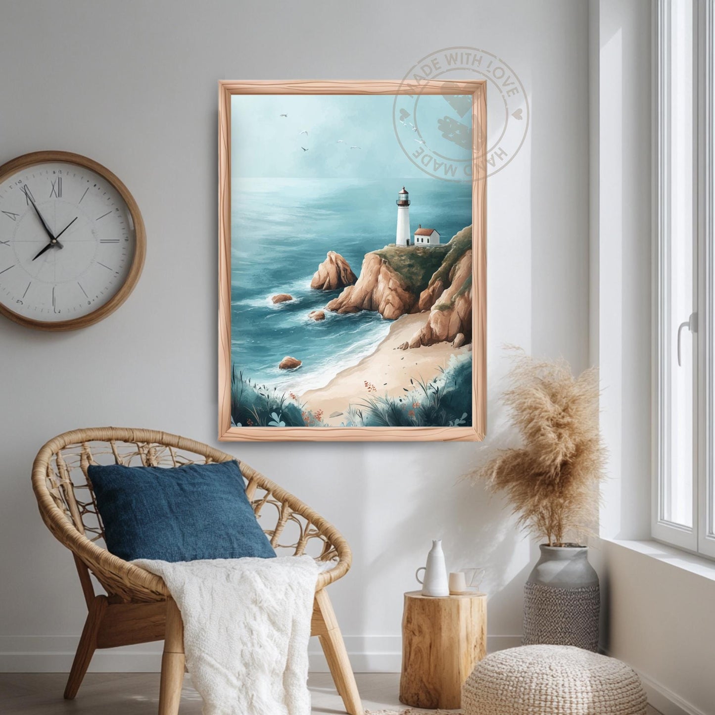 Notre affiche Phare - Beach House Artwork vous transporte vers la sérénité des rivages avec son design intemporel. Idéale pour les amoureux du littoral et les passionnés de décoration, elle met en scène un phare majestueux se dressant sur un fond de dunes de sable et de vagues. Que vous décoriez une maison de plage ou que vous recherchiez le charme du bord de mer, cette affiche Phare Plage embellira votre intérieur.