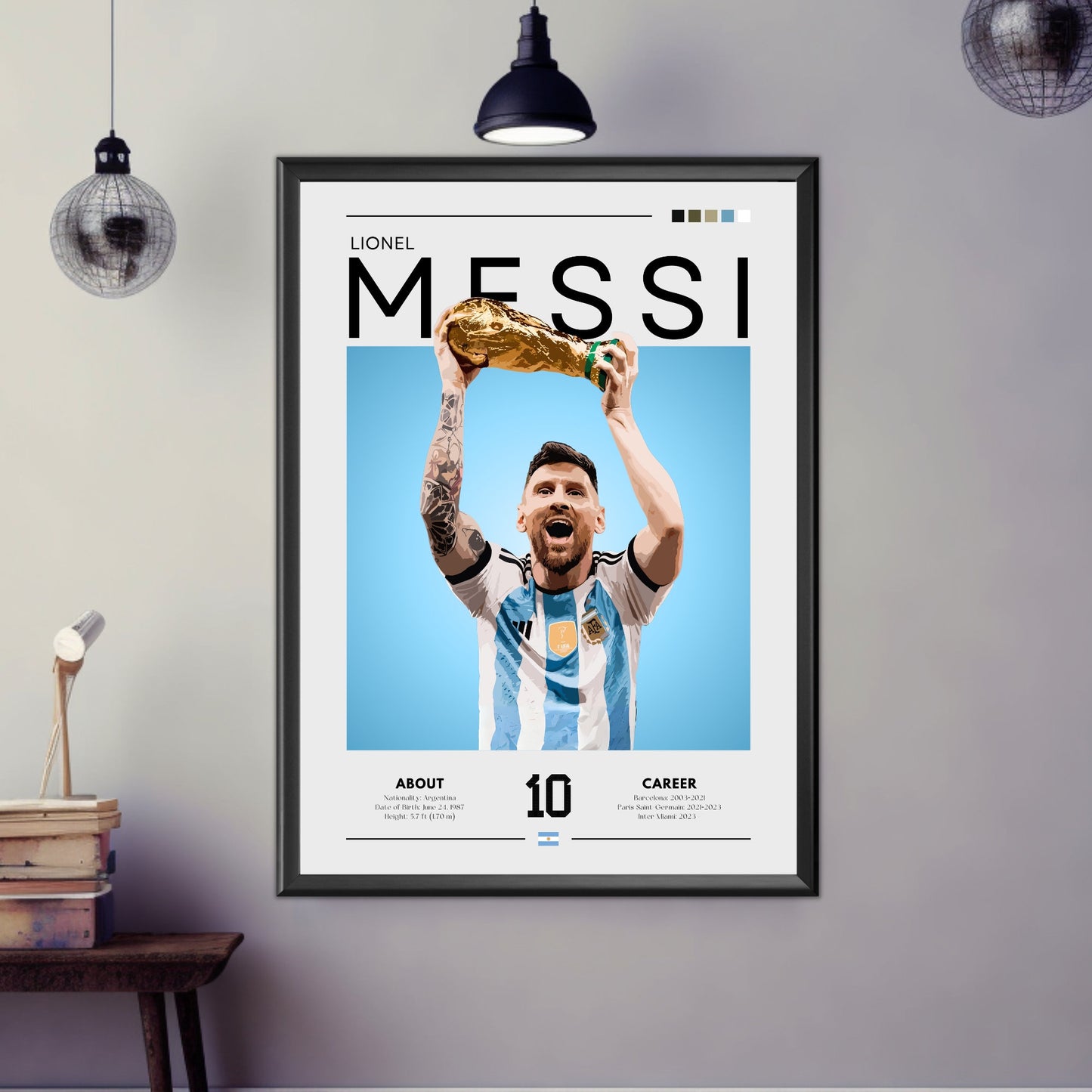 Que vous soyez un fervent supporter de Messi ou que vous appréciiez simplement la beauté du jeu, cette affiche est une célébration visuelle de l'histoire du football. Sublimez votre espace avec l'aura de la victoire, tandis que Messi brandit la Coupe du Monde, capturant l'essence d'une légende du football et un moment marquant de l'histoire du sport.