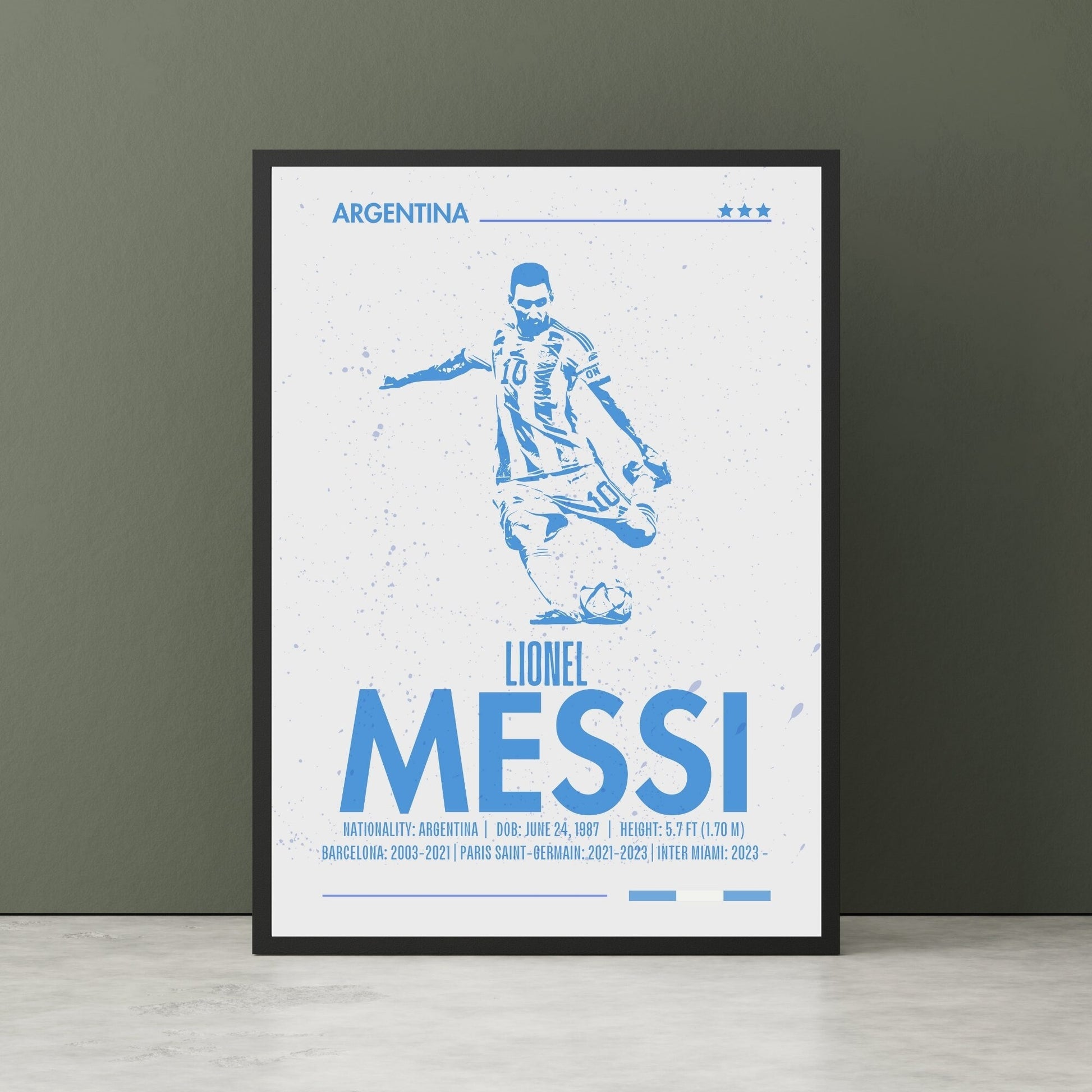Cette œuvre d'art exquise n'est pas qu'une simple affiche ; c'est un hommage au magicien qui a fasciné des générations. Le centre de gravité bas, caractéristique de Messi, ses dribbles insaisissables et son talent indéniable de buteur sont gravés à jamais en bleu clair, nous rappelant son influence incomparable sur le football.