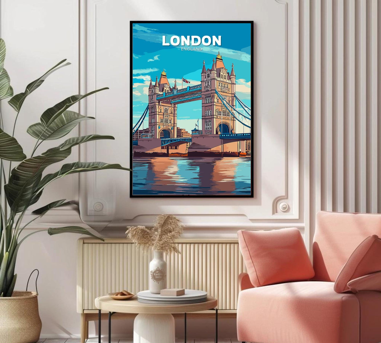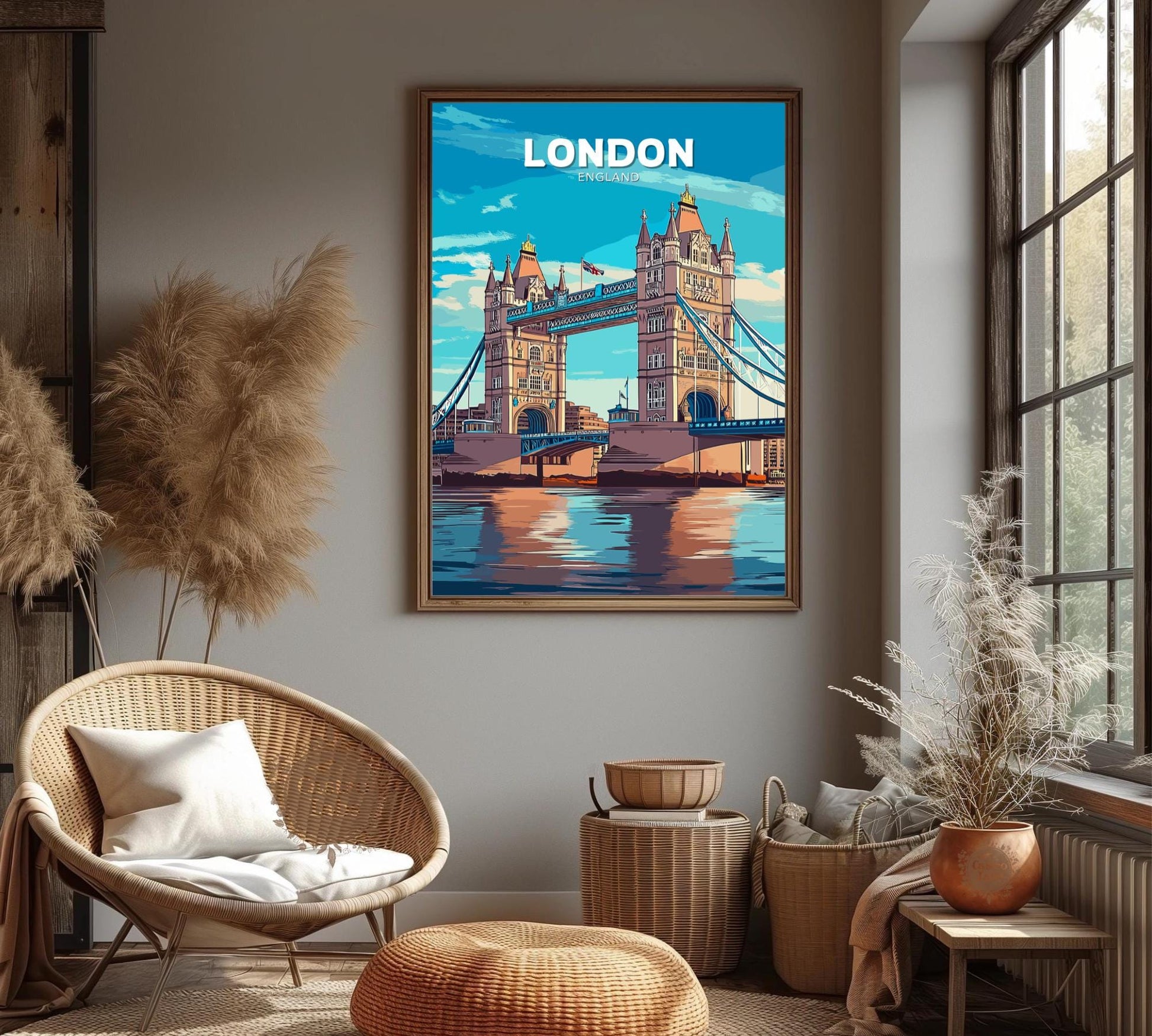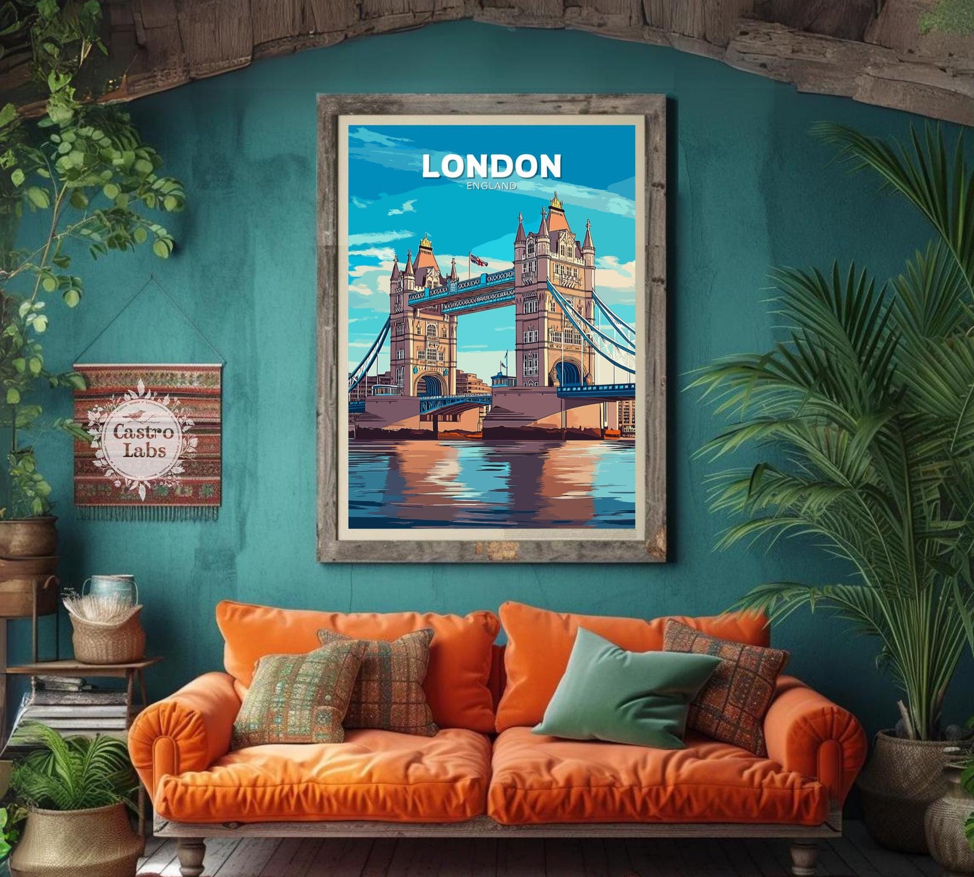 Cette œuvre mêle des teintes classiques à l'esprit londonien, capturant la grâce historique du pont au cœur de l'énergie urbaine. Imprimée sur un papier de qualité supérieure, elle offre une vivacité durable et une finition soignée, ce qui en fait un cadeau idéal pour les anglophiles ou les amoureux de la ville. Cette affiche londonienne apporte une touche de sophistication royale à n'importe quel espace.