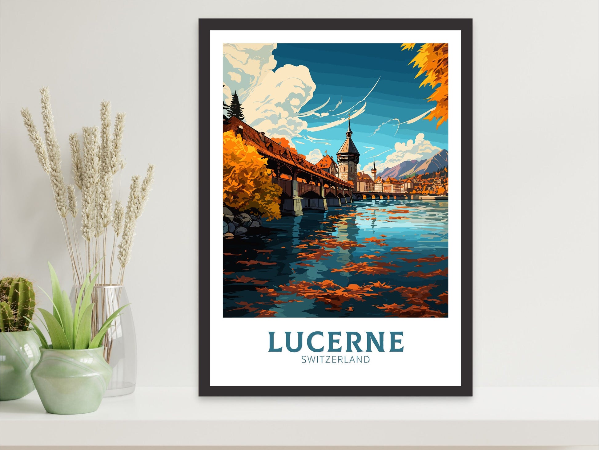 Découvrez le charme de la pittoresque ville suisse avec cette affiche de voyage de Lucerne , mettant en valeur des monuments emblématiques comme le Pont de la Chapelle, le lac des Quatre-Cantons et les Alpes environnantes. Cette œuvre captivante reflète parfaitement la beauté sereine et le charme historique de Lucerne, ce qui en fait une œuvre idéale pour les amateurs de voyages en Suisse et de décoration murale élégante.