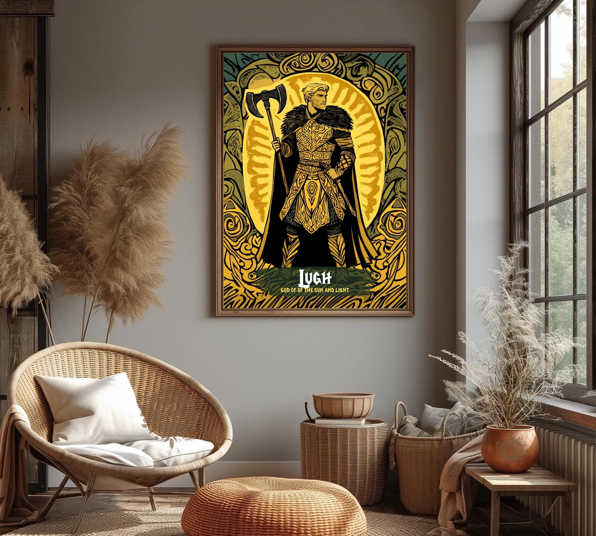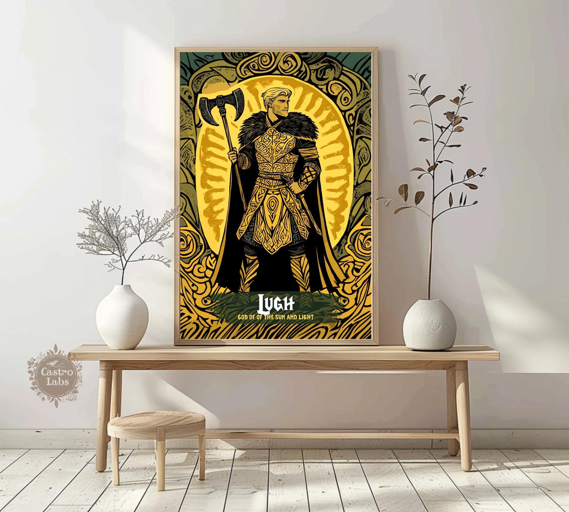 Armé d'une arme de lumière, ce dieu Lugh, maître celte des savoir-faire et de la moisson, envahit vos murs. Né des brumes tourbillonnantes des contes celtiques, il se dresse fièrement, tel un guerrier doré dont chaque posture vibre au rythme du triomphe et de l'artisanat.
