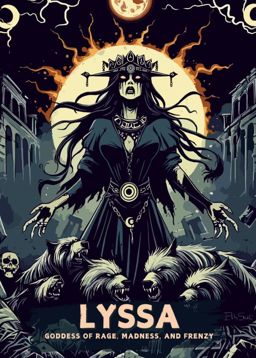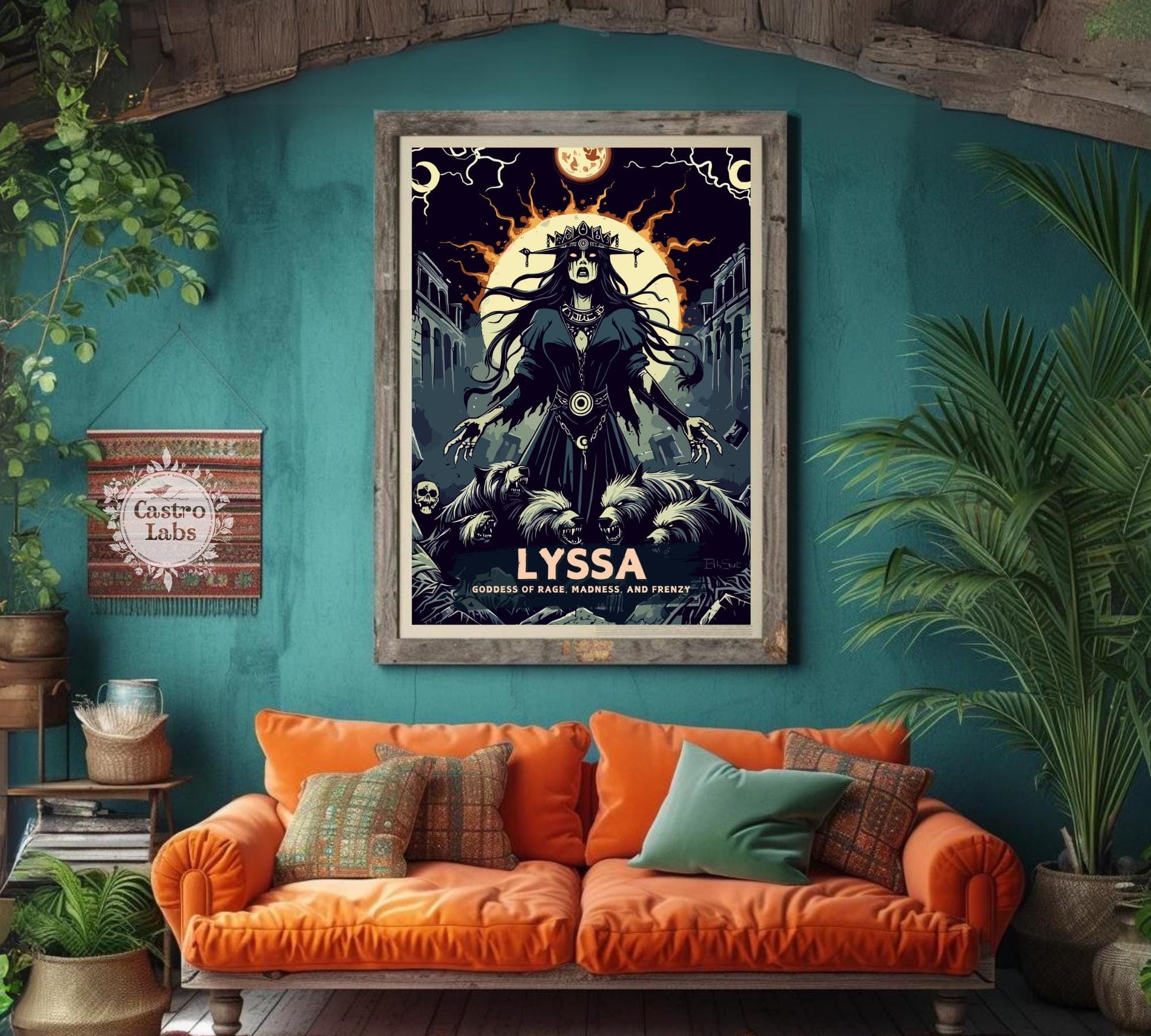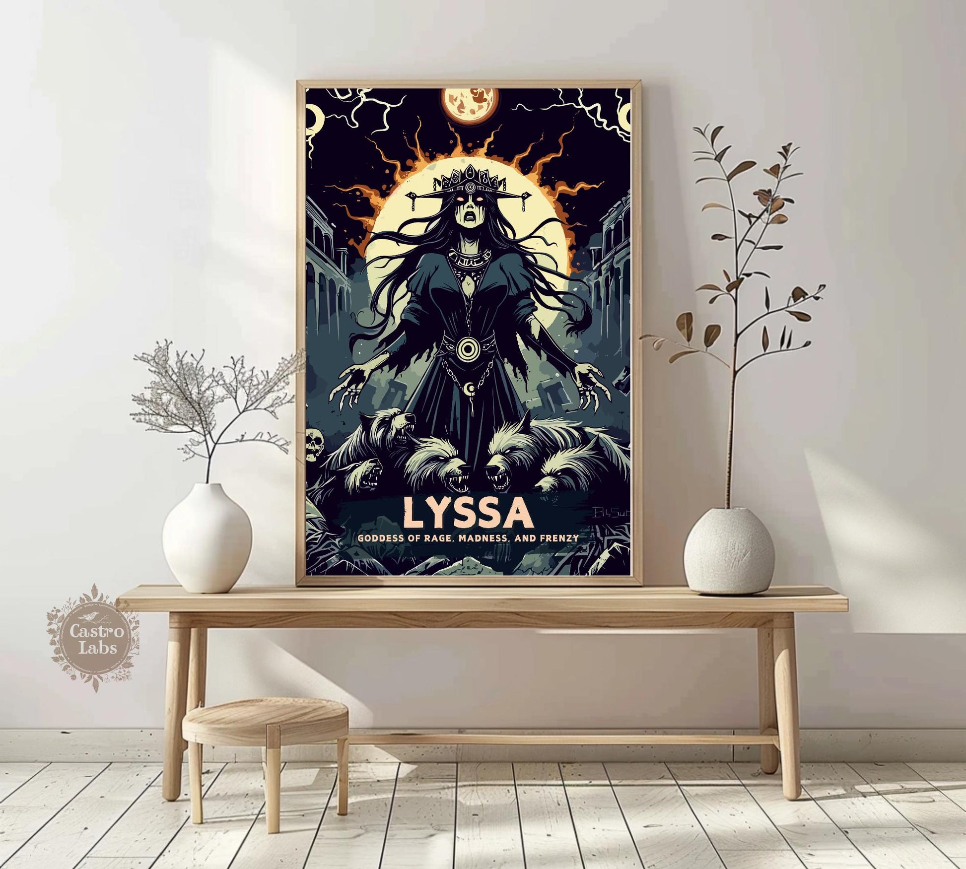 Cette affiche de la déesse grecque Lyssa incarne la fureur sauvage de Lyssa, déesse de la rage, dans un design féroce. Elle la représente avec une énergie indomptée, entourée de chaos, ancrée dans la mythologie grecque.