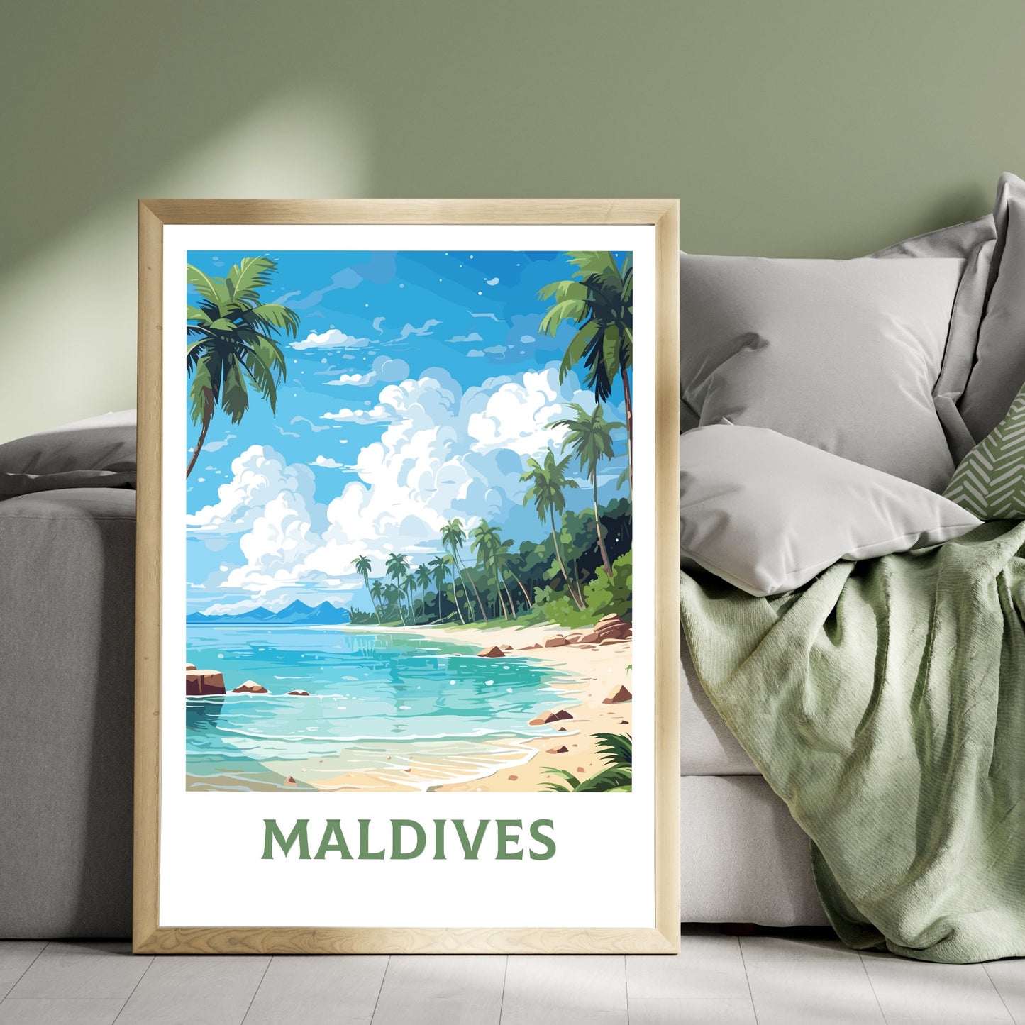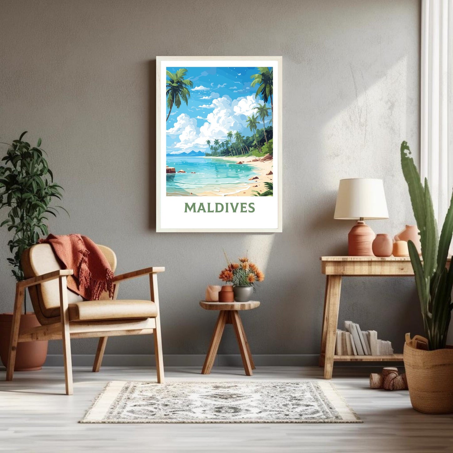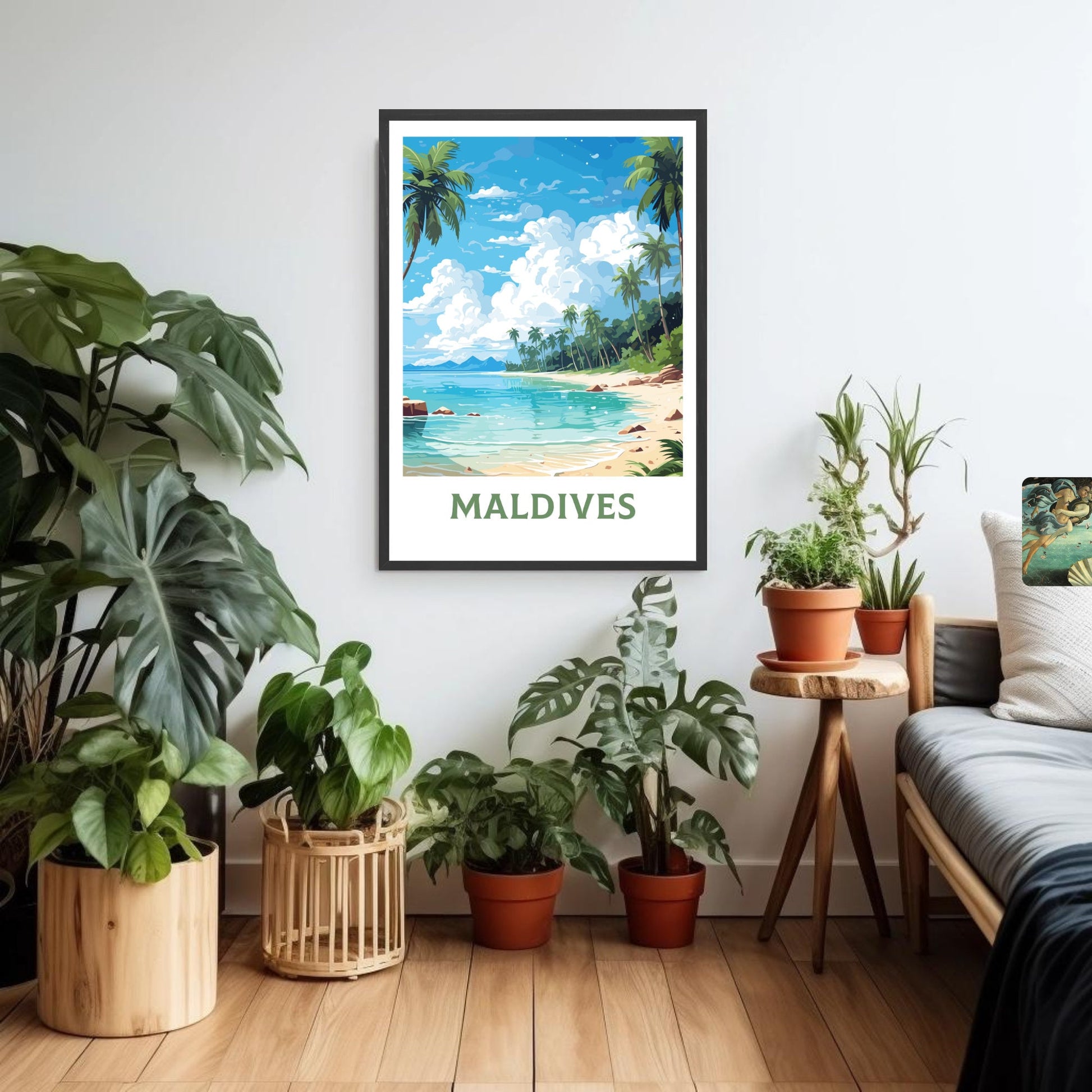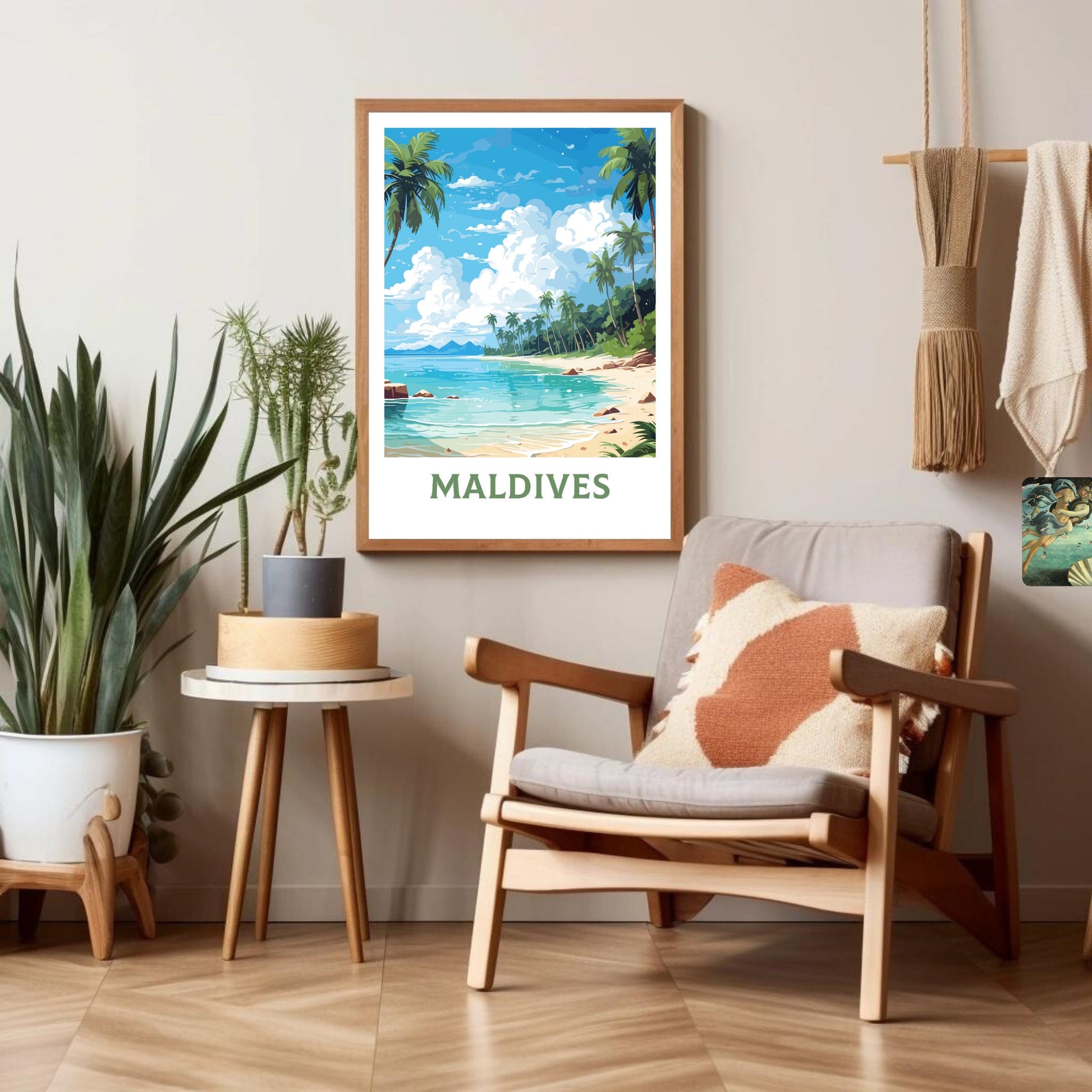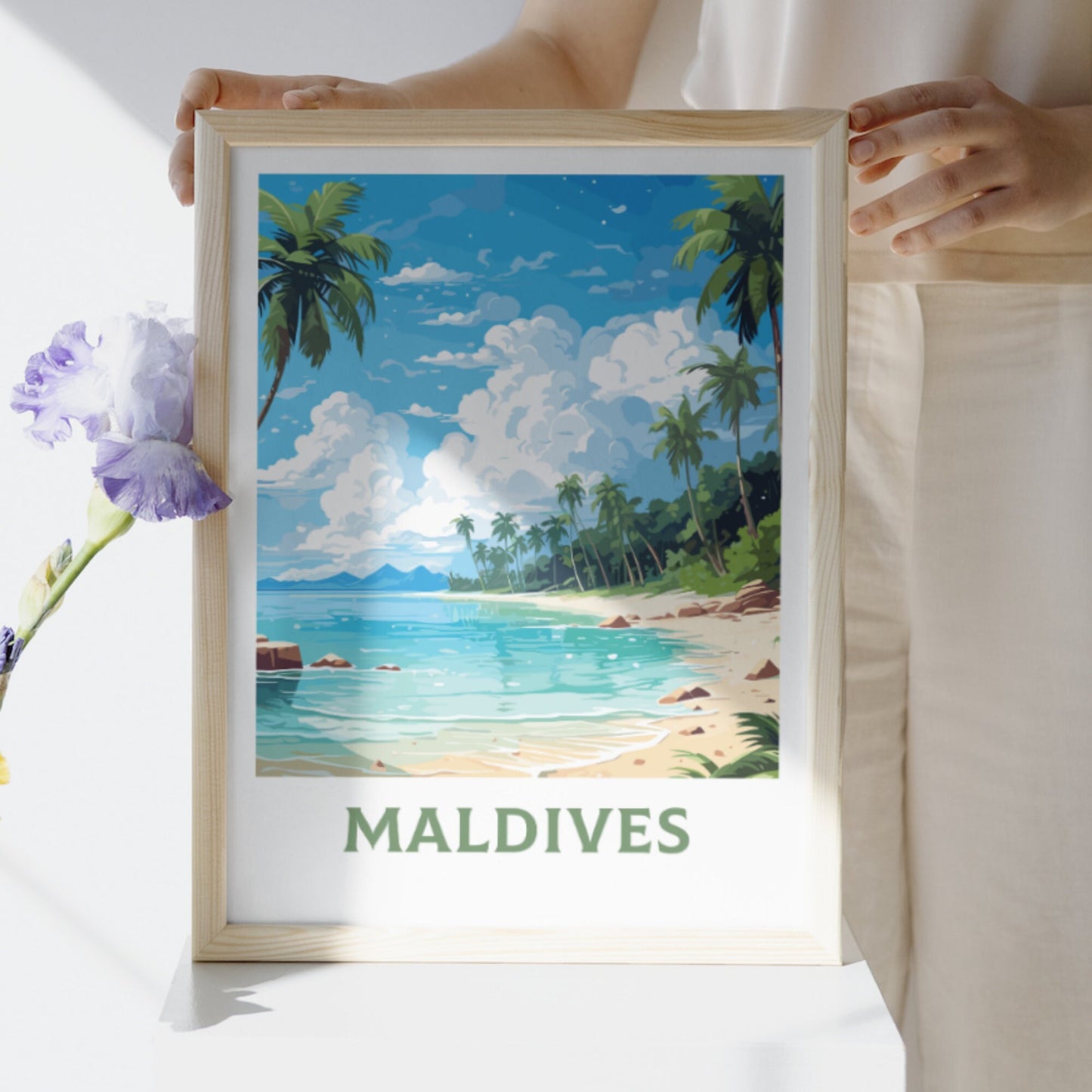 Notre affiche artistique Maldives - Design rétro des îles plonge votre intérieur dans le charme tropical des Maldives grâce à son design nostalgique. Parfaite pour les passionnés de voyages et les amateurs d'art rétro, elle capture les lagons turquoise et les rivages bordés de palmiers des îles avec un style intemporel. Que vous ayez profité de ses plages ou rêvé de paradis, cette affiche rétro des Maldives sera un ajout magnifique à votre décoration.