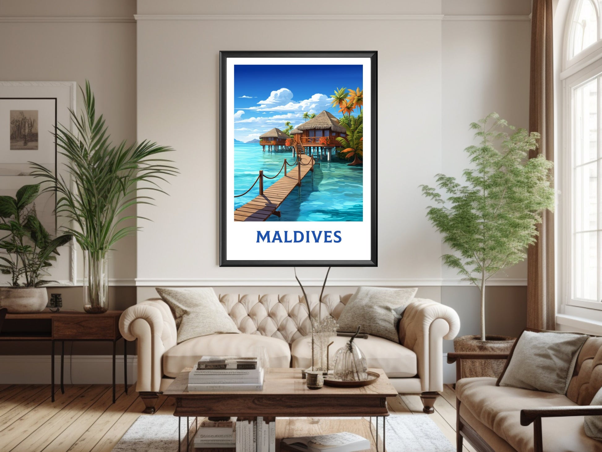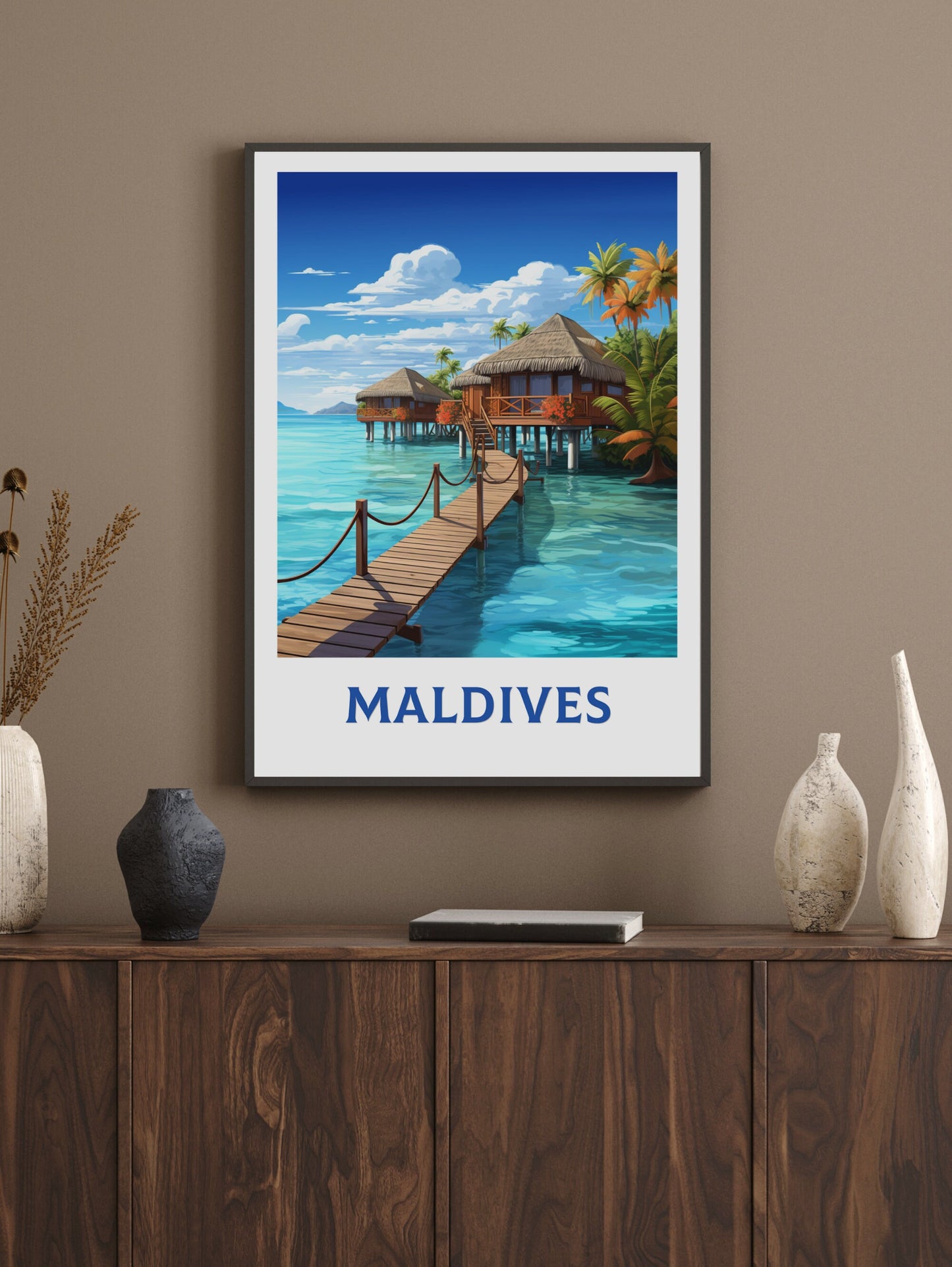 Cette œuvre mêle des bleus vibrants et des sables chauds à l'essence classique des Maldives, évoquant une ambiance de voyage vintage avec une touche de modernité. Imprimée sur un papier de qualité supérieure, elle offre un éclat durable et une finition lisse, ce qui en fait un cadeau idéal pour les aventuriers ou les collectionneurs d'art. Cette affiche des Maldives apporte une touche de nostalgie insulaire à tous vos murs.