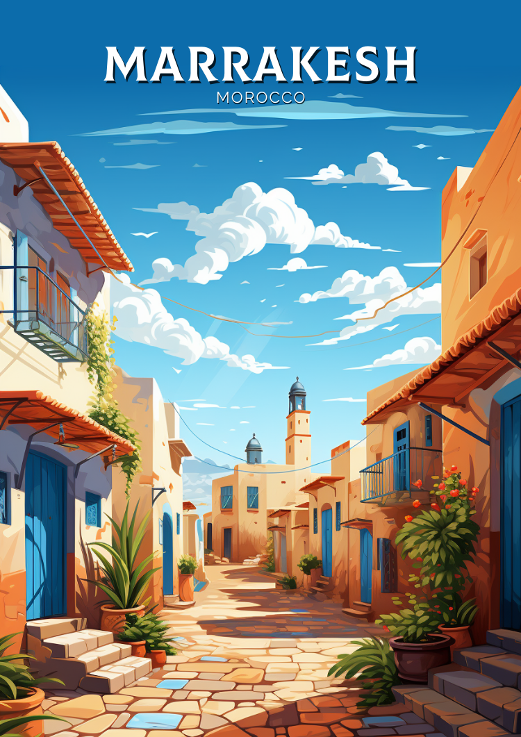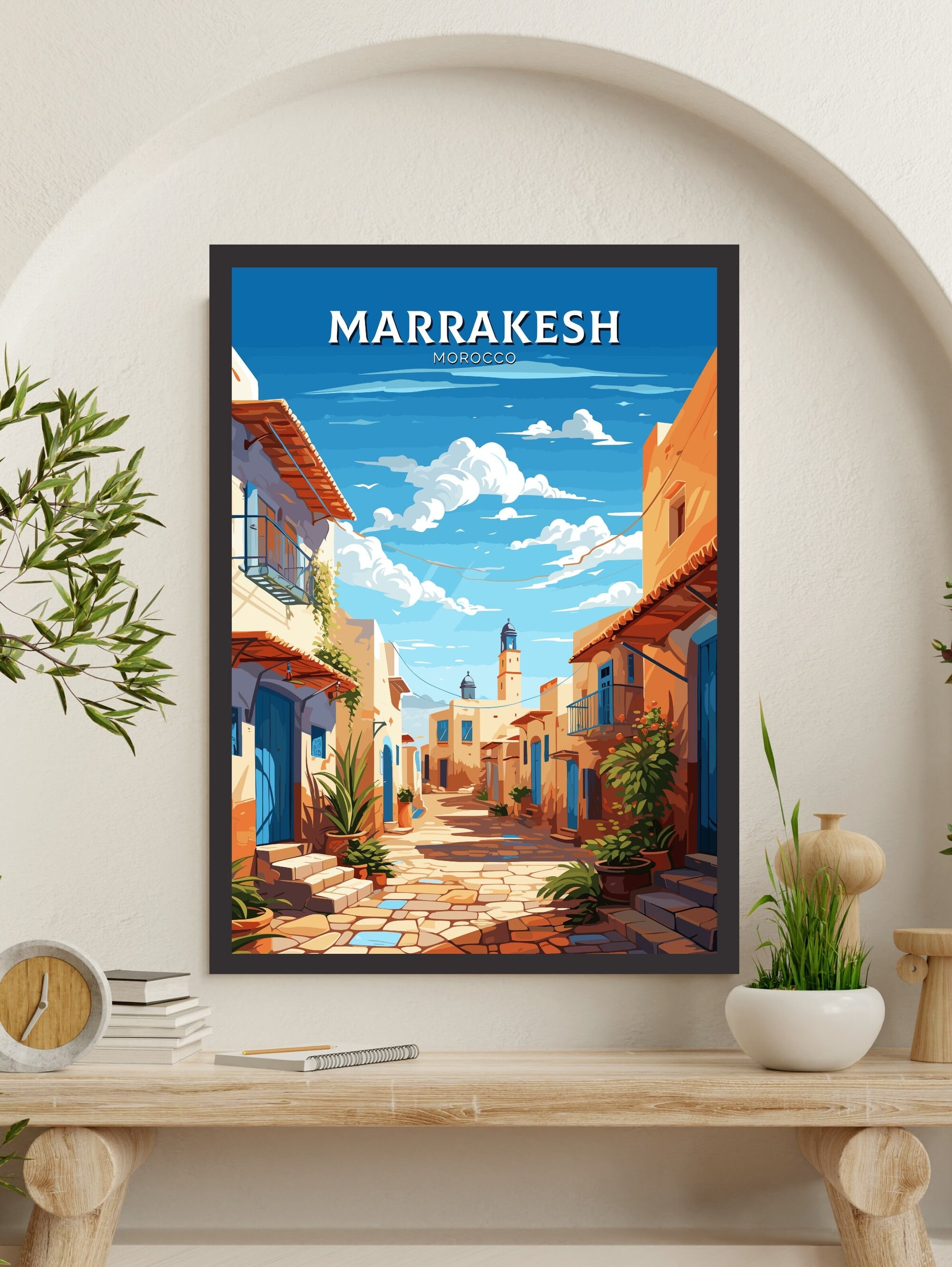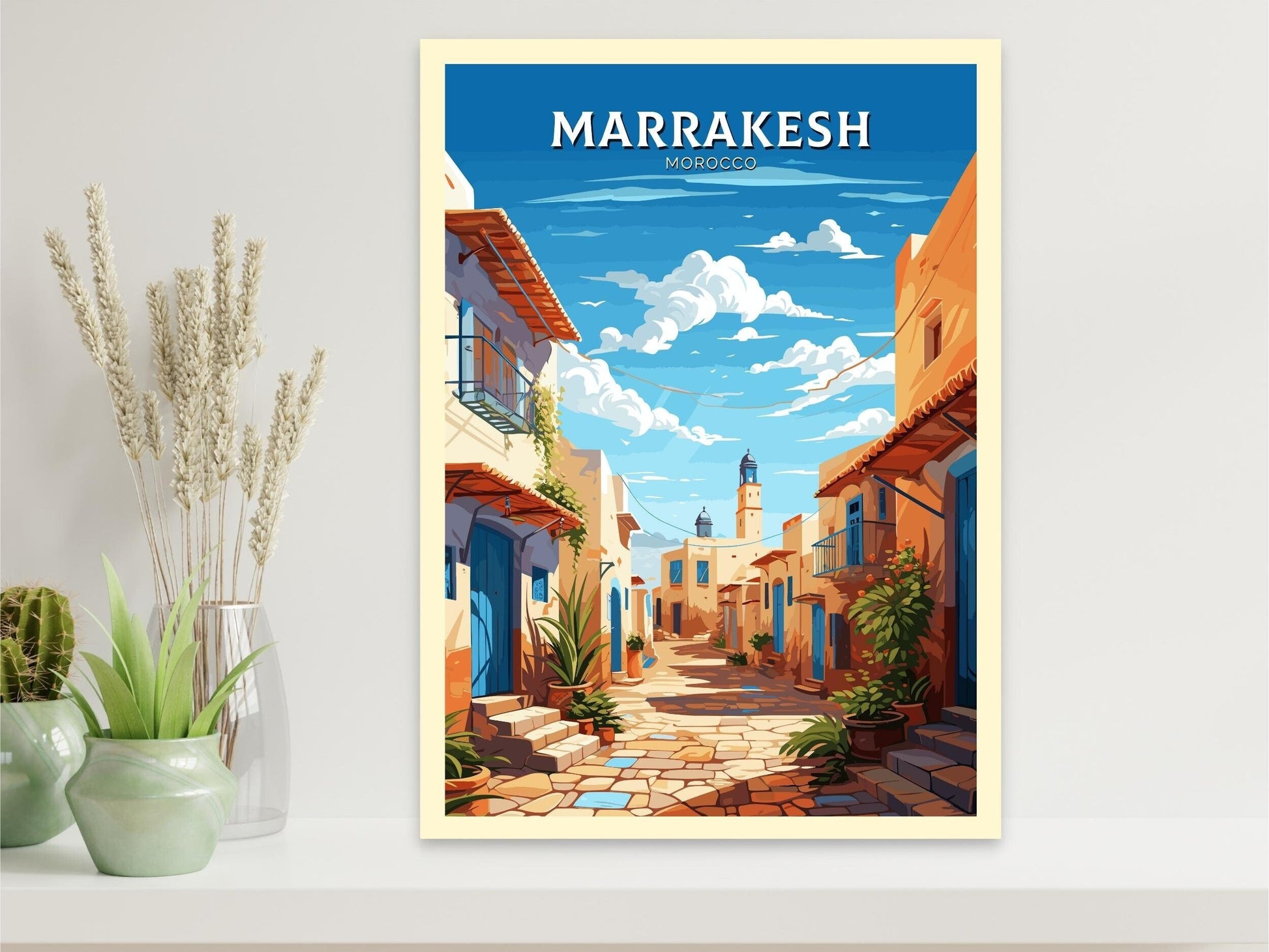 Notre affiche vintage Marrakech – Art des souks marocains plonge votre intérieur dans le cœur animé de Marrakech, au Maroc, grâce à son design nostalgique. Idéale pour les passionnés de voyages et d'art rétro, elle capture l'effervescence des souks et de la place Jemaa el-Fnaa dans un style intemporel. Que vous ayez flâné dans ses ruelles ou rêvé de sa magie, cette affiche vintage Marrakech sera un atout déco exceptionnel.