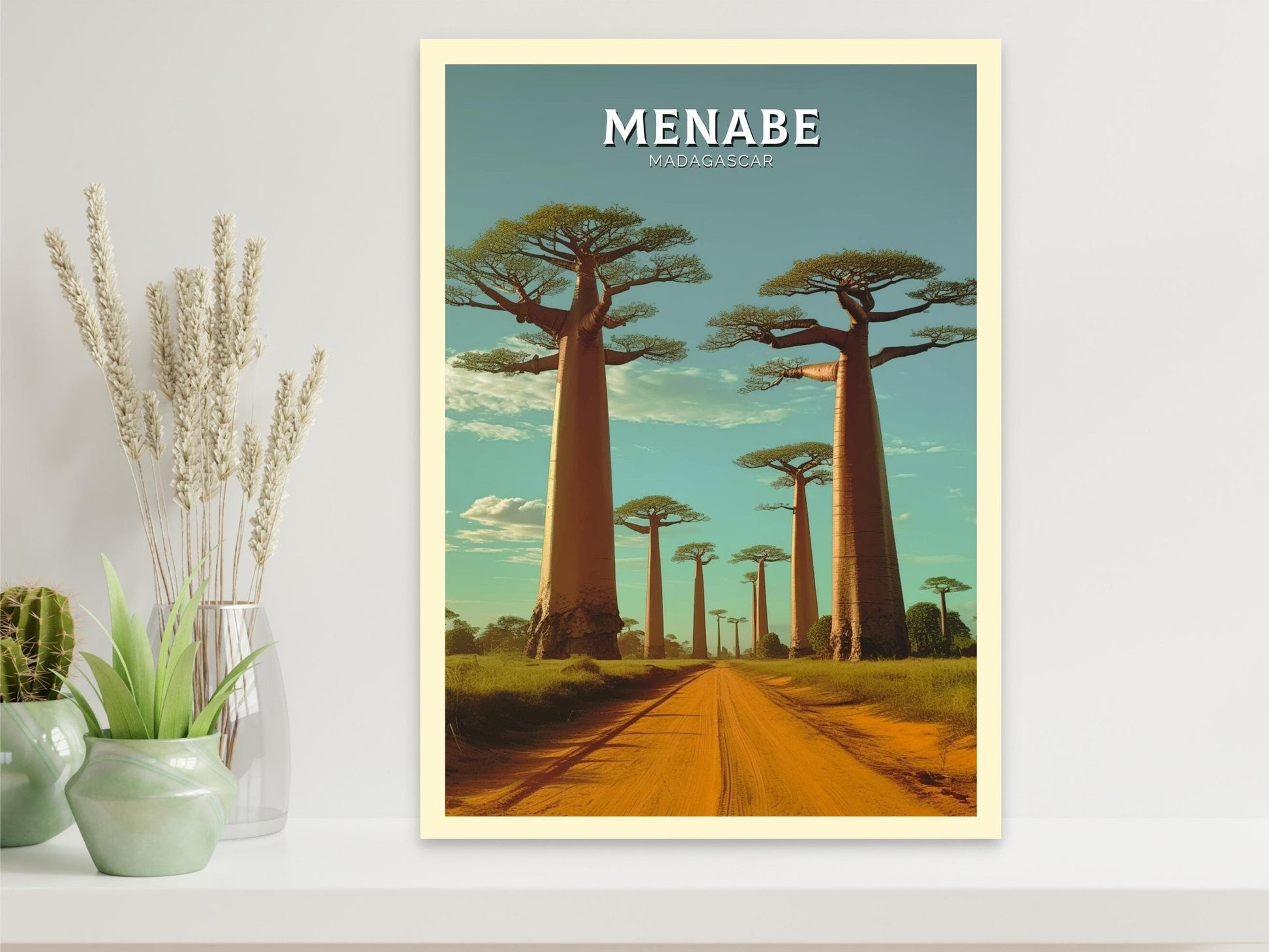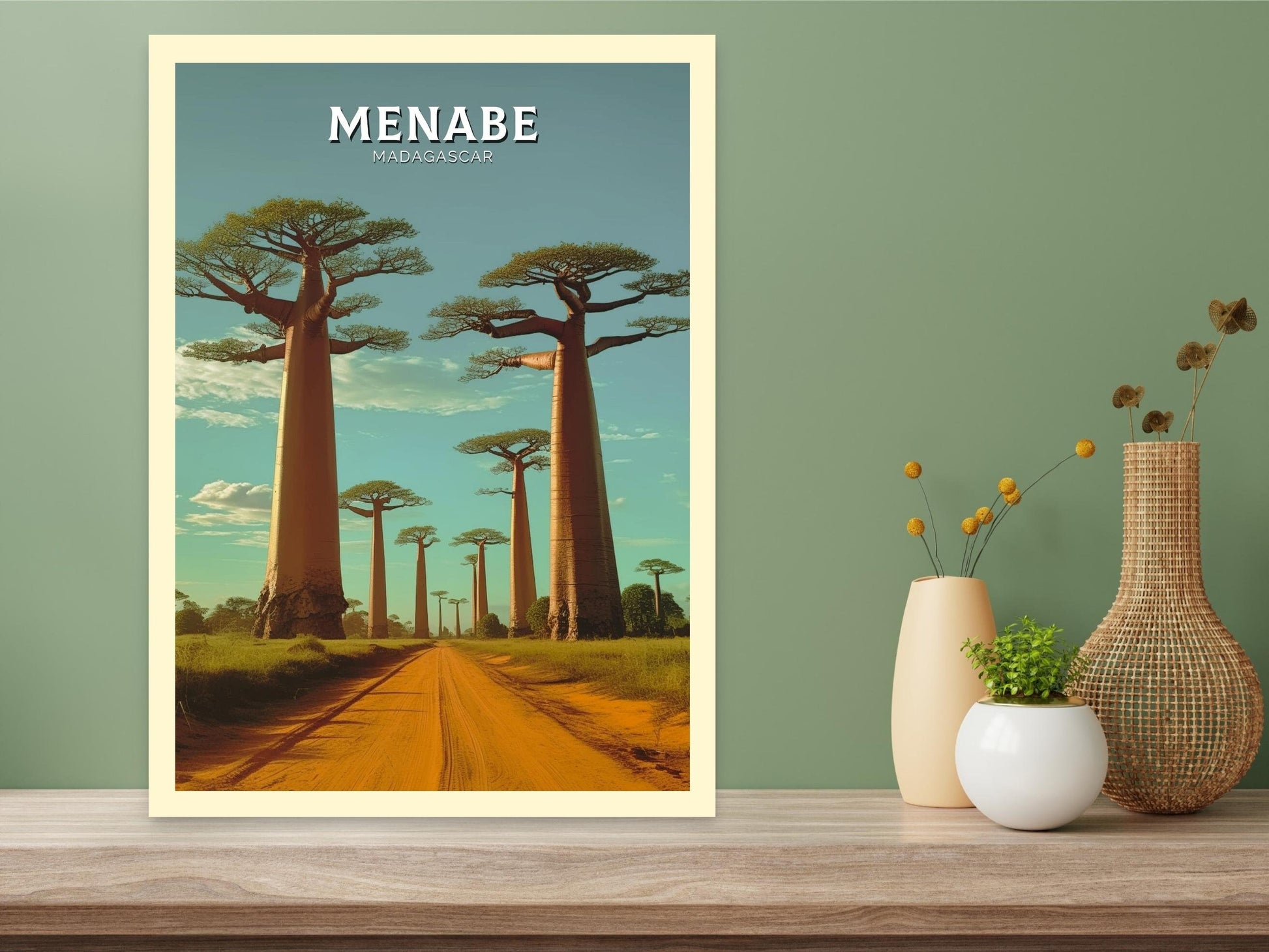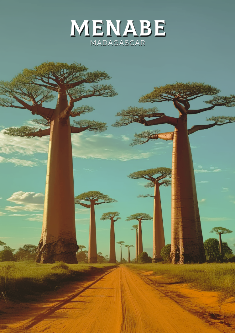 Notre affiche Menabe – œuvre d'art rétro plonge votre espace dans la beauté sauvage de la région de Menabe à Madagascar grâce à son design nostalgique. Idéale pour les passionnés de voyages et les amateurs d'art rétro, elle capture les baobabs emblématiques et les plaines côtières dans un style intemporel. Que vous ayez exploré ses côtes ou rêvé de ses merveilles, cette affiche rétro Menabe sera un ajout magnifique à votre décoration.
