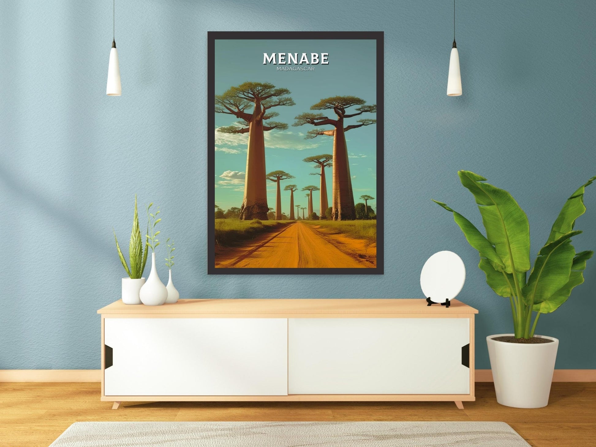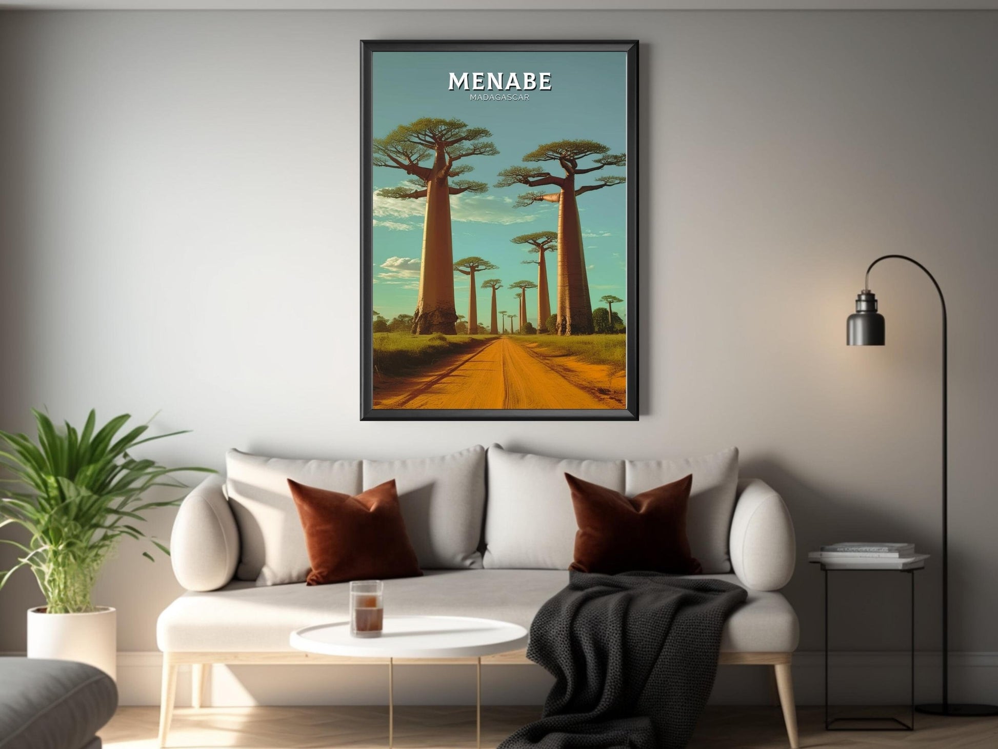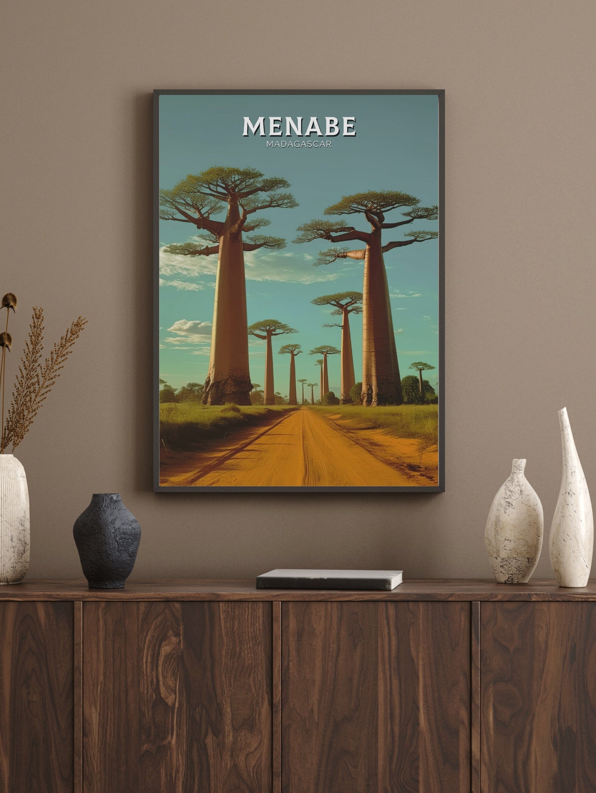 Notre affiche Menabe – œuvre d'art rétro plonge votre espace dans la beauté sauvage de la région de Menabe à Madagascar grâce à son design nostalgique. Idéale pour les passionnés de voyages et les amateurs d'art rétro, elle capture les baobabs emblématiques et les plaines côtières dans un style intemporel. Que vous ayez exploré ses côtes ou rêvé de ses merveilles, cette affiche rétro Menabe sera un ajout magnifique à votre décoration.