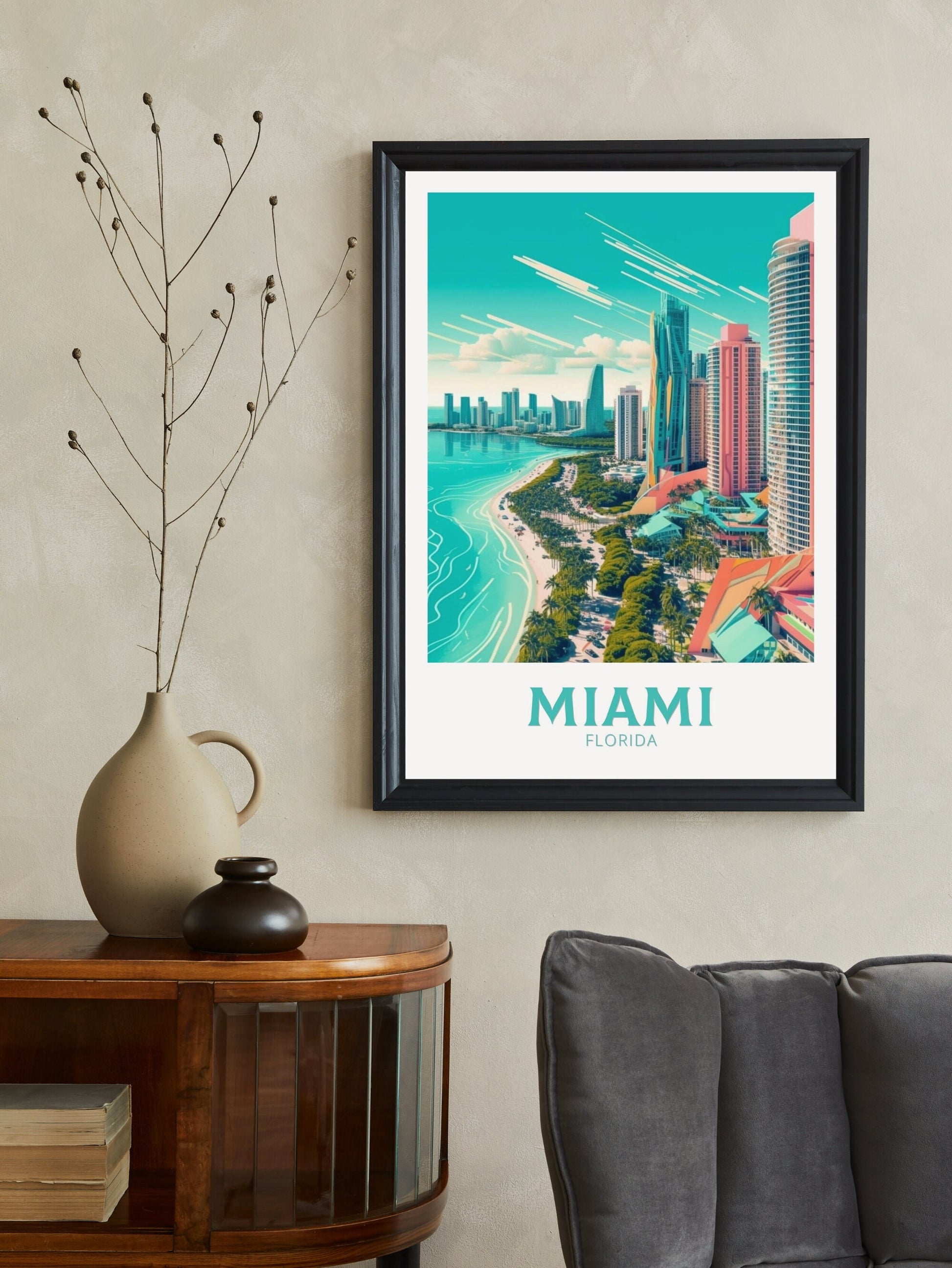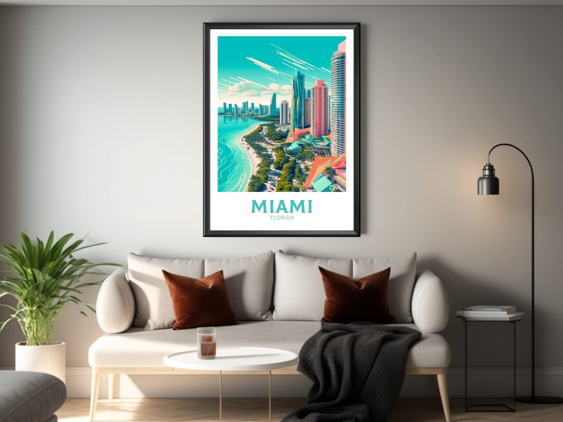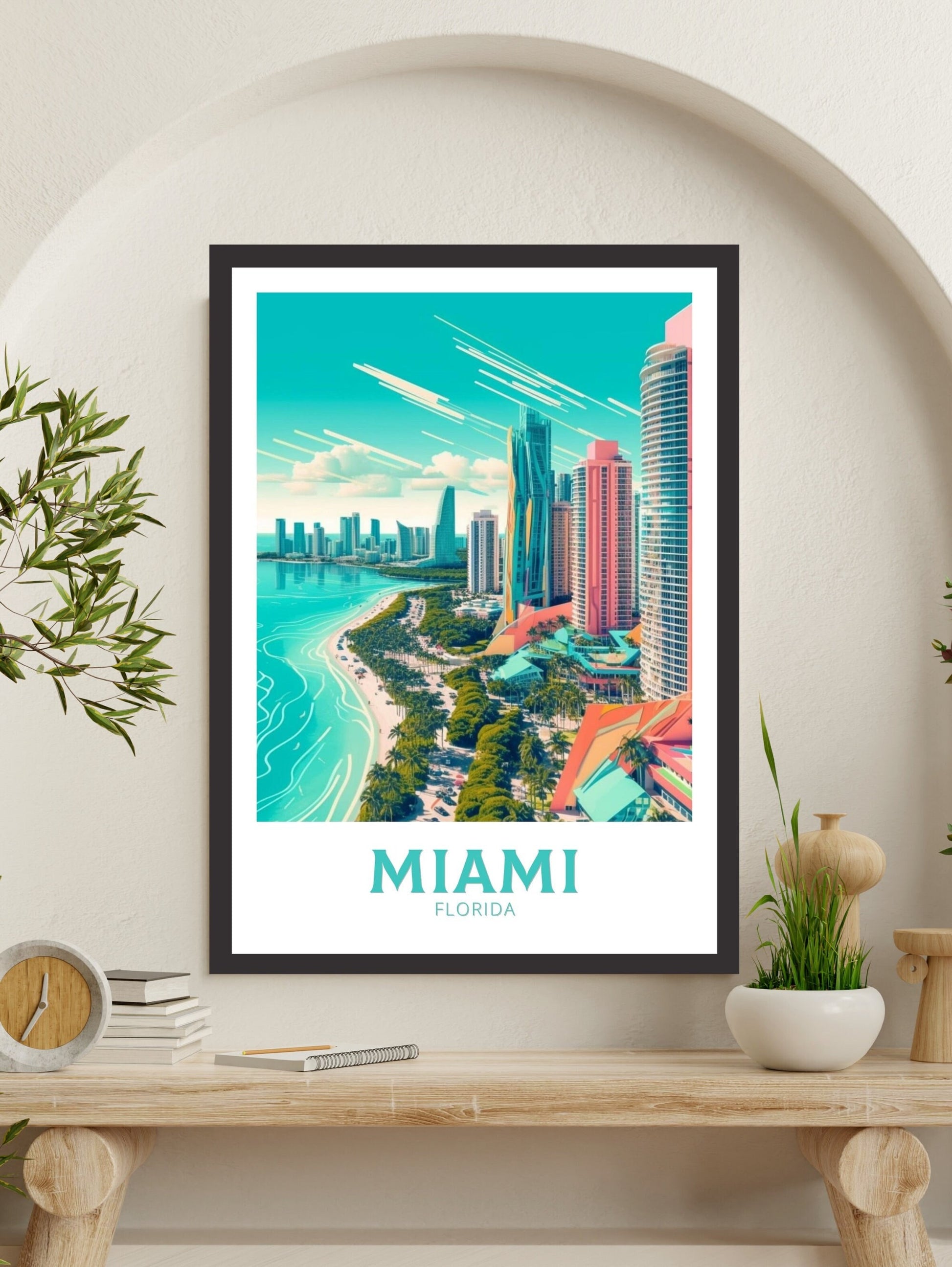 Disponible en téléchargement numérique et en tirage physique premium , cette affiche de voyage de Miami est disponible en plusieurs formats, du format standard de la série A au grand format 76 x 102 cm. Imprimée sur un papier de haute qualité aux couleurs vives et aux détails précis, elle constitue une décoration murale attrayante ou un cadeau attentionné pour tous ceux qui s'inspirent de l'esprit dynamique de Miami.