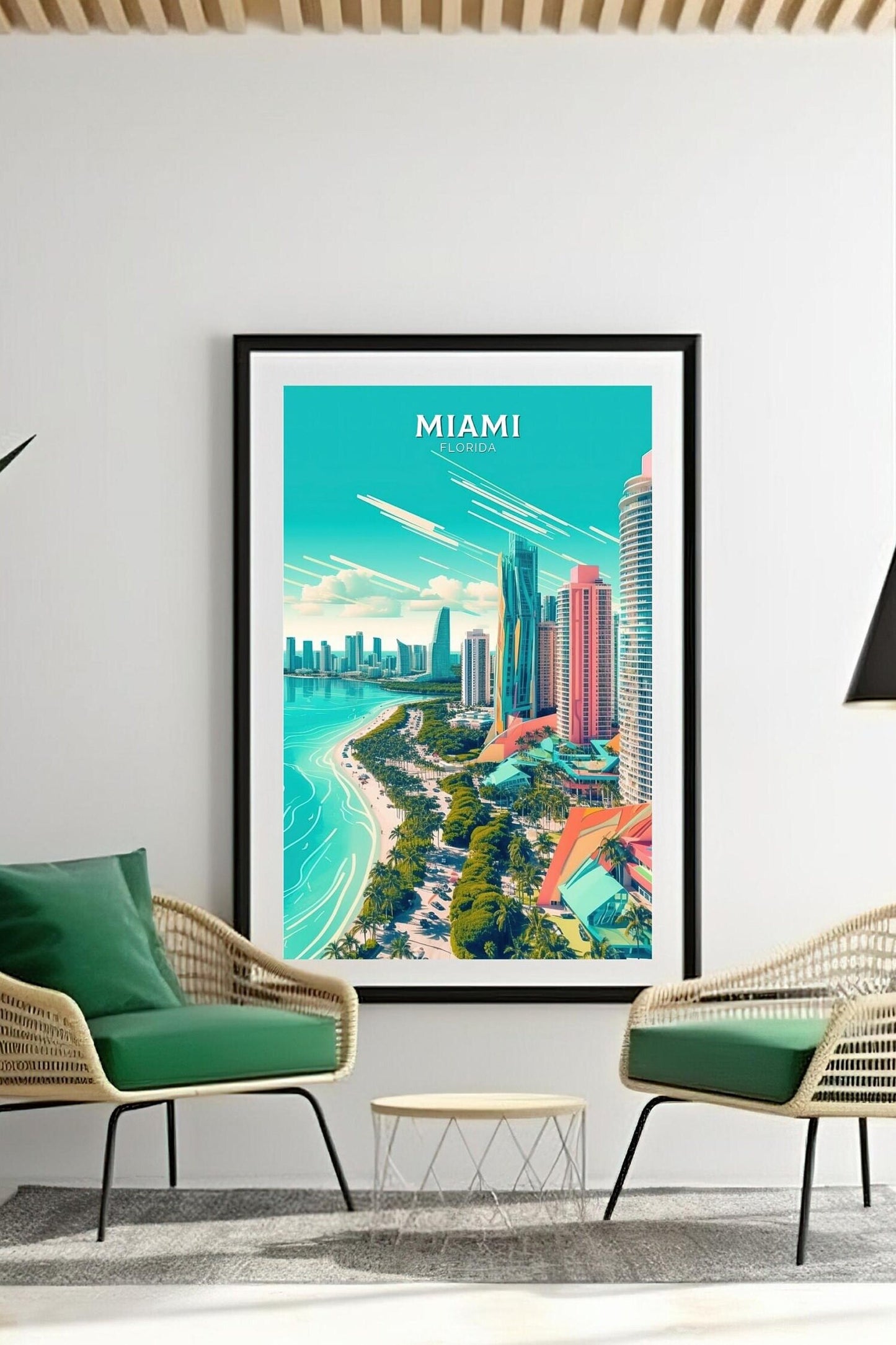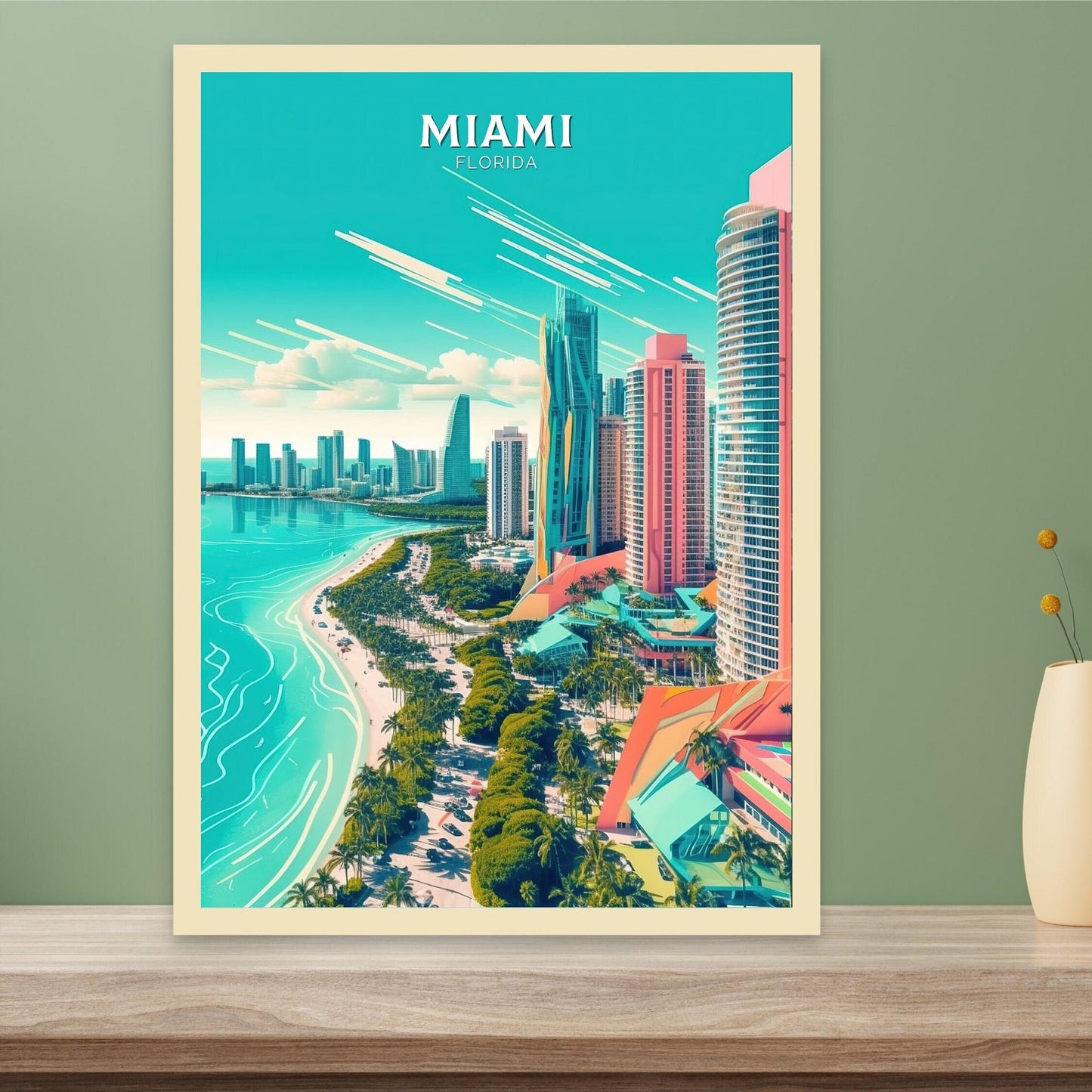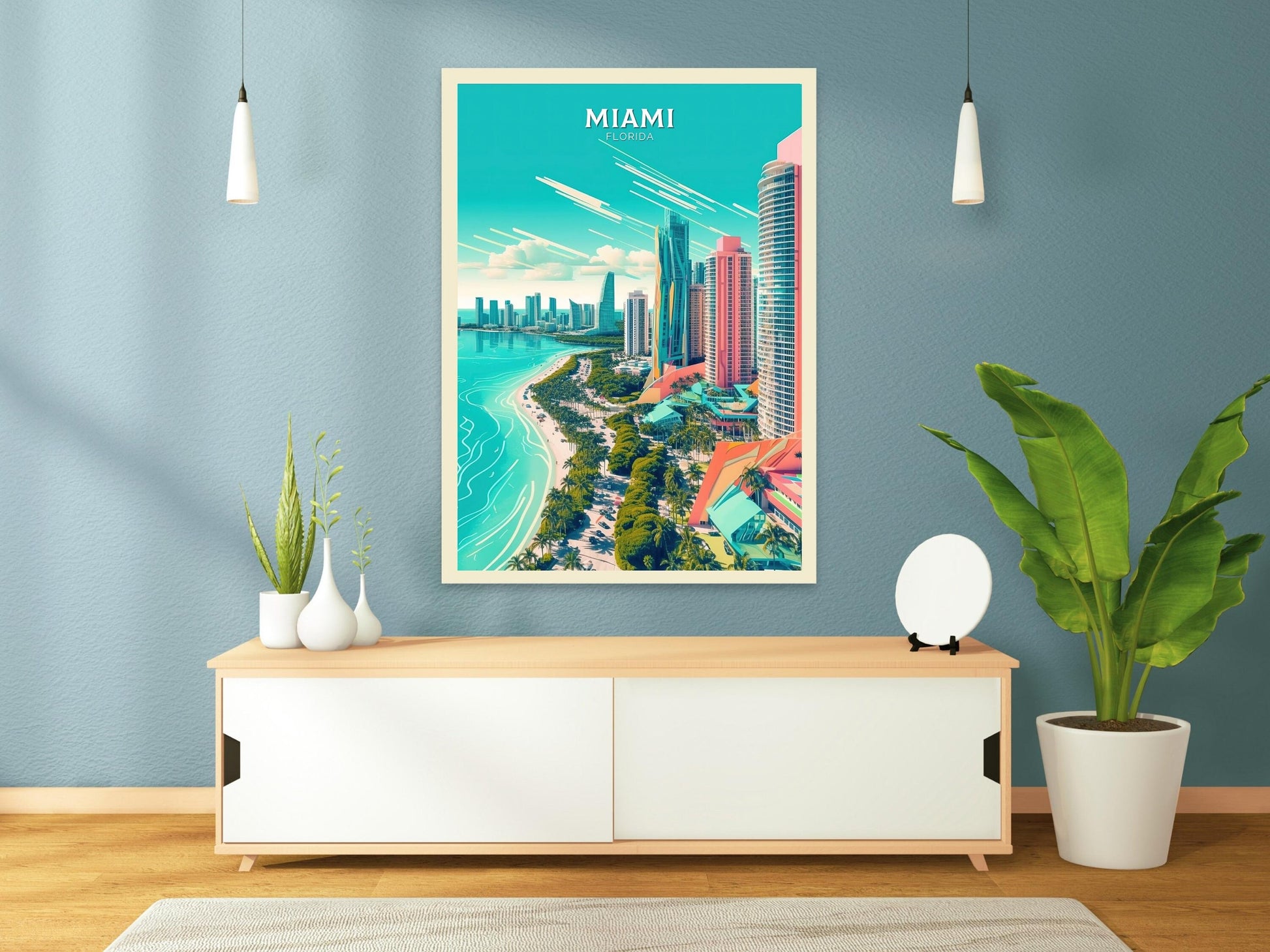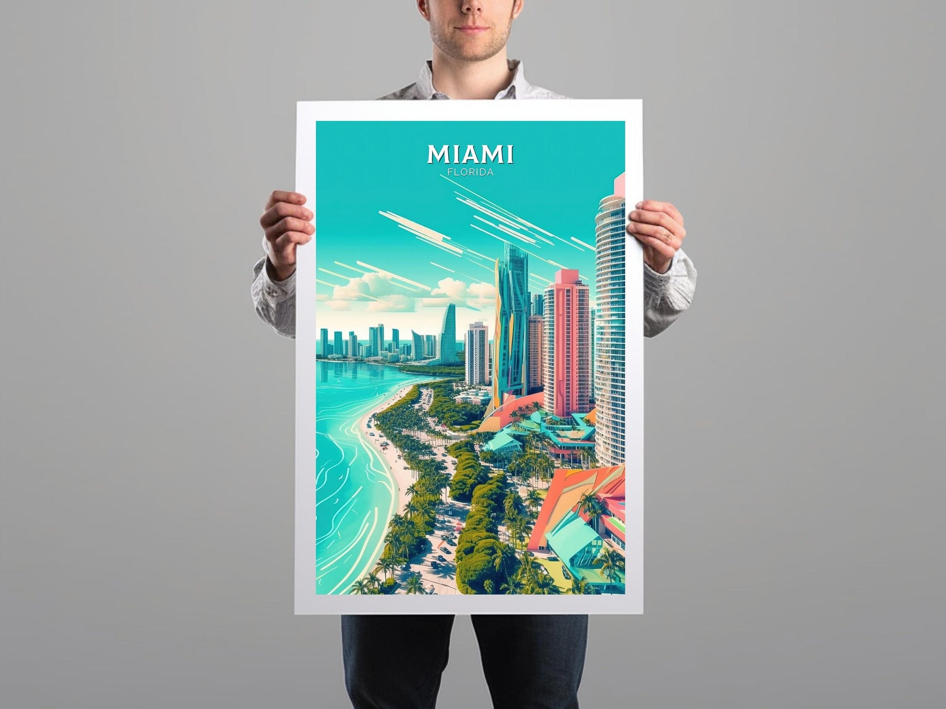 Disponible en téléchargement numérique et en tirage physique premium , cette affiche de voyage de Miami est disponible dans une variété de formats, des formats standard de la série A aux grands formats 76 x 102 cm. Imprimée sur un papier de haute qualité aux couleurs vives et aux détails précis, elle constitue une superbe décoration murale ou un cadeau attentionné pour tous ceux qui sont inspirés par l'atmosphère animée de Miami.