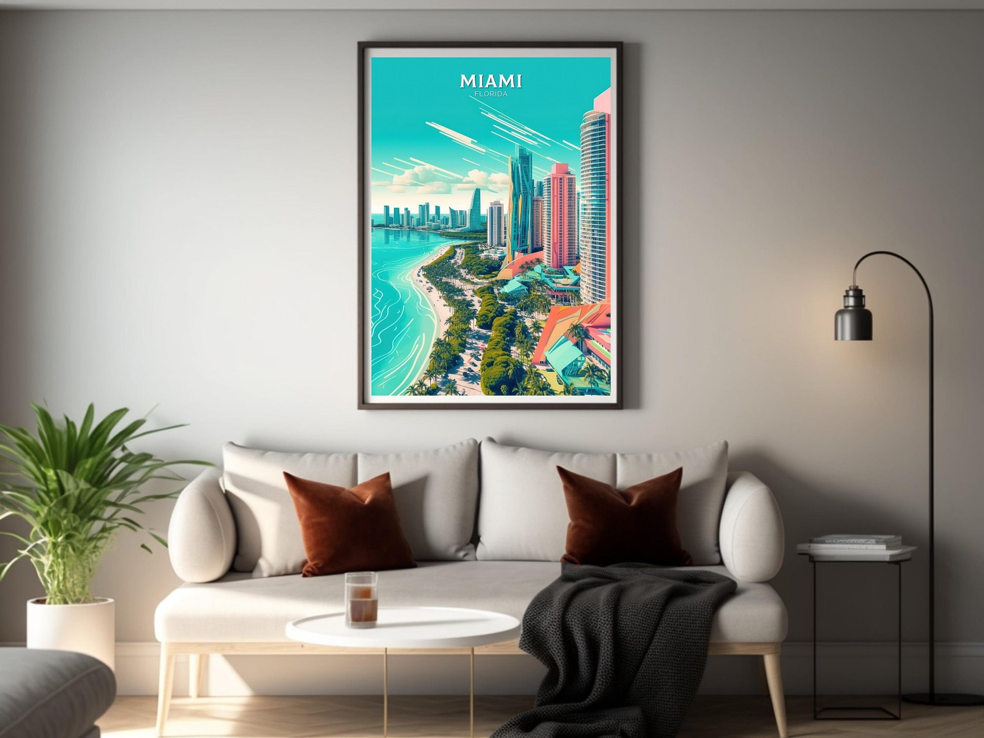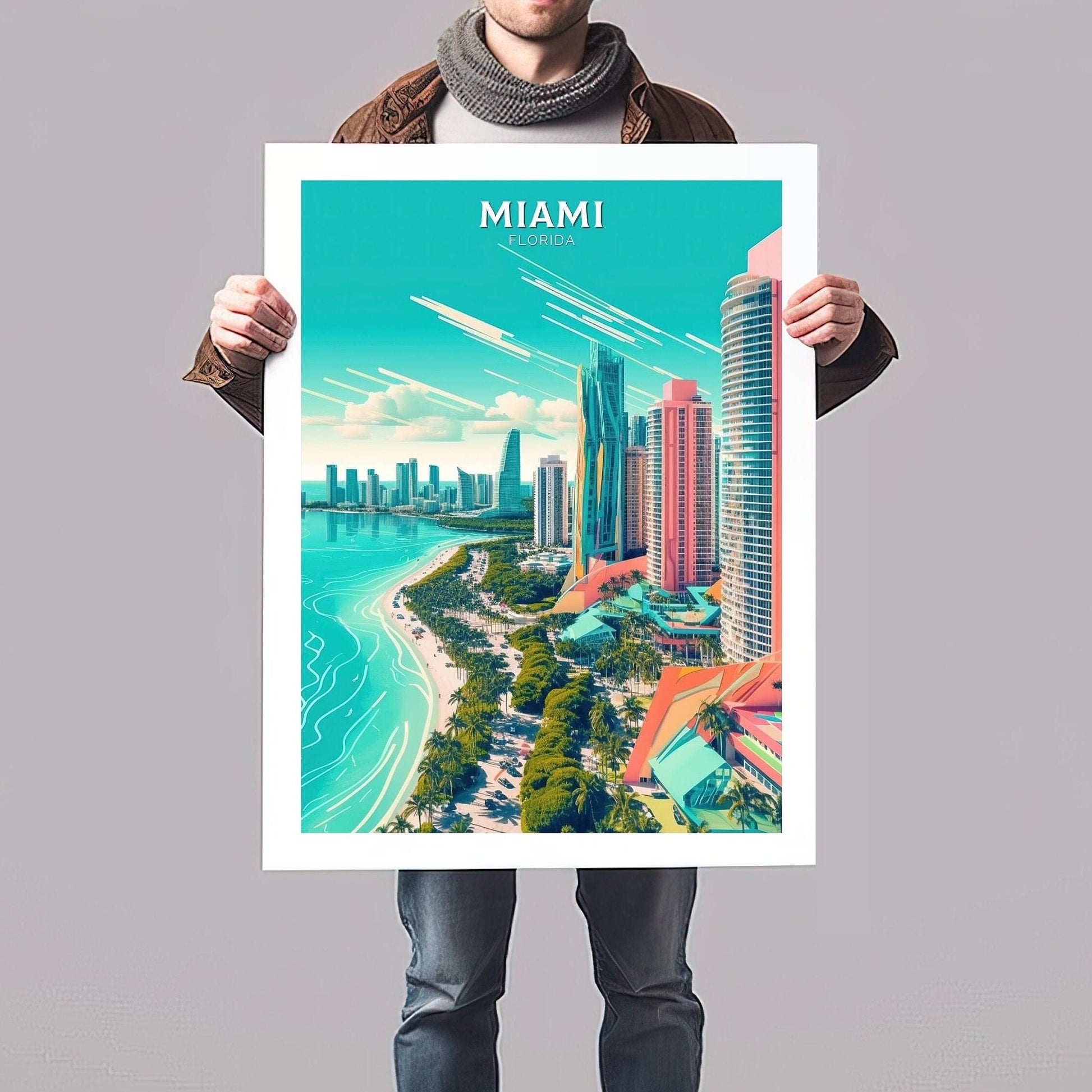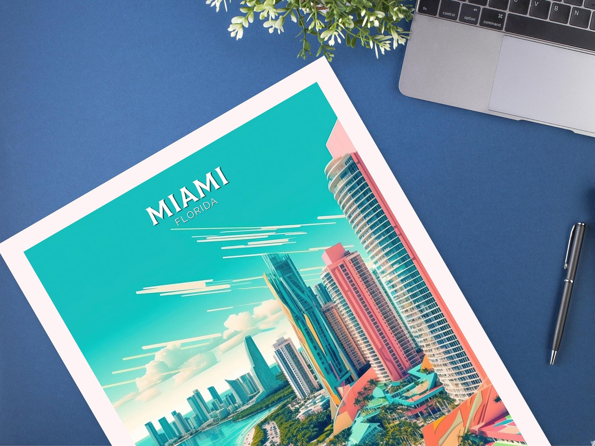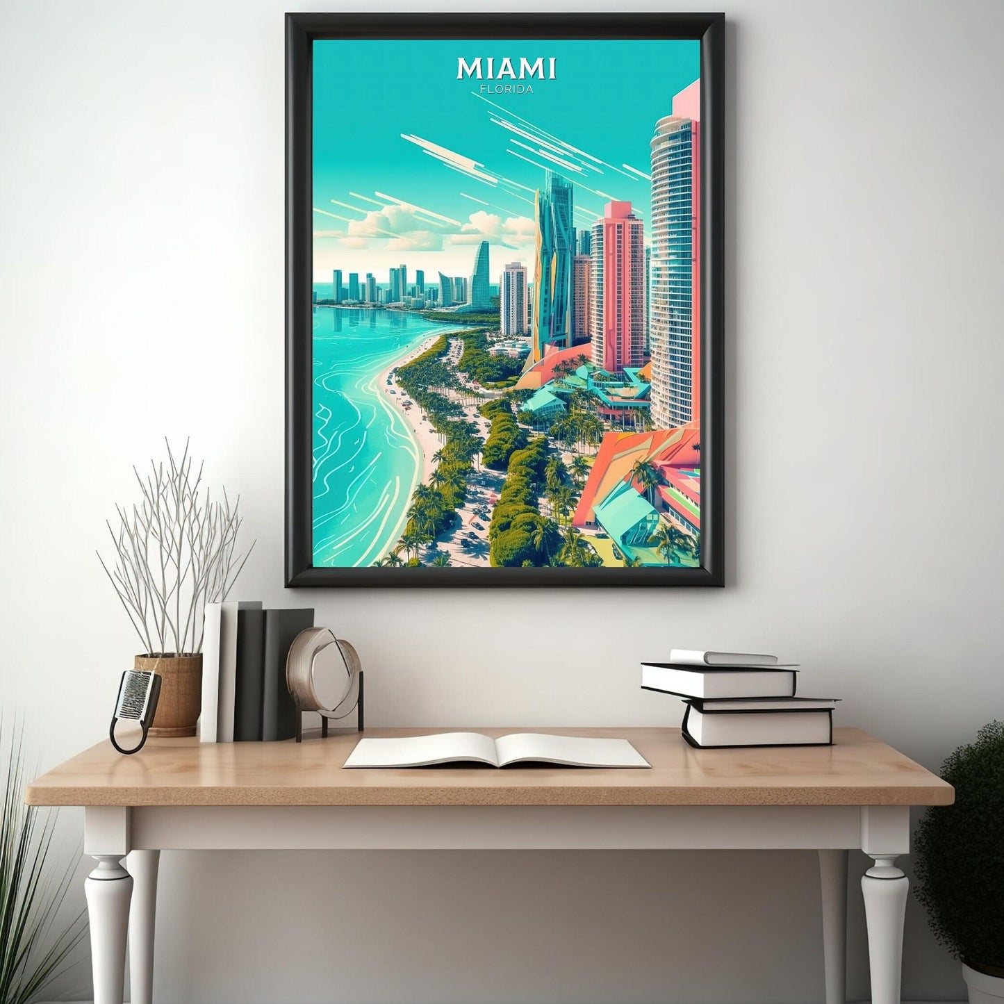 Disponible en téléchargement numérique et en tirage physique premium , cette affiche de voyage de Miami est disponible dans une variété de formats, des formats standard de la série A aux grands formats 76 x 102 cm. Imprimée sur un papier de haute qualité aux couleurs vives et aux détails précis, elle constitue une superbe décoration murale ou un cadeau attentionné pour tous ceux qui sont inspirés par l'atmosphère animée de Miami.